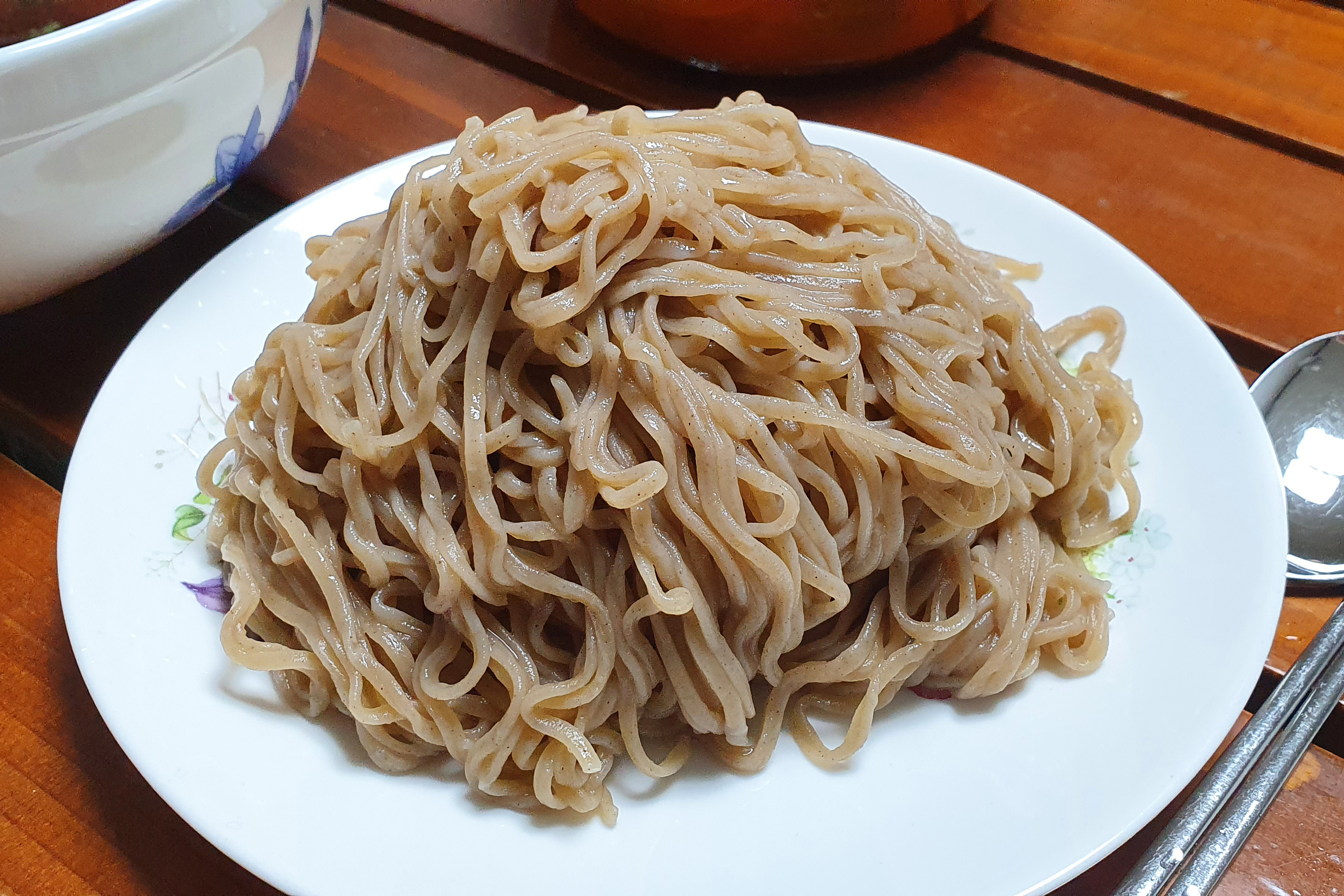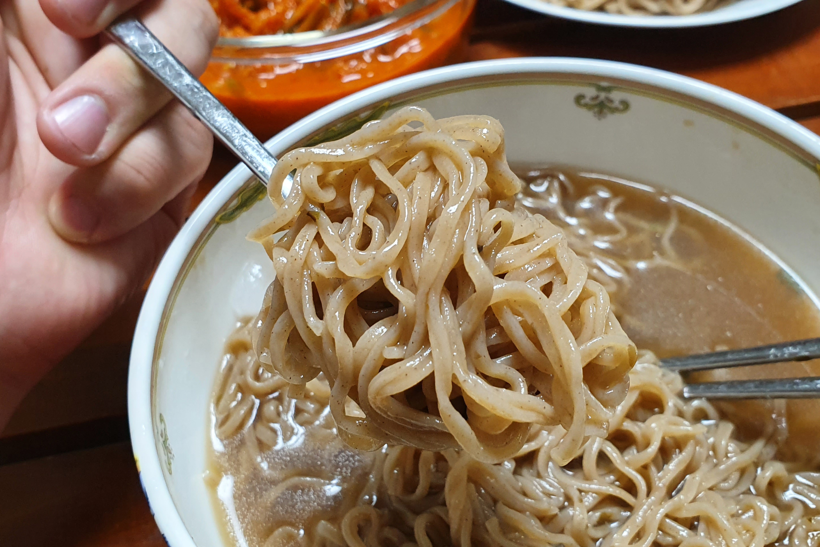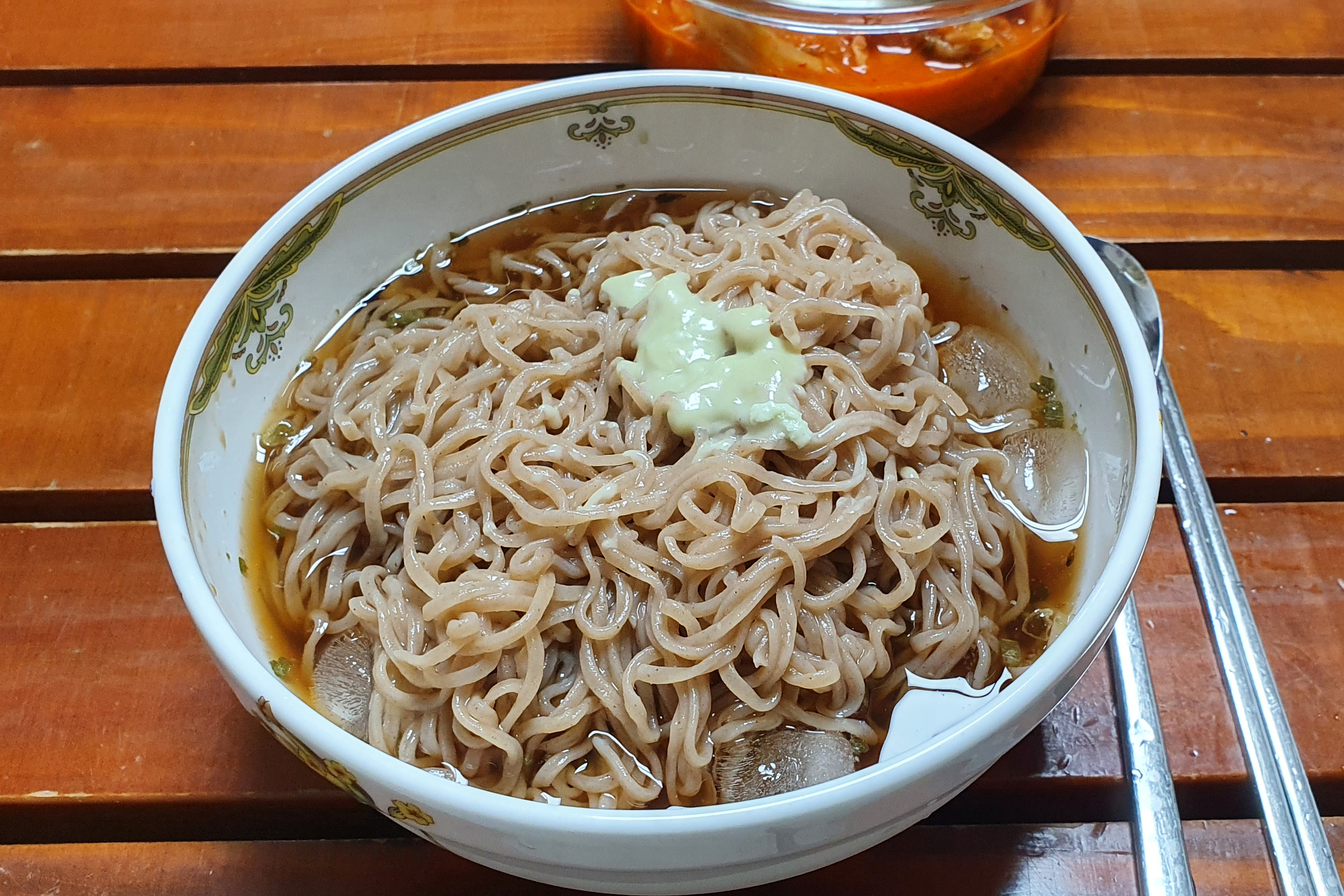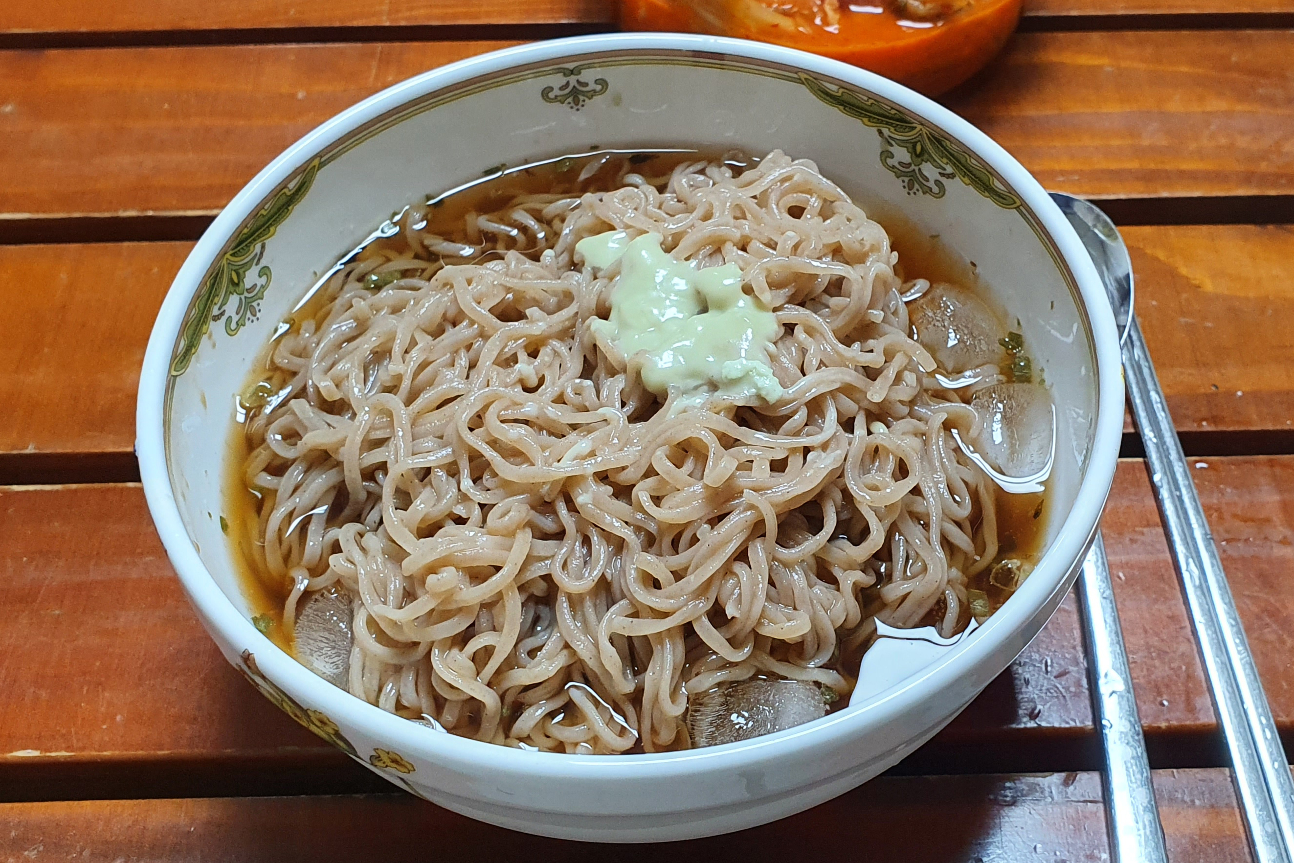 -메밀면 삶기 : 끓는 물 600ml에 면을 넣고 4분 30초 더 끓인 후 냉수에 충분히 헹구어 차게 만든 후 물기를 빼주세요.