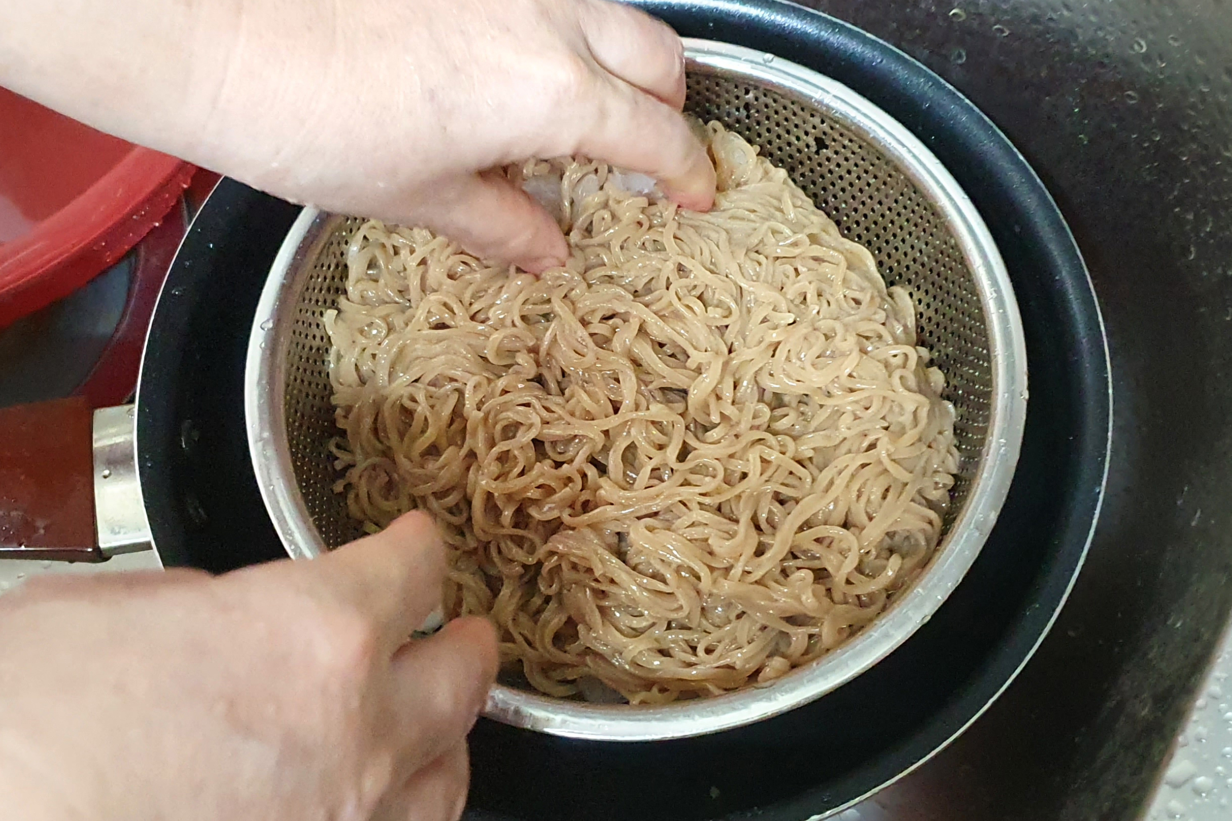 -면 만들기 : 끓는 물 600ml에 면을 넣고 4분 30초 더 끓입니다. 끓인 면을 냉수에 충분히 헹구어 차게 만든 후 물기를 빼고 채반 위에 올려놓습니다.