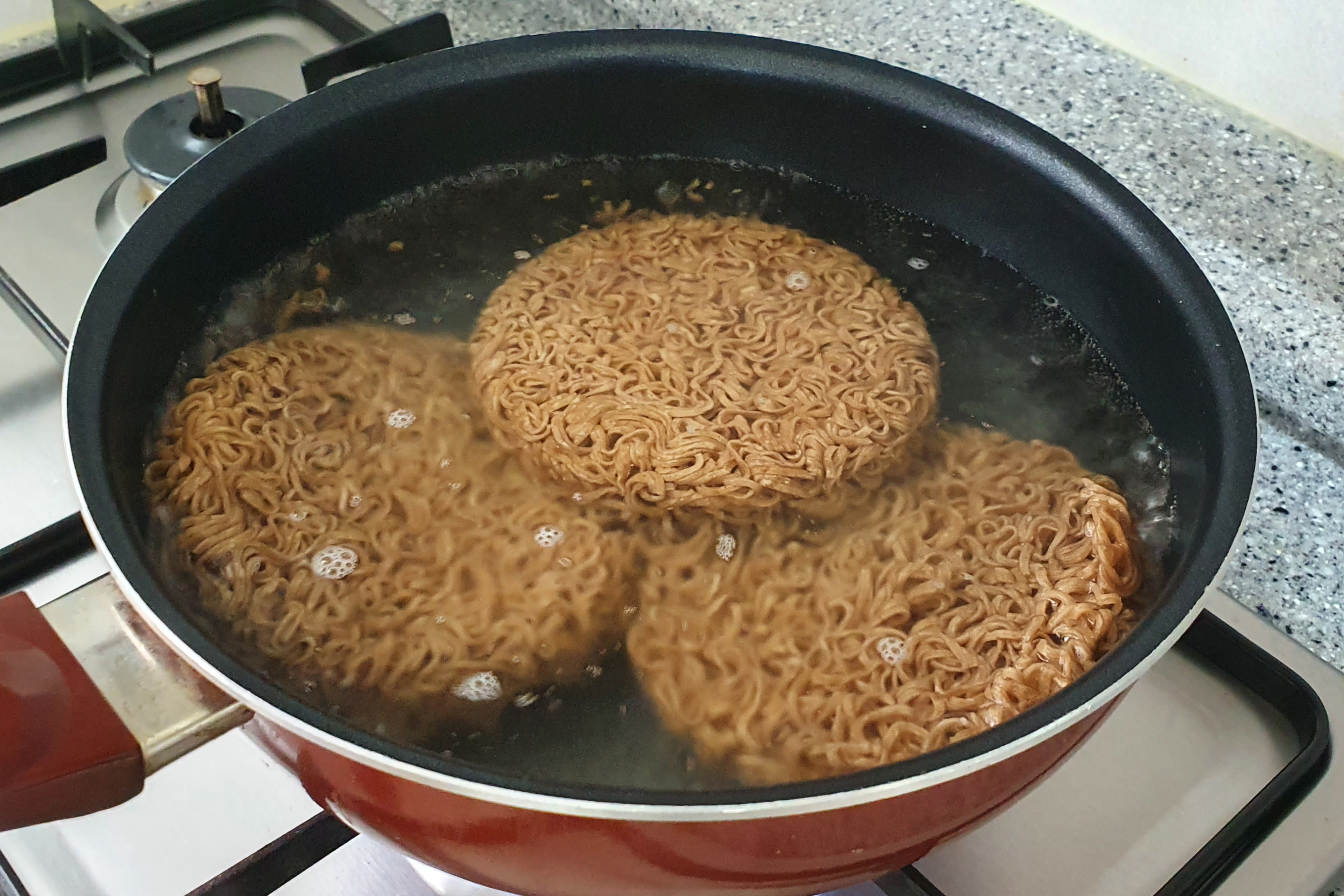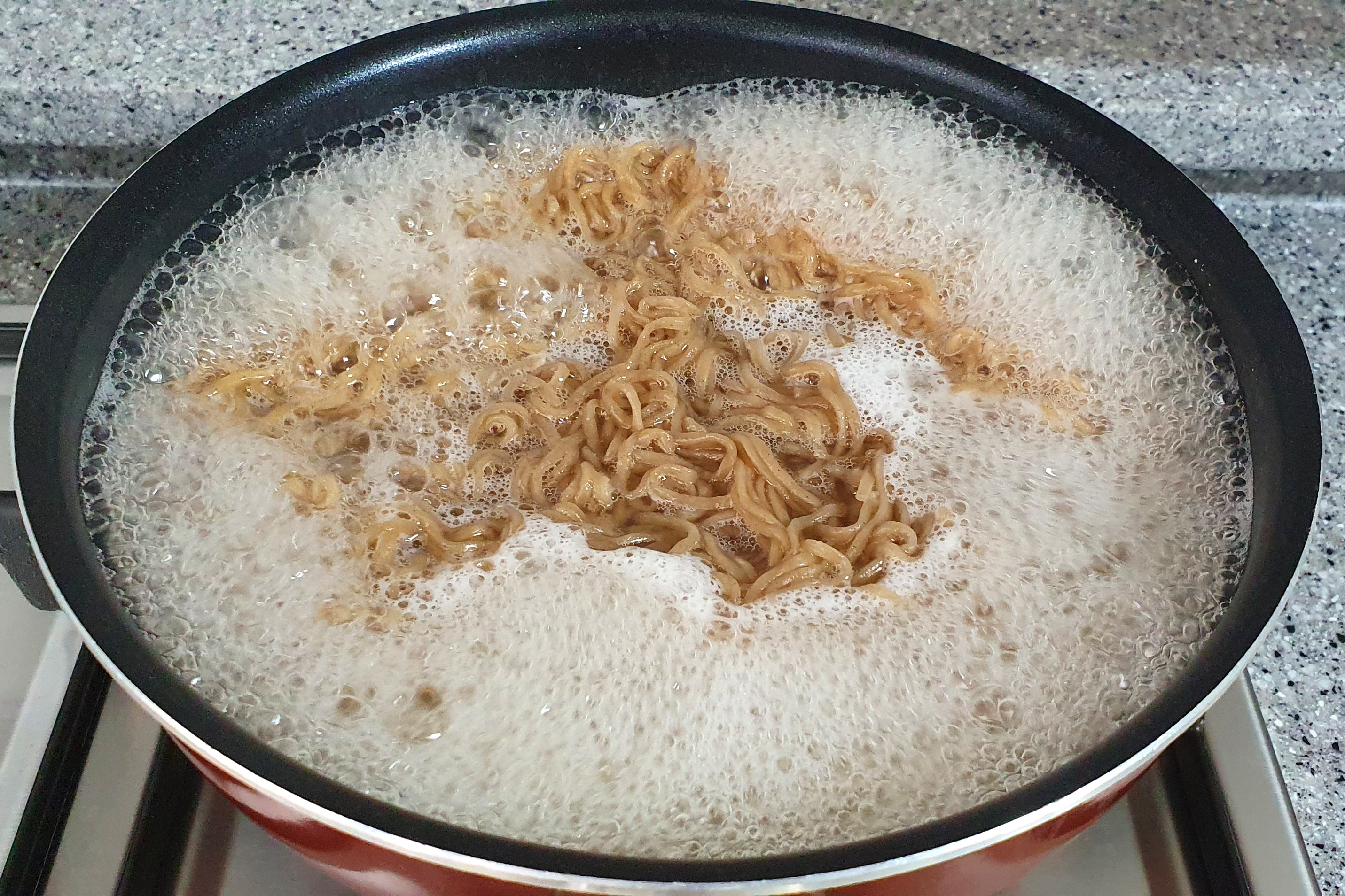 농심 라면 시원한 메밀소바 라면의 면을 끓는 물어 넣었고, 4분 30초 더 끓였습니다.