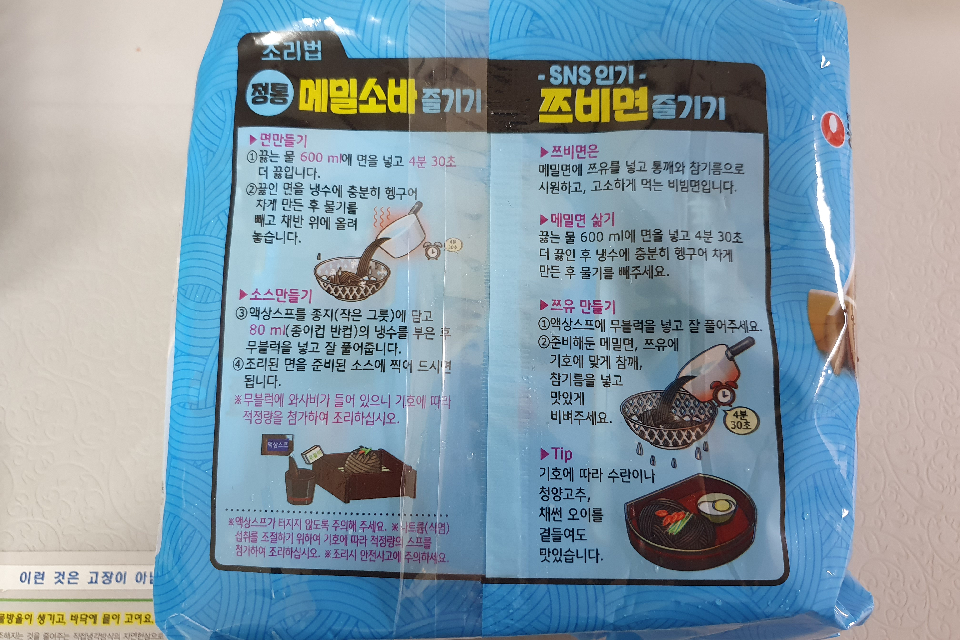 시원한 메밀소바 라면의 관련 정보가 있는 면 반대편에는 조리법이 2가지로 나눠서 쉽게 따라 할 수 있게 나와있었습니다. 개인적으로는 국물이 있는 메밀소바가 먹고 싶어 정통 메밀소바 즐기기를 참고하여 조리했습니다.