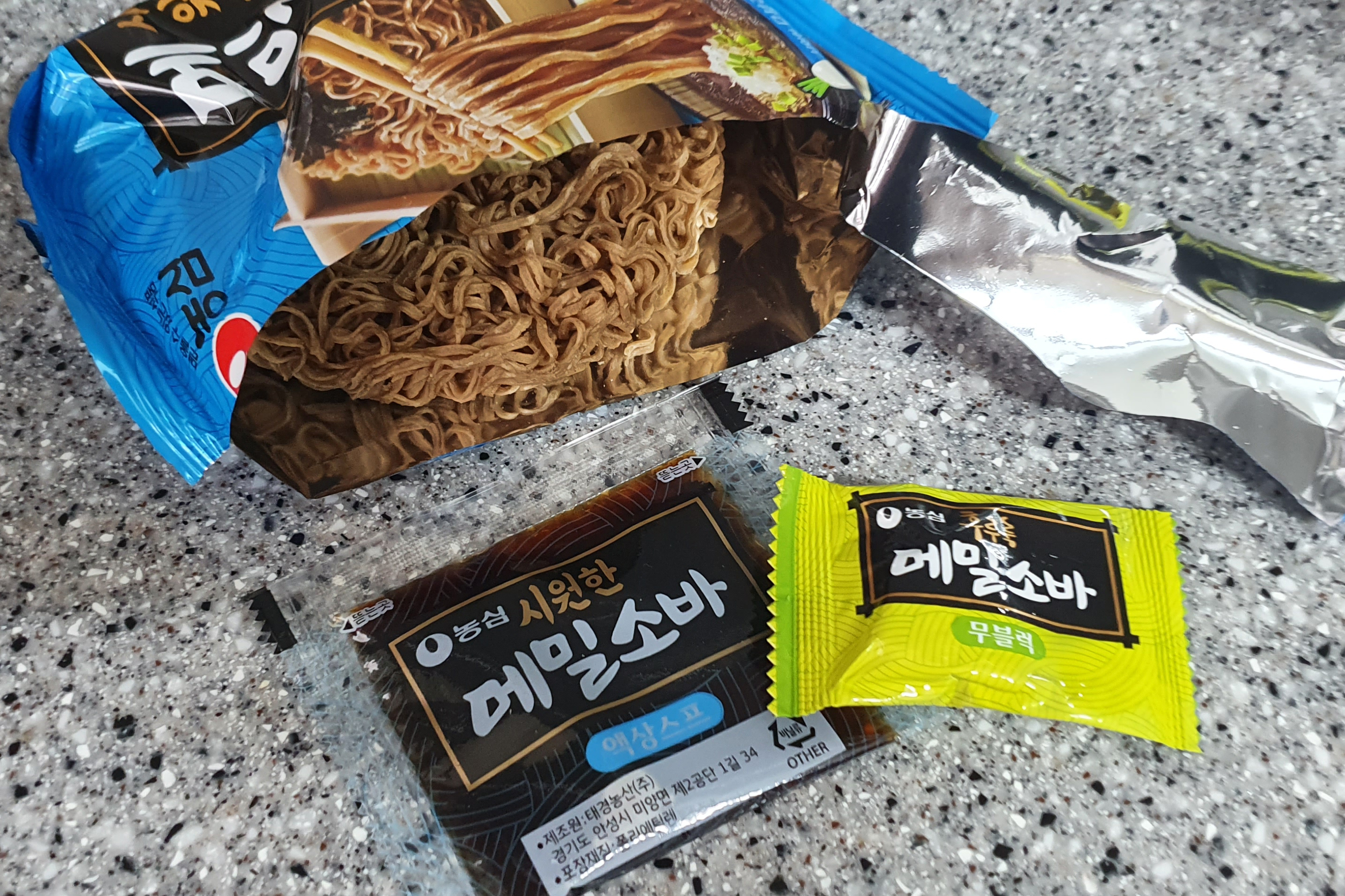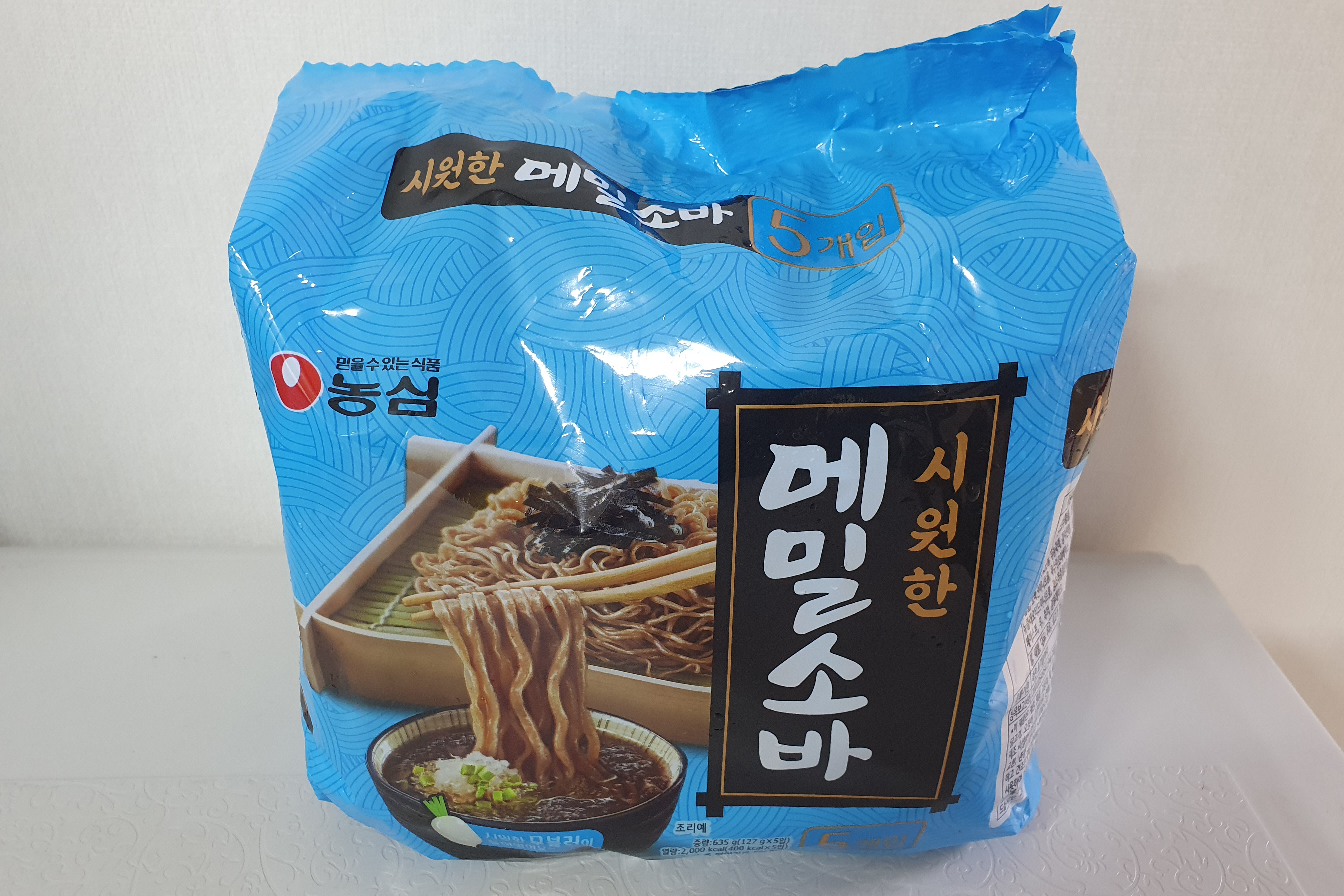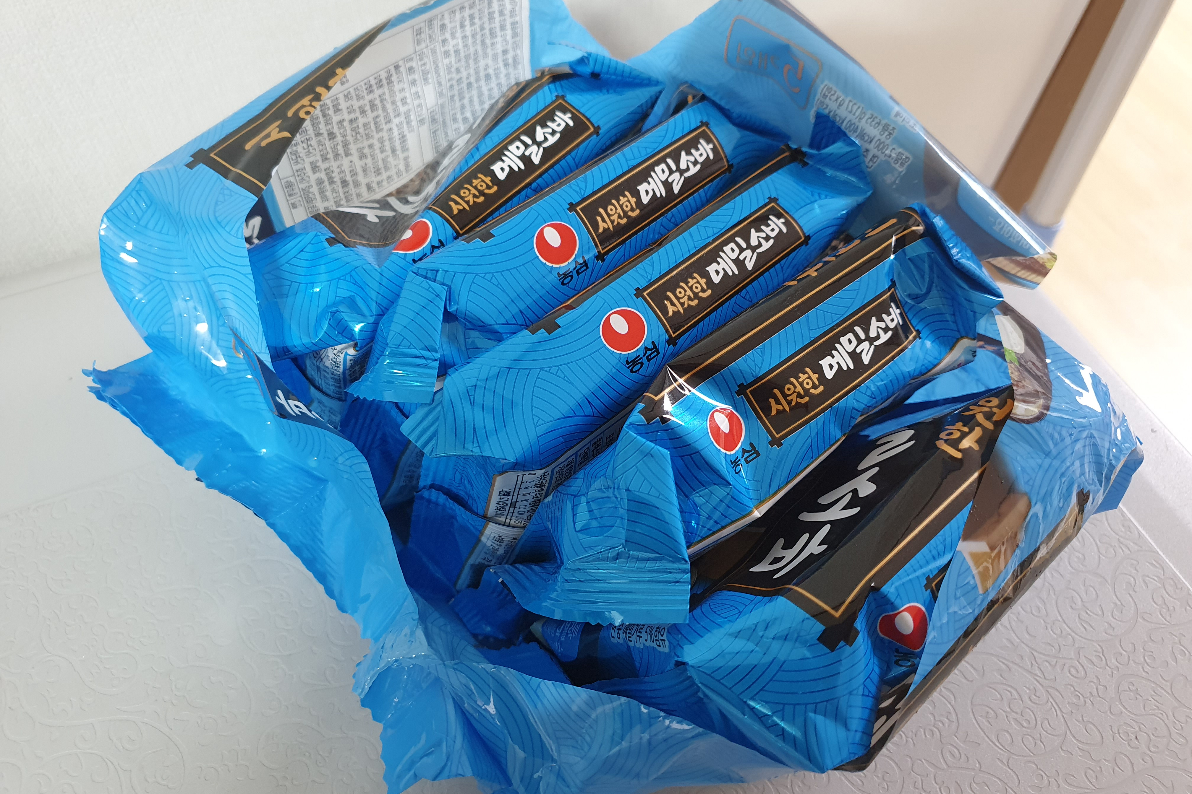 농심 라면 시원한 메밀소바 5개입 비늘 포장을 뜯습니다.