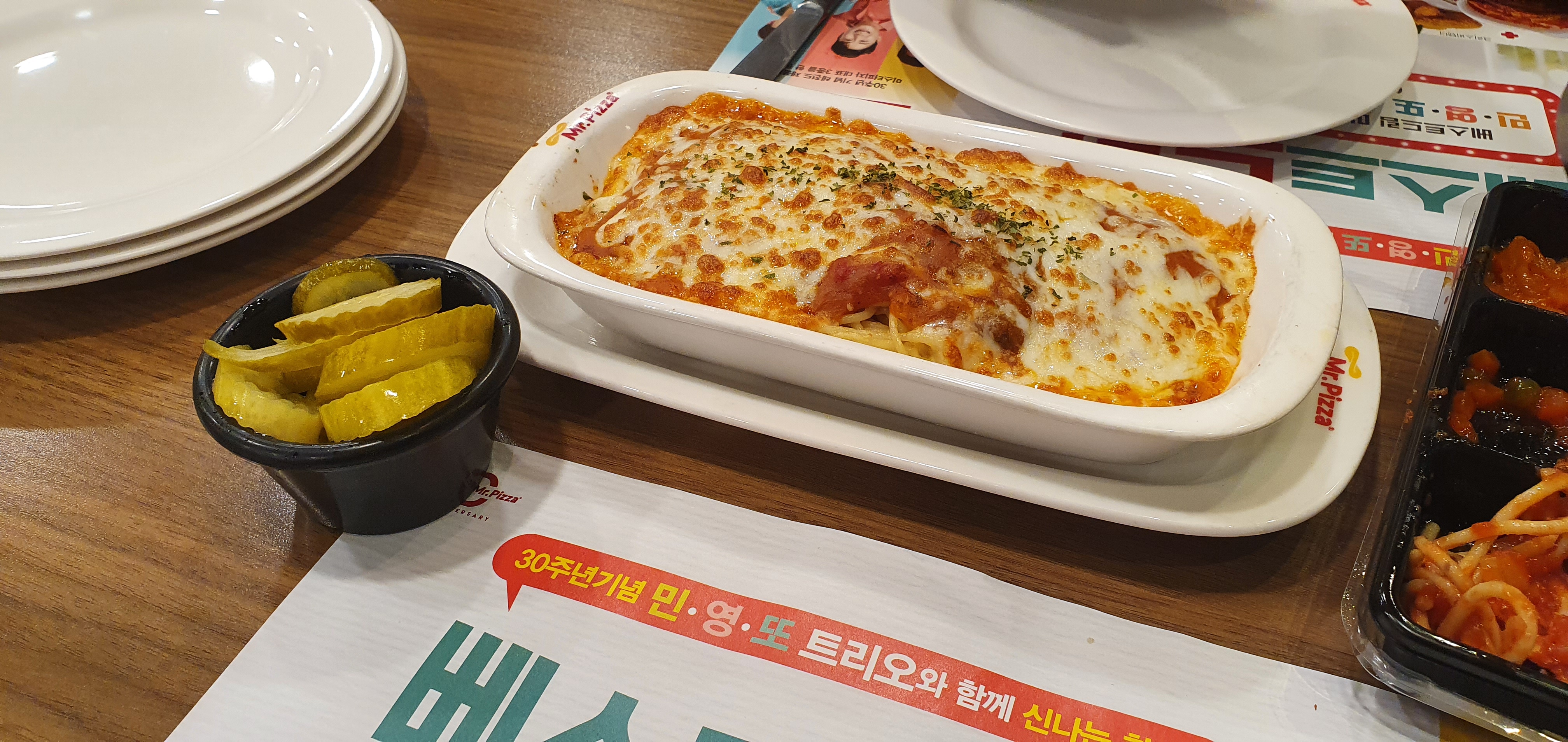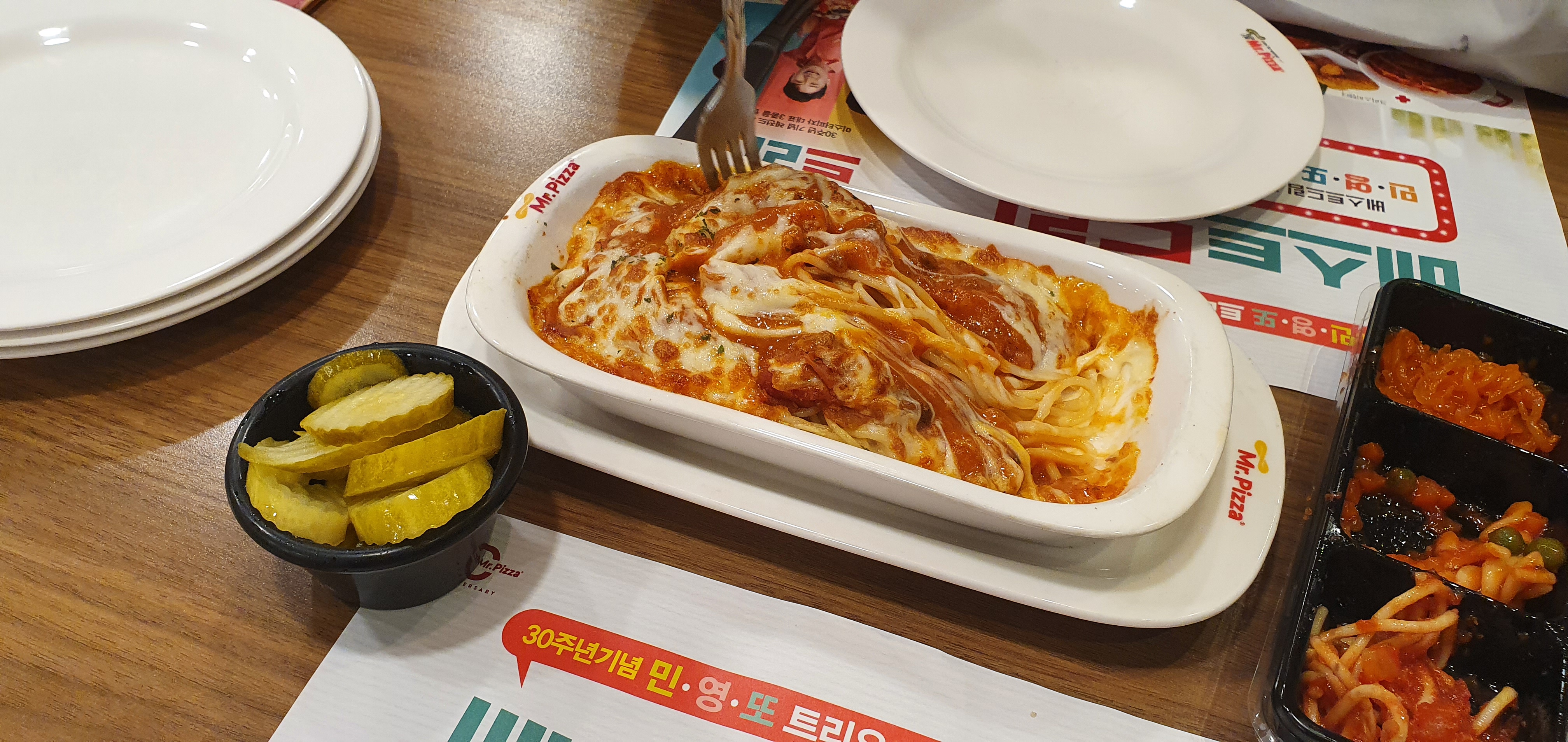 개봉역 개봉사거리 맛집 미스터피자에서 홈샐러드, 콜라, 블루레몬에이드를 이어서 나온 메뉴는 오븐미트스파게티였습니다. 치즈가 노릇노릇 익어서 나왔는데 향도 좋고 비주얼도 너무 좋네요. 개인적으로 뒤적거려 섞어 먹지는 않지만 친구가 섞어 먹어야 한다고 해서 그러라고 했습니다.