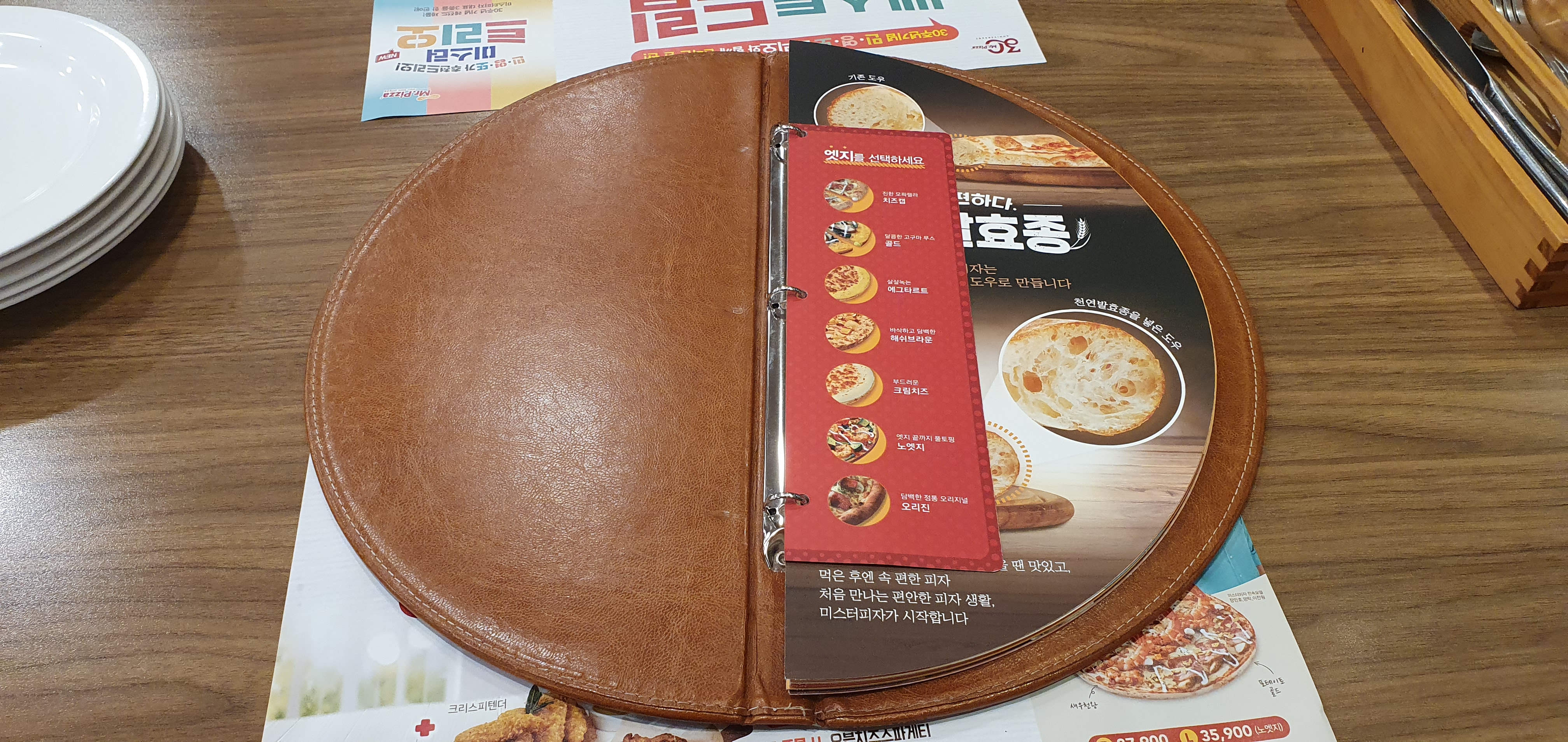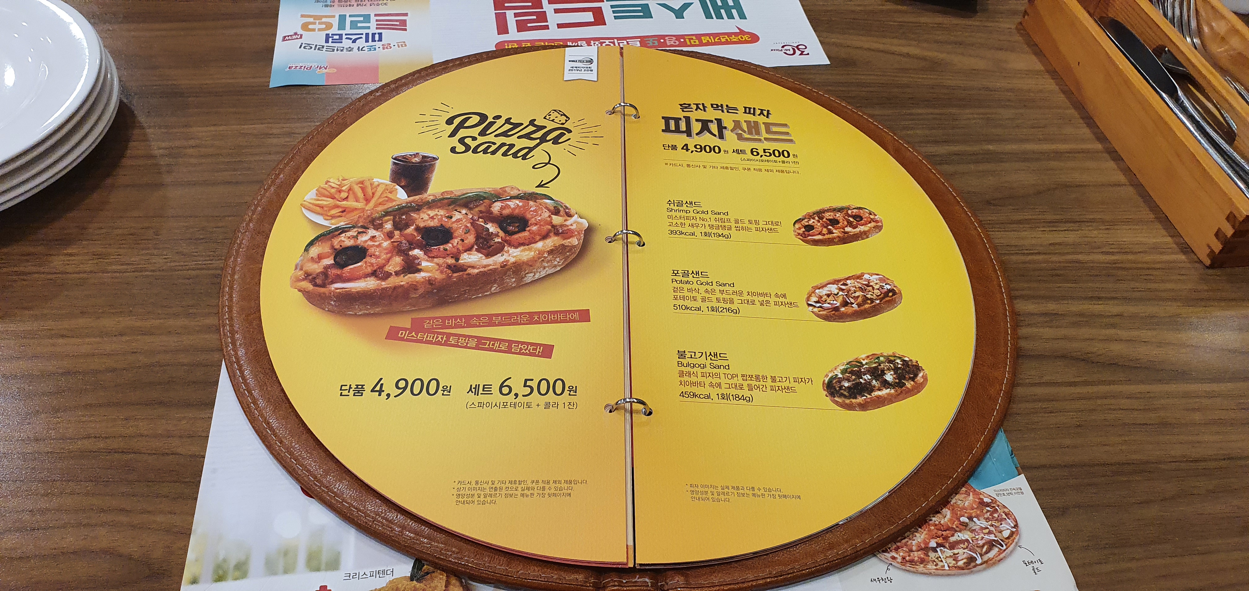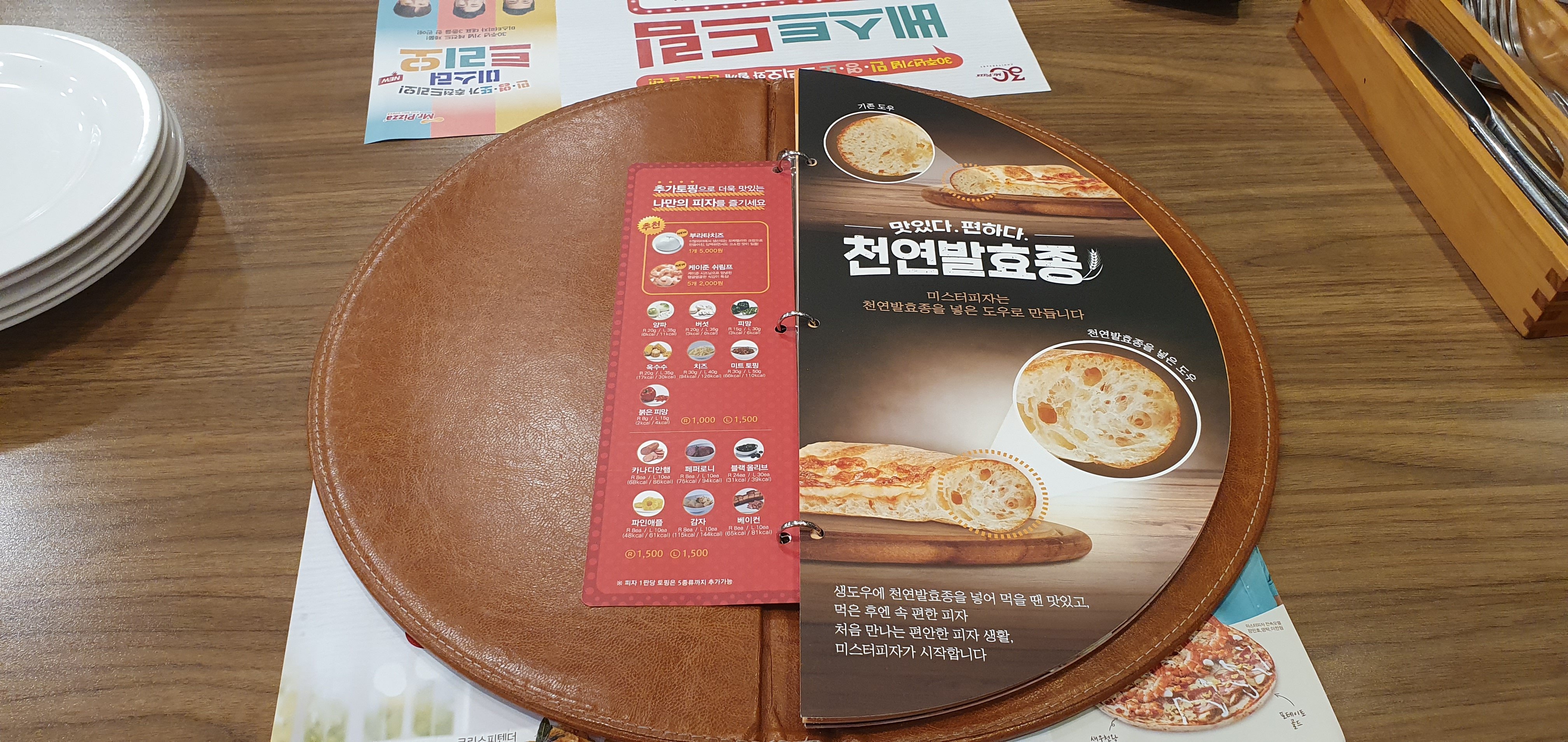 개봉역 개봉사거리 맛집 미스터피자에 들어가 자리를 잡고 앉아 메뉴판을 살펴보았습니다. 아래 사진은 미스터피자의 메뉴판들을 한 장씩 찍은 것입니다. 동그란 피자 모양으로 된 메뉴판이었습니다. 자세한 내용은 사진을 참고하세요~