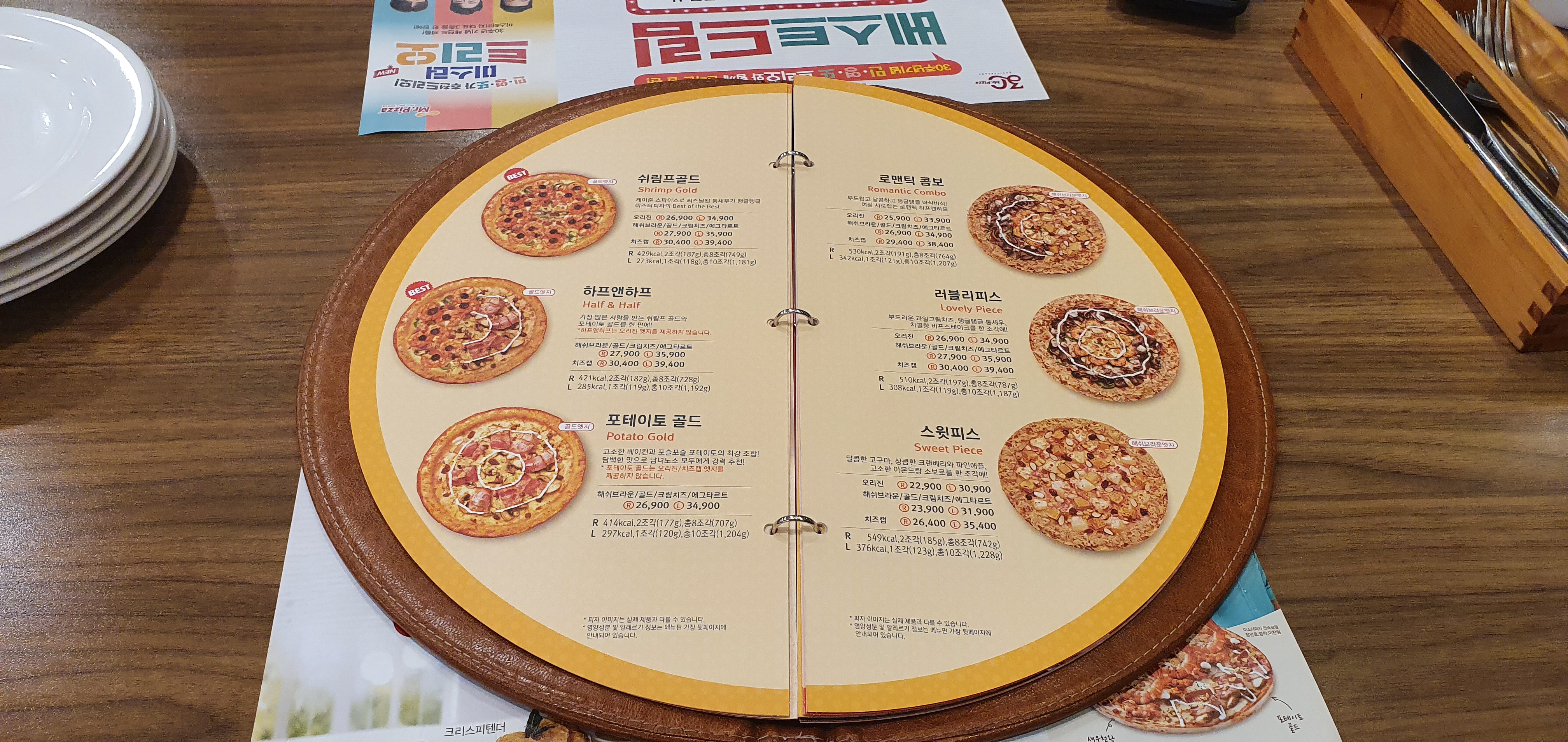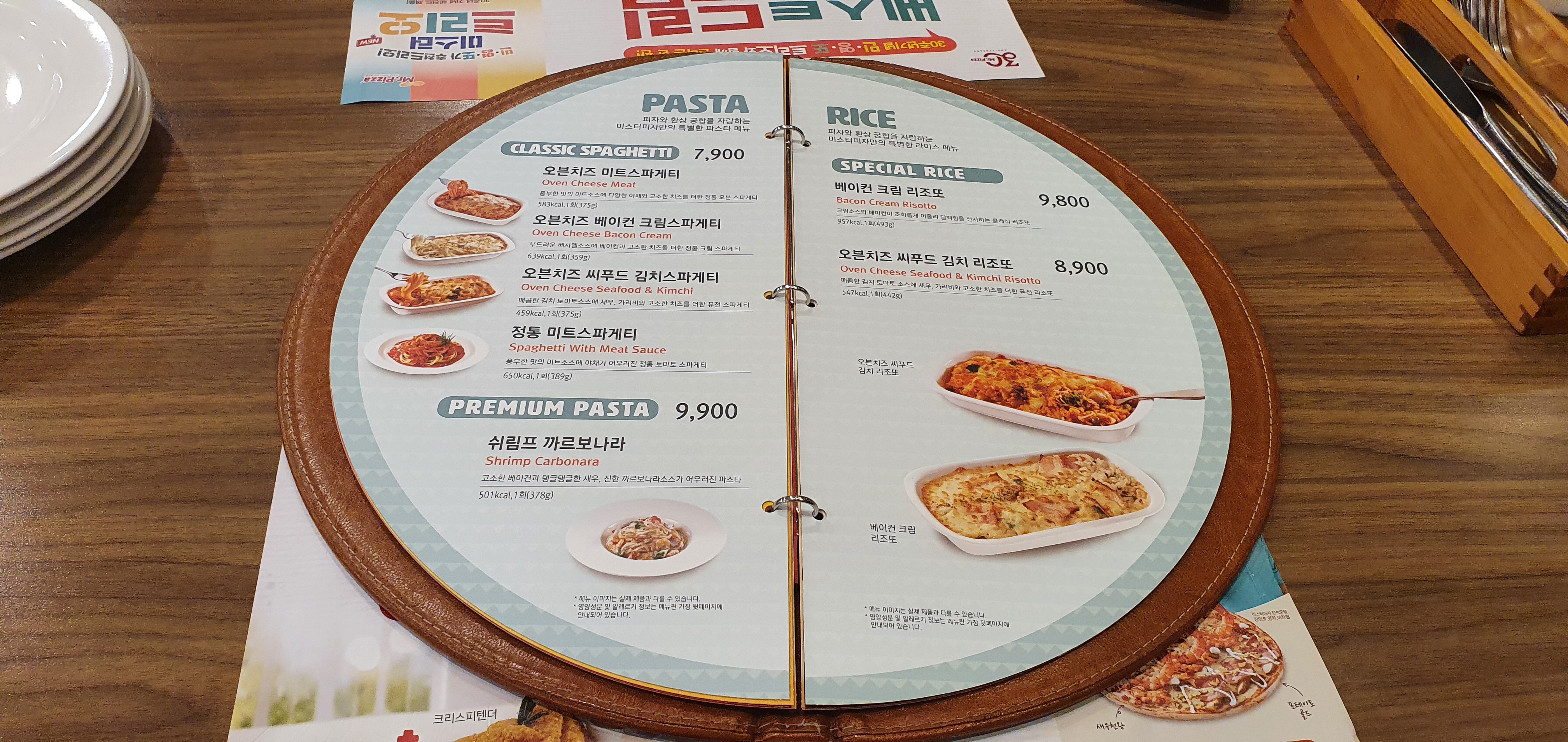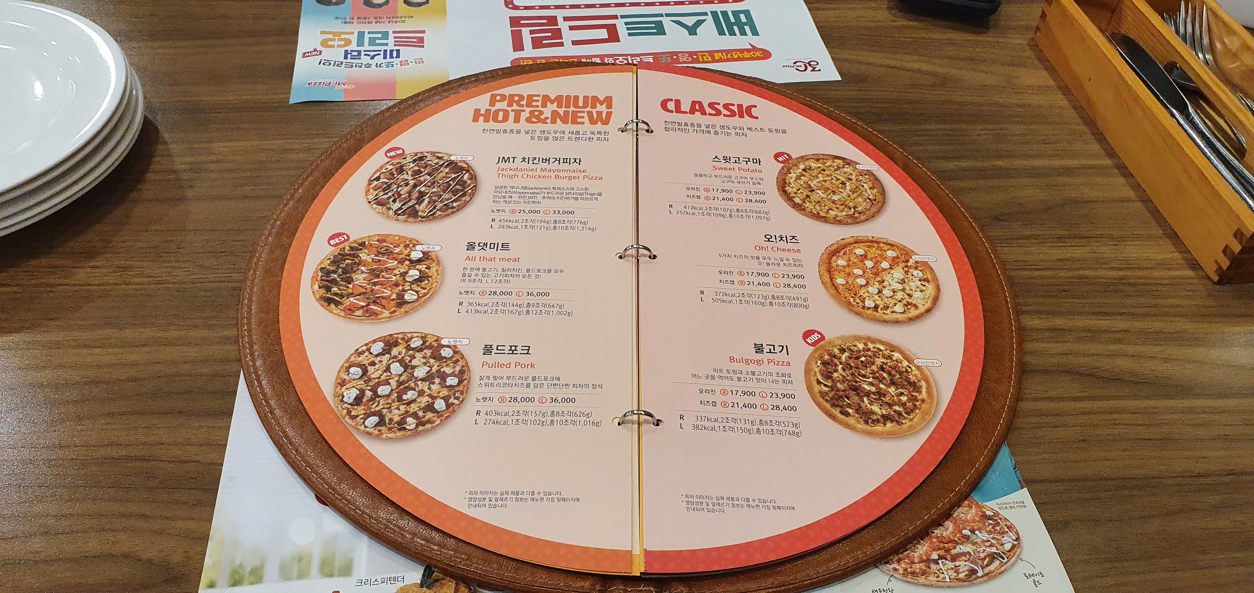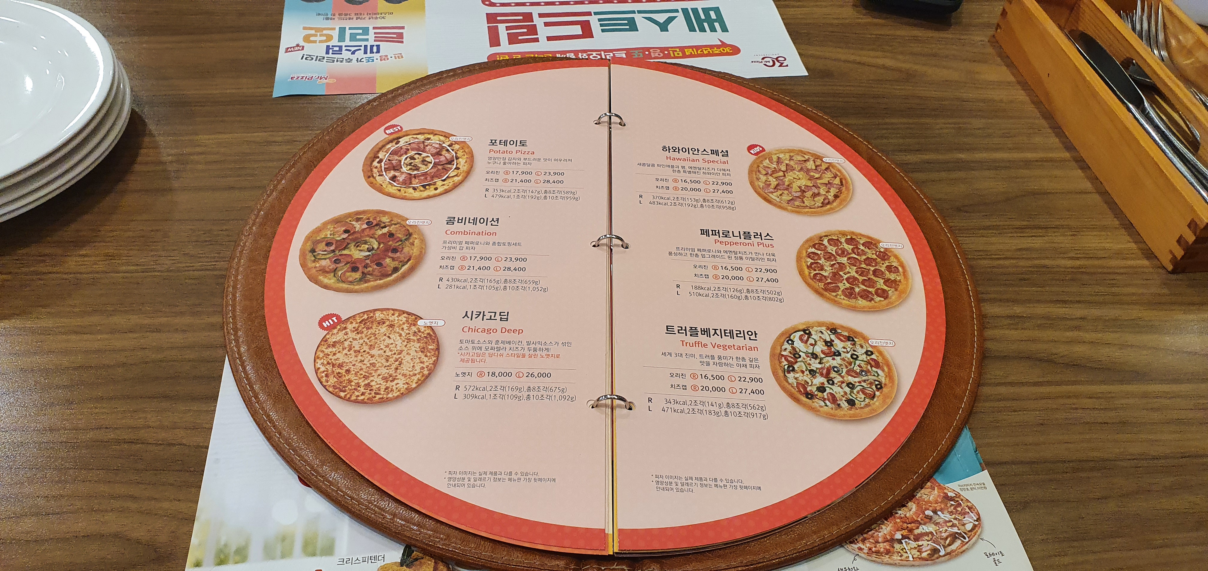 개봉역 개봉사거리 맛집 미스터피자에 들어가 자리를 잡고 앉아 메뉴판을 살펴보았습니다. 아래 사진은 미스터피자의 메뉴판들을 한 장씩 찍은 것입니다. 동그란 피자 모양으로 된 메뉴판이었습니다. 자세한 내용은 사진을 참고하세요~