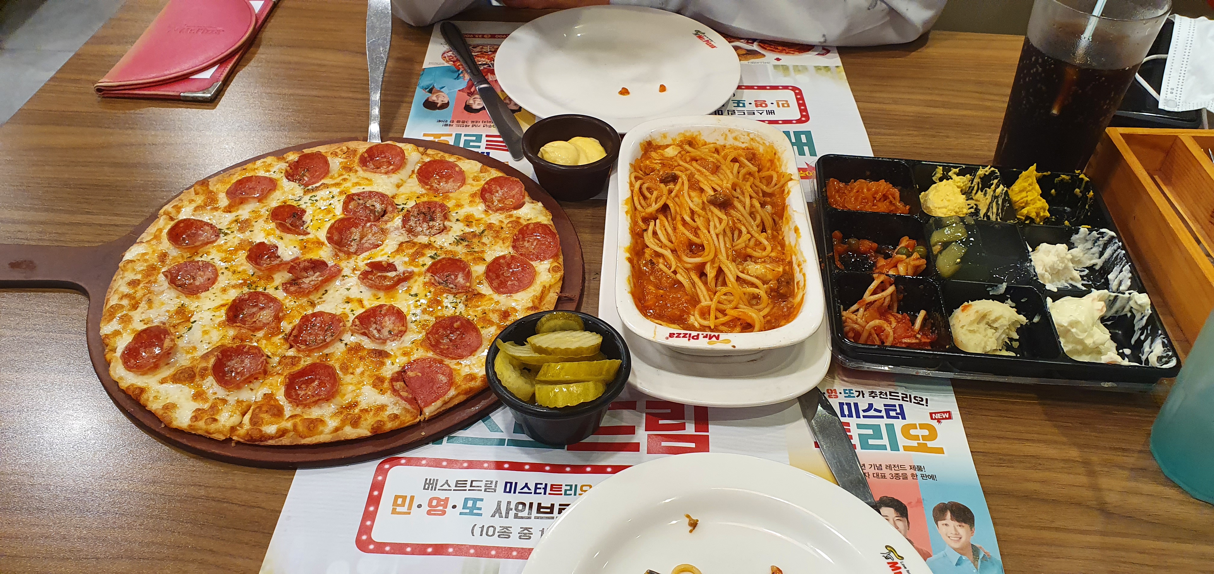 개봉역 개봉사거리 맛집 미스터피자에서 찐페퍼로니 피자, 오븐미트스파게티, 홈샐러드, 콜라, 블루레몬에이드 완전 클리어~ 진짜 배불리 맛있게 먹었답니다.