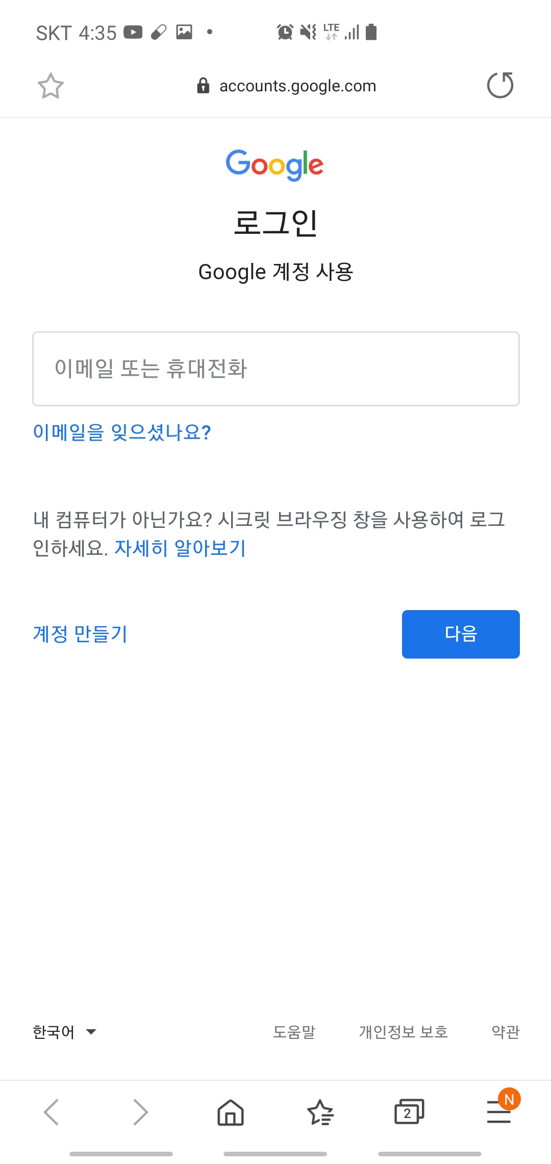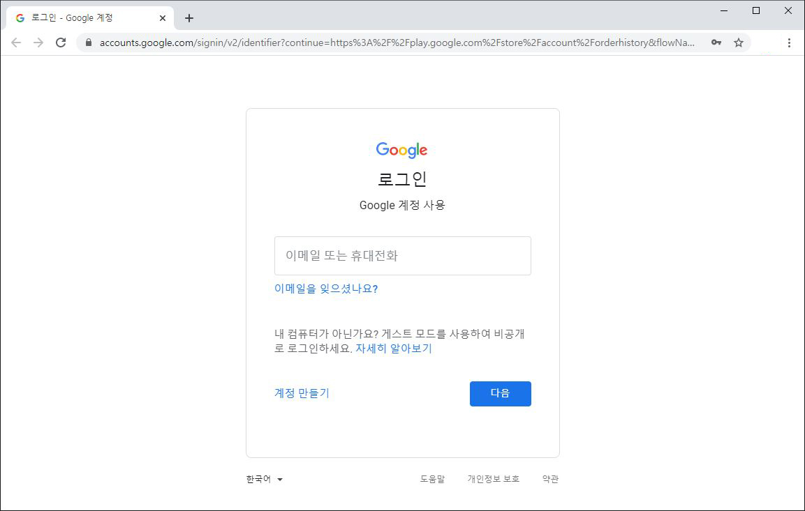 위에 링크를 클릭하여 들어가면 위에 사진과 같이 나옵니다. 왼쪽은 핸드폰 모바일 브라우저로 들어간 화면이고 오른쪽은 컴퓨터 인터넷 브라우저로 들어간 화면입니다. 구글 플레이스토어의 환불(결제 취소)을 원하는 아이디로 로그인을 합니다.