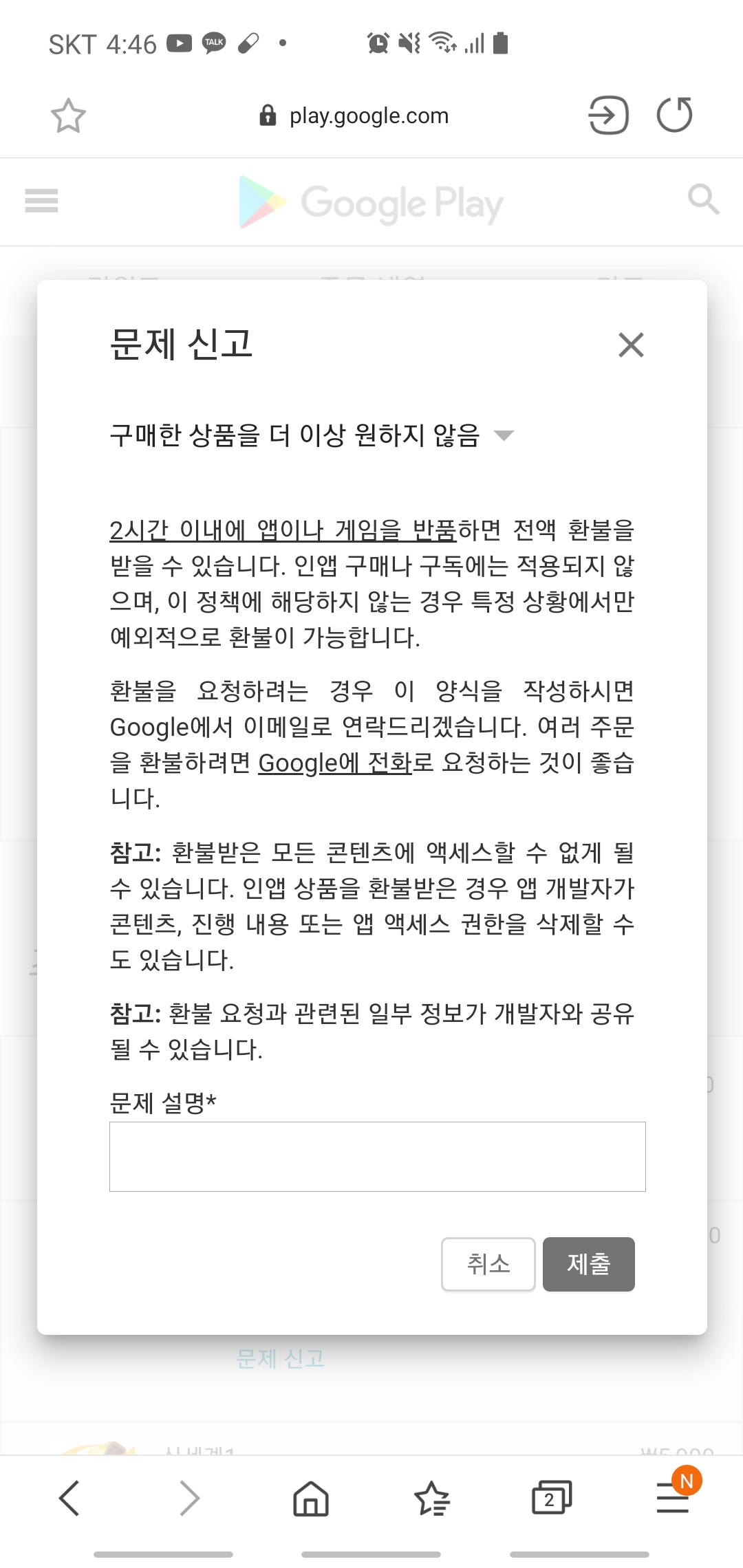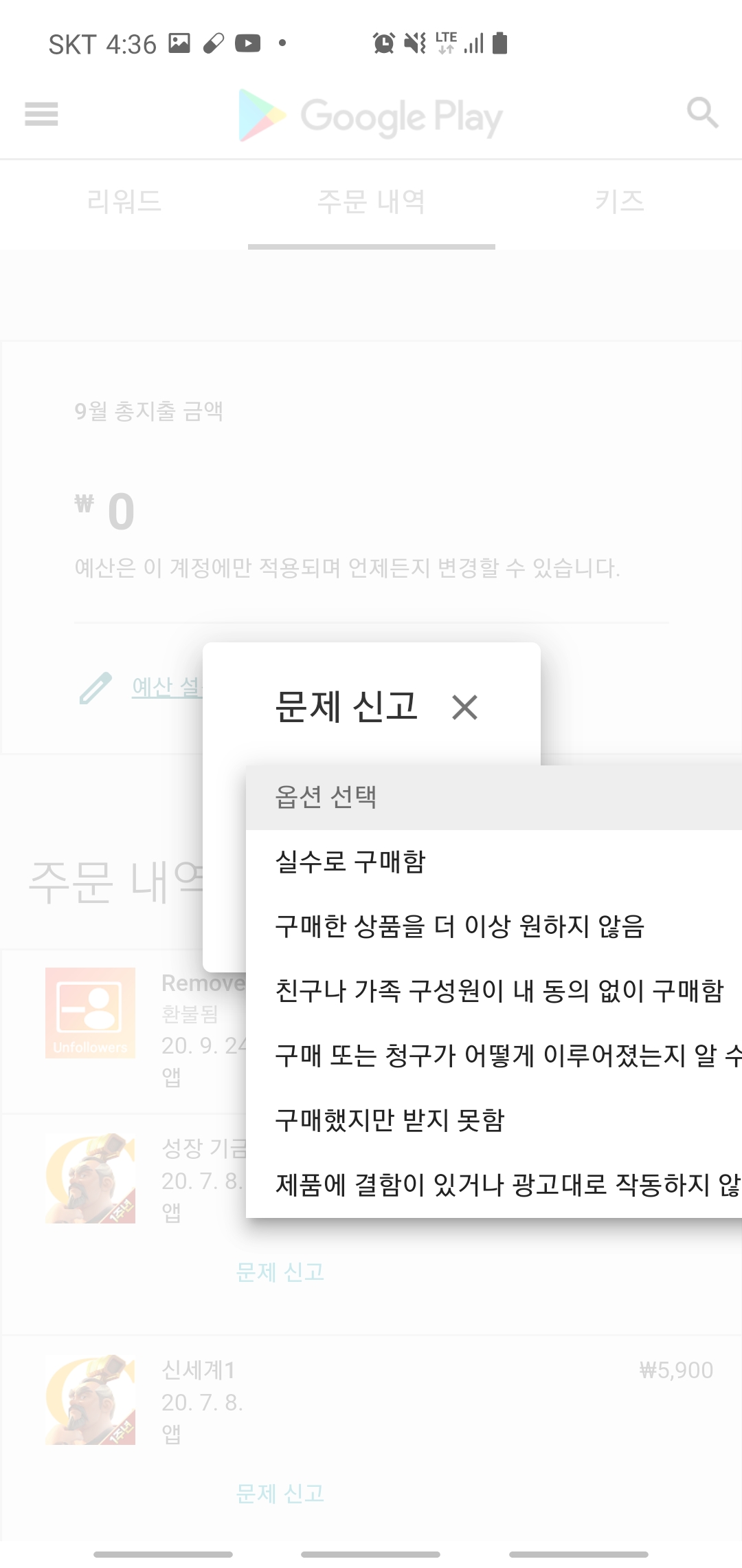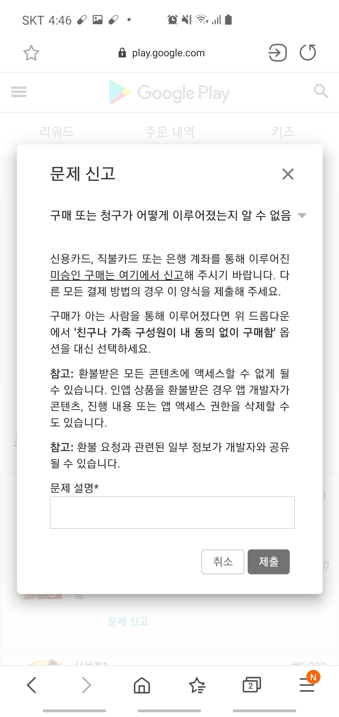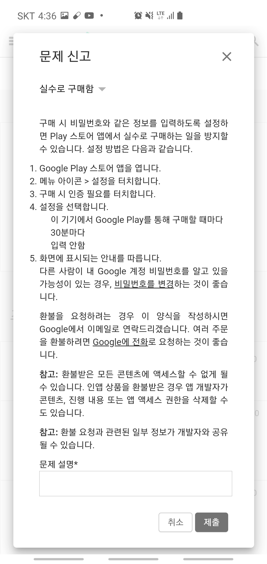 구글 플레이스토어의 주문 내역에서 [문제 신고]를 누르면 위에 사진과 같이 옵션 선택을 할 수 있는 창이 나타납니다.