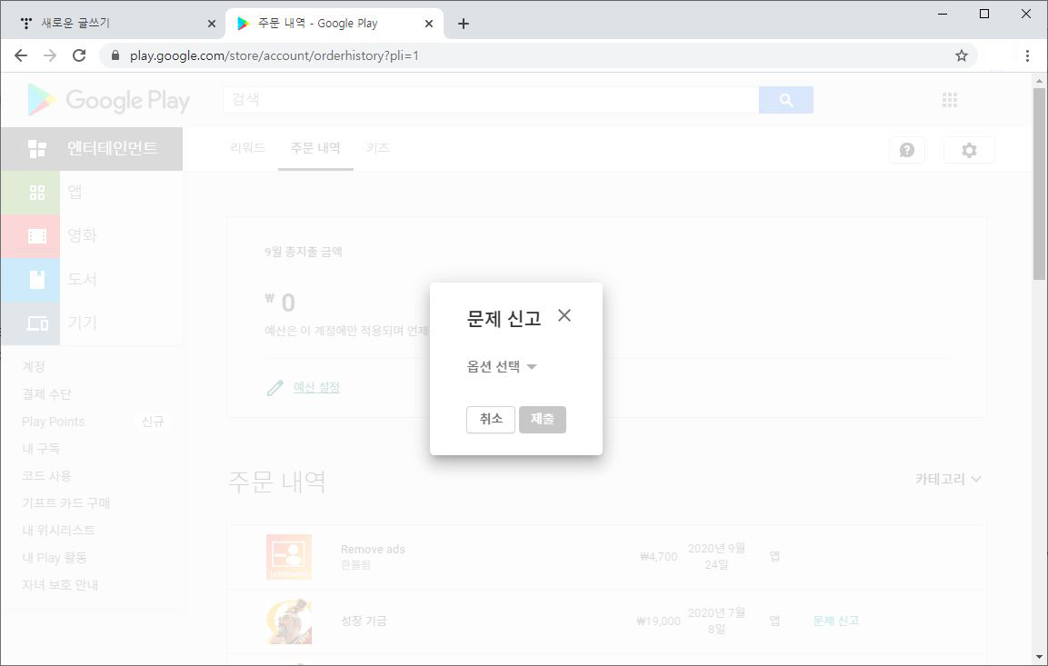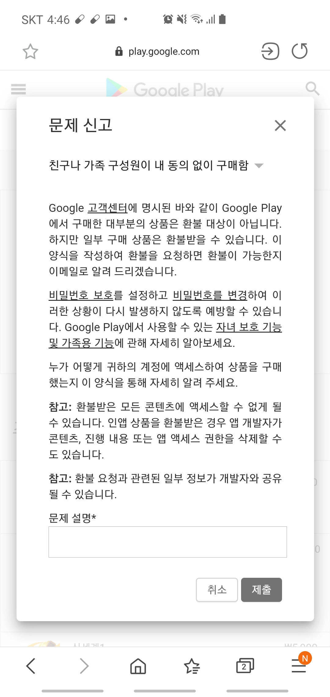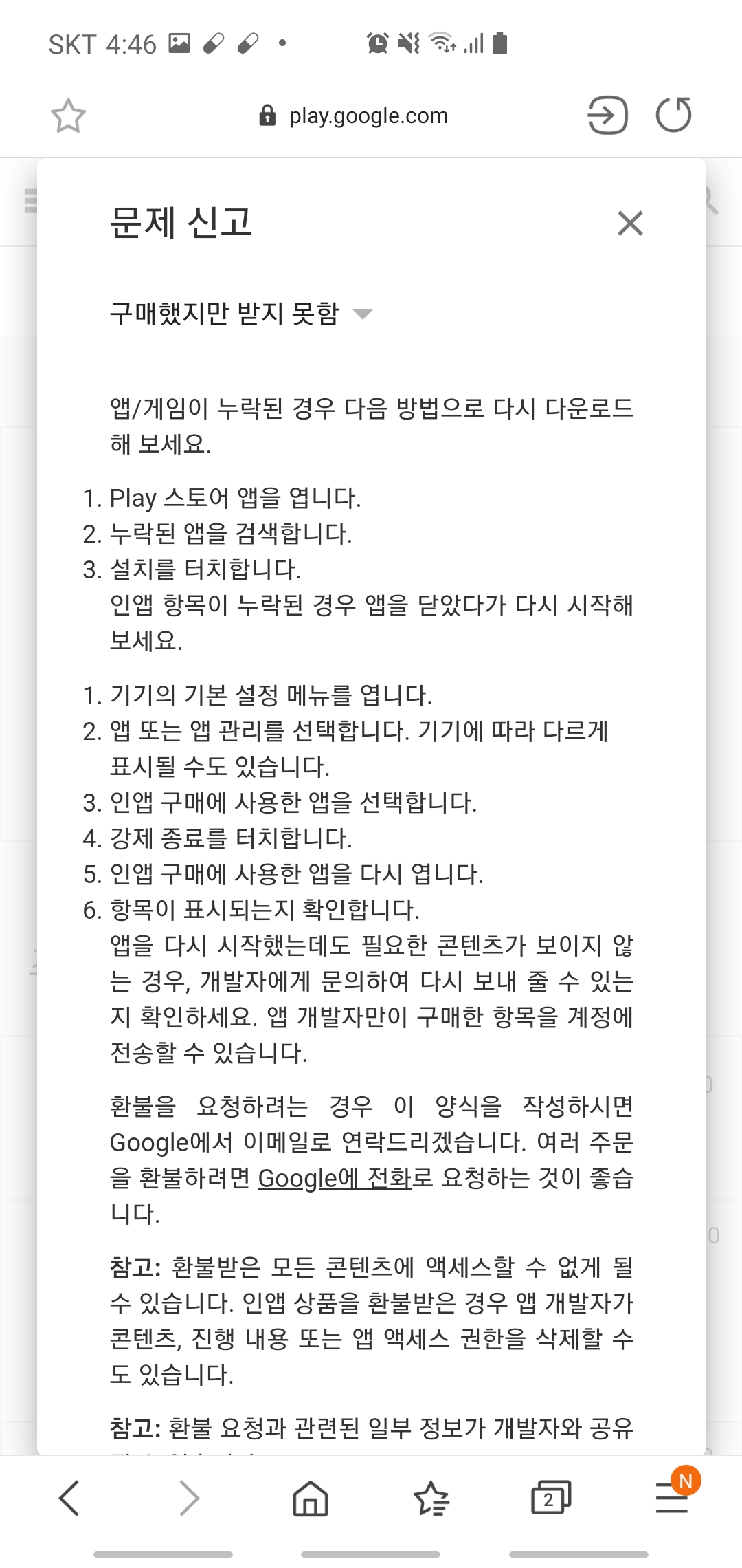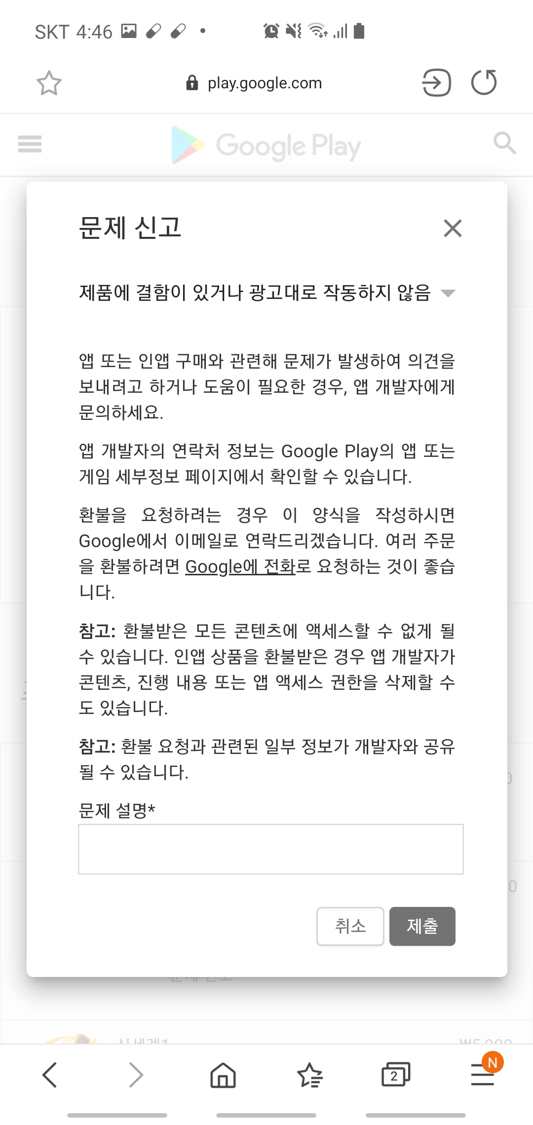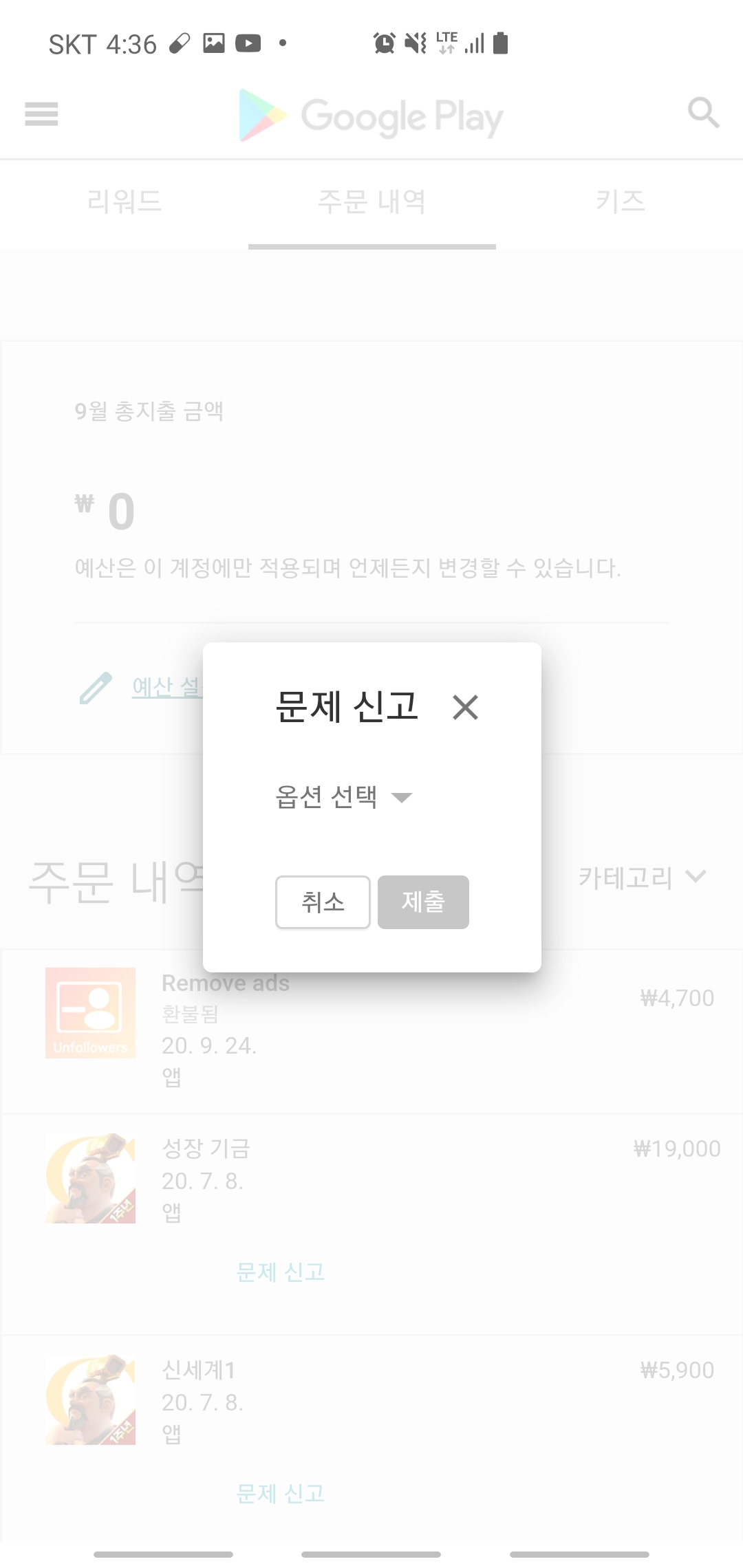 구글 플레이스토어의 주문 내역에서 [문제 신고]를 누르면 위에 사진과 같이 옵션 선택을 할 수 있는 창이 나타납니다.