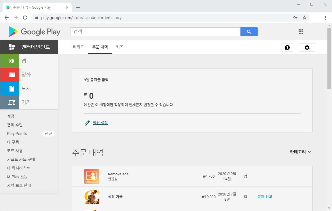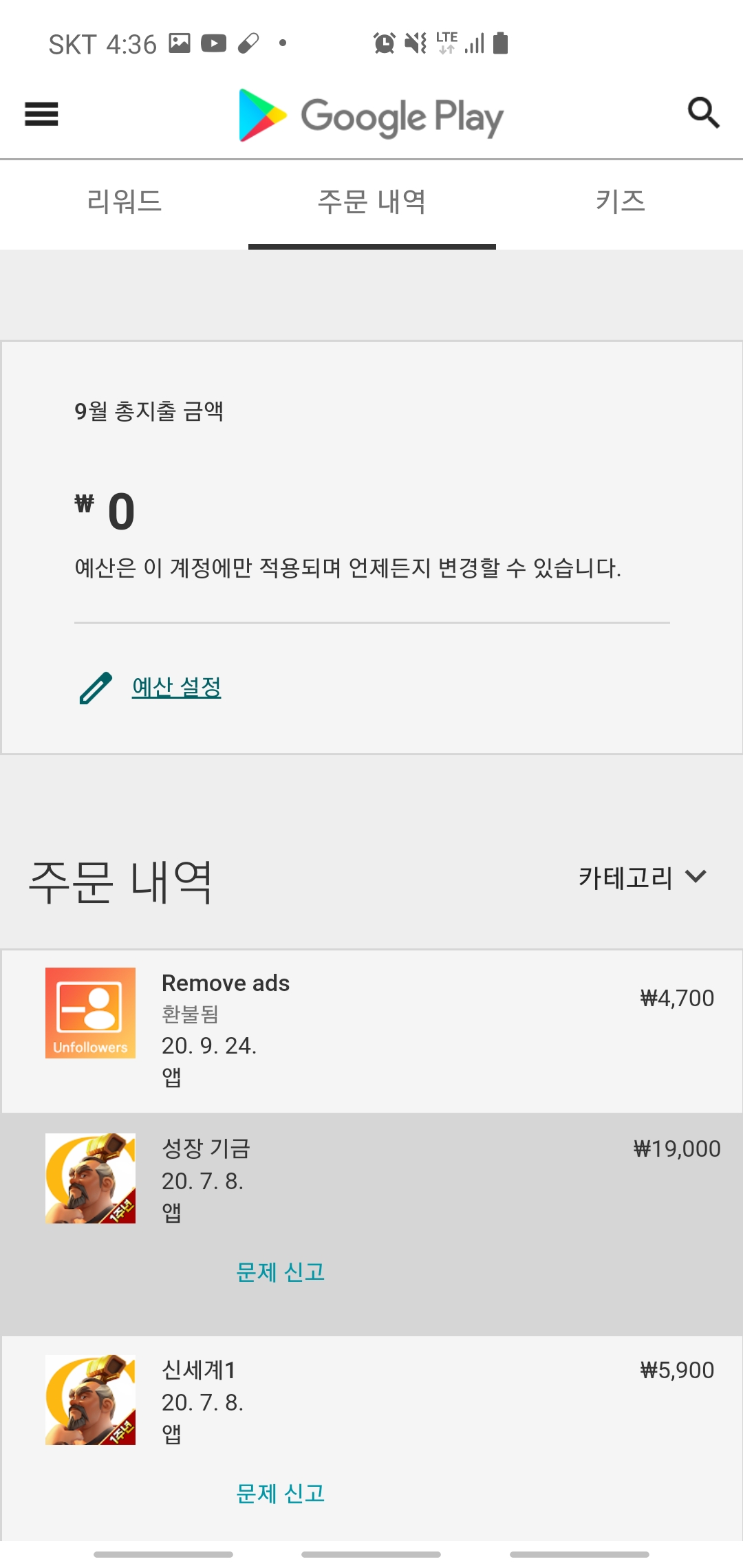 그러면 위에서 사진과 같이 구글 플레이스토어의 [주문내역] 화면으로 갑니다. 구글 플레이스토어의 주문 내역 중에 환불(결제 취소)을 원하는 항목의 [문제 신고] 버튼을 누릅니다.