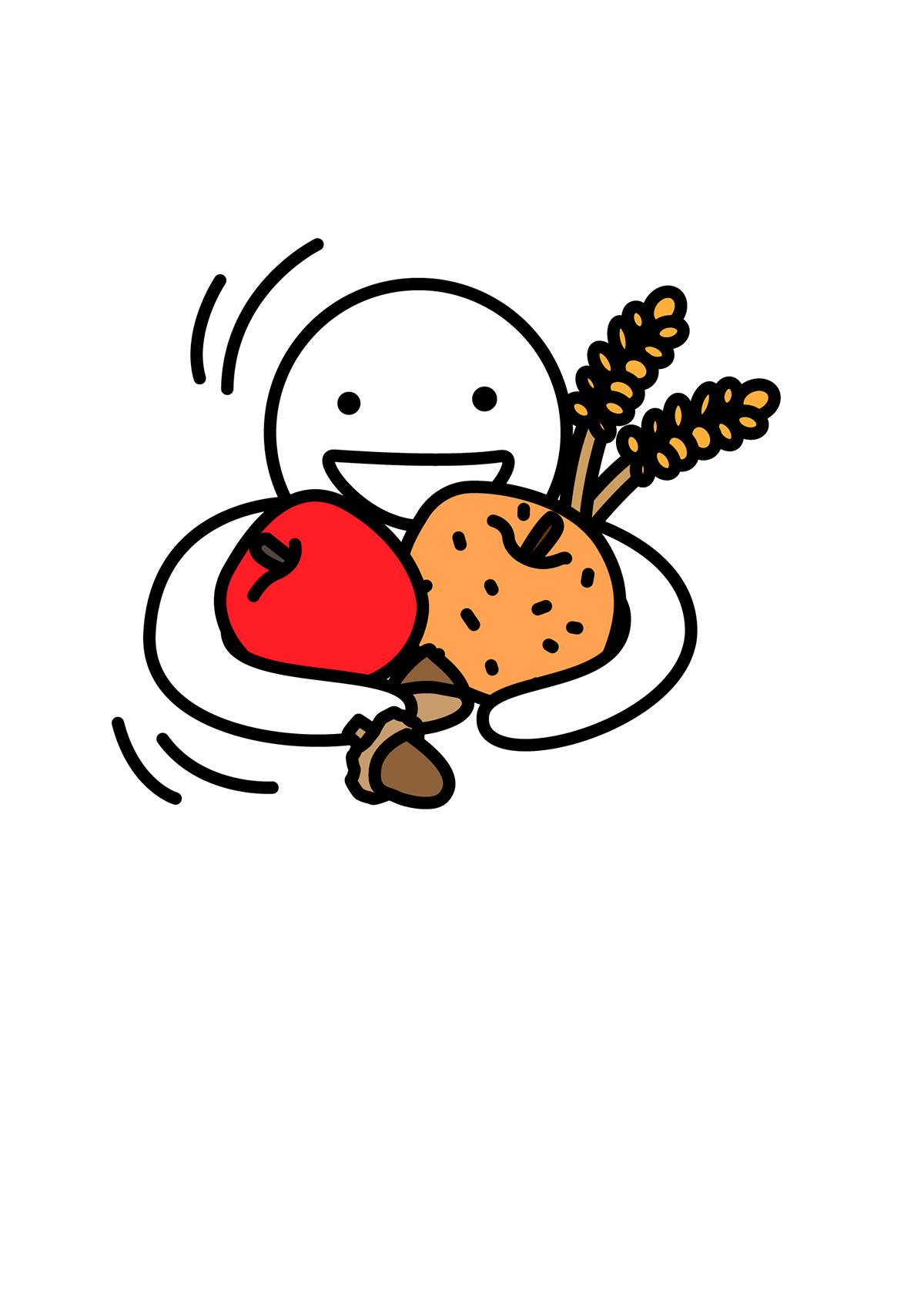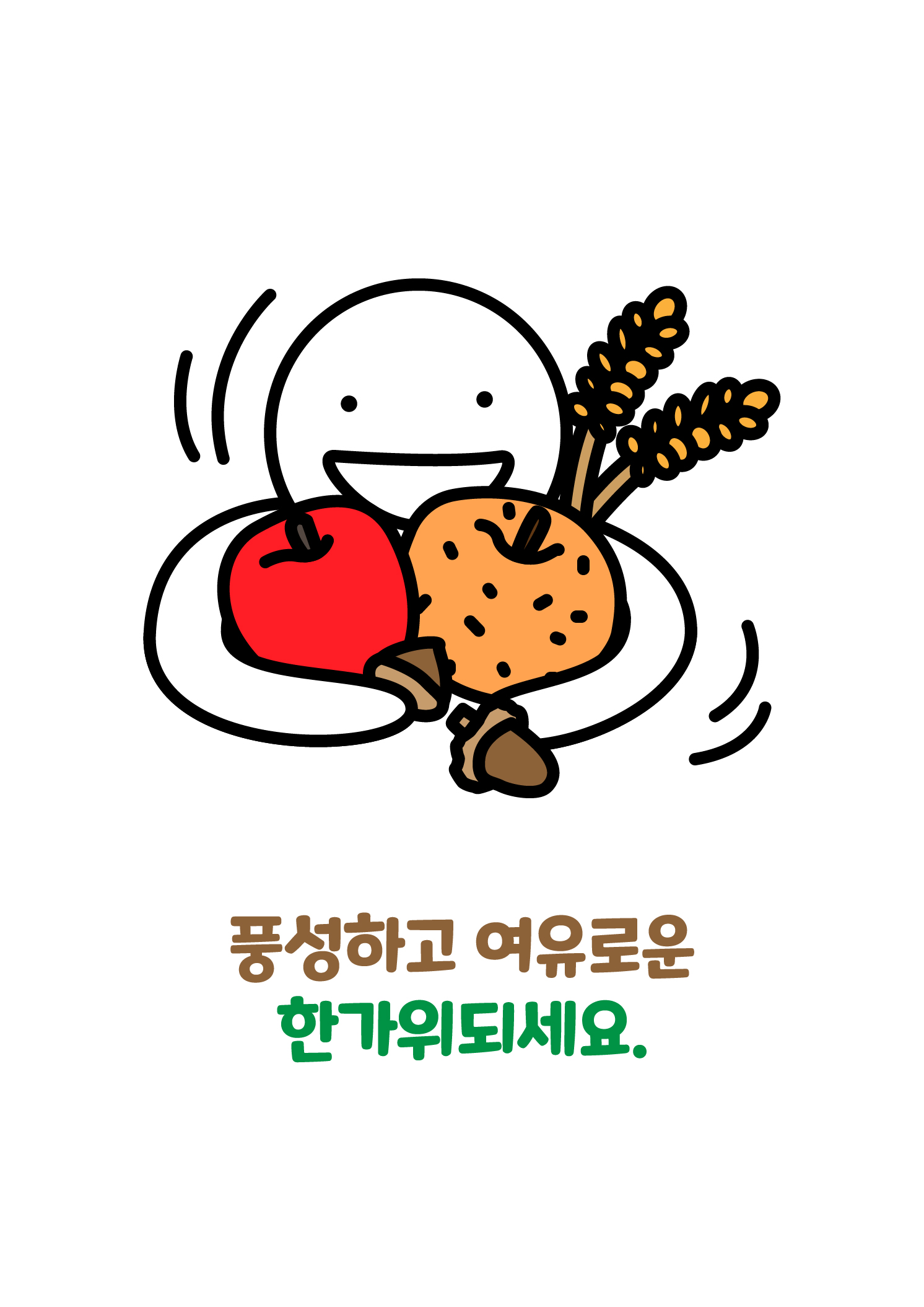 사과와 배, 그리고 밤과 도토리, 벼를 끌어안고 있는 이미지입니다. 풍성하고 여유로운 한가위가 되기를 바라는 마음을 담아 그렸습니다.