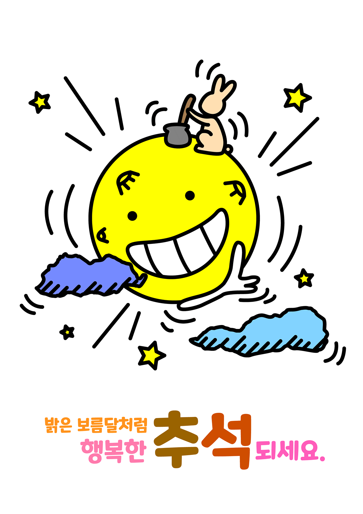 귀여운 달 캐릭터 위에 달과 어울리는 토끼가 방아를 찌고 있고, 하늘에 별과 구름 달을 외롭지 않게 해주고 있습니다. 왼쪽 그림은 일러스트로 jpg, 오른쪽 그림은 움짤로 gif입니다.