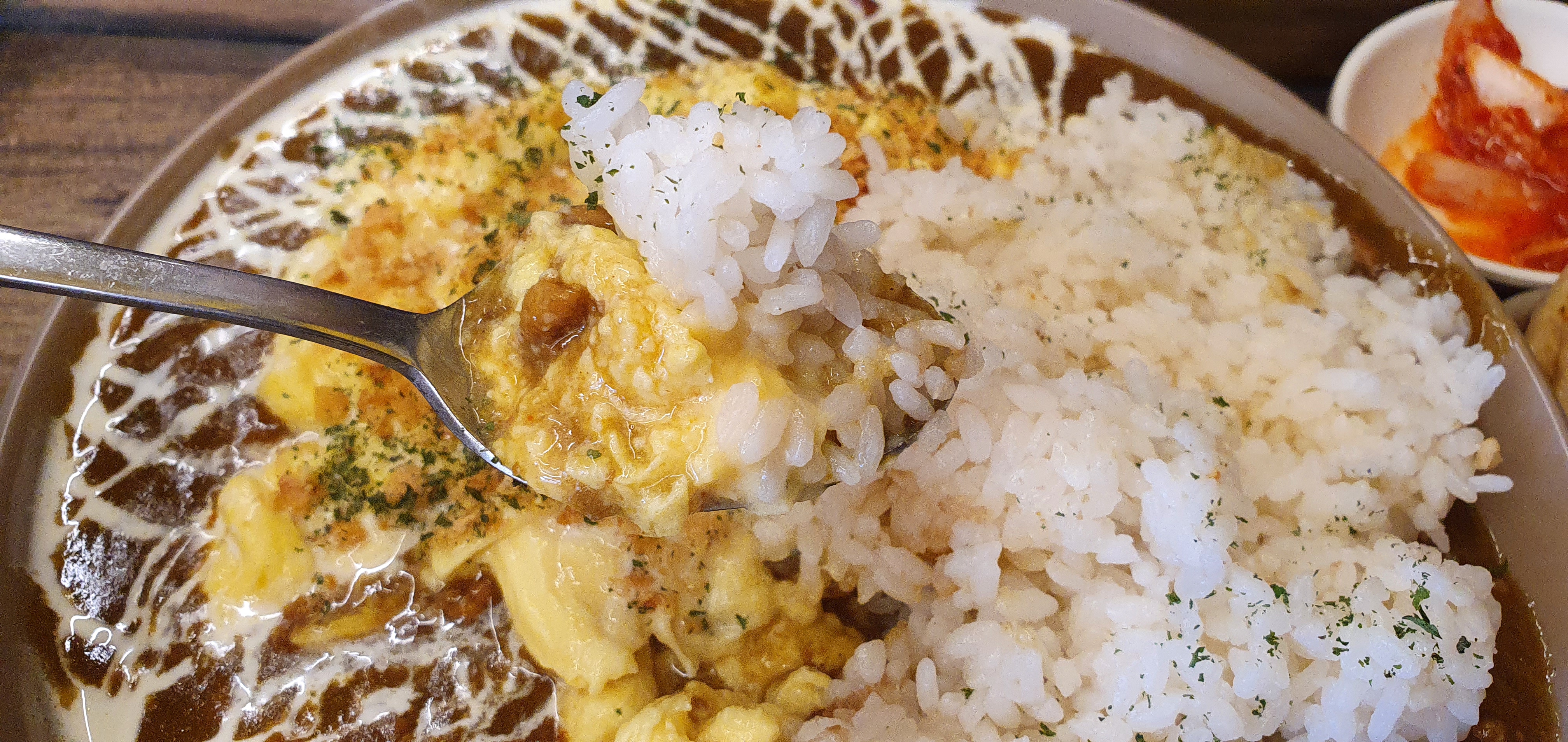 서울대입구역 샤로수길 하카타 카레 맛집 모다모다의 스크럼블카레에 있는 각 잡혀 있는 밥 또한 숟가락을 세워 세로로 눌러 스크럼블과 밥, 카레을 적절히 섞어 먹었습니다.