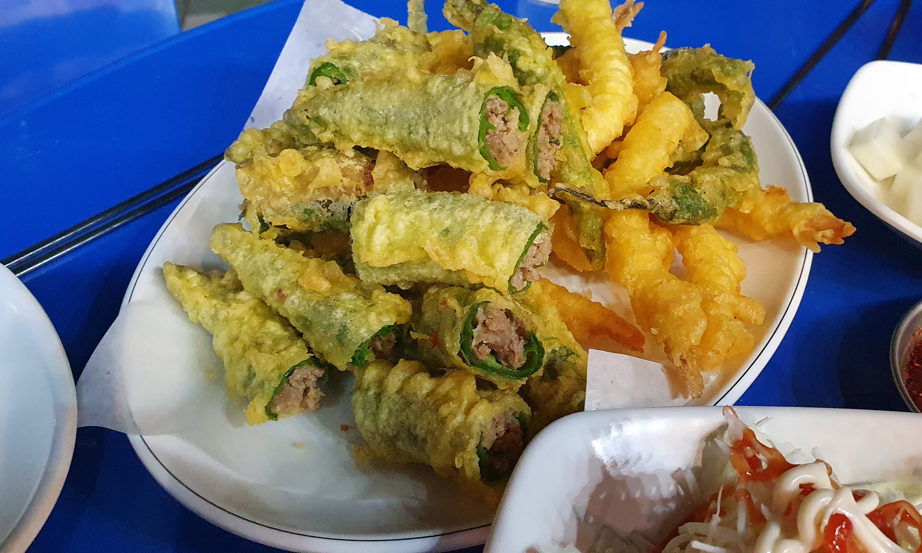 꼭지가 있는 고추는 매운 고추 튀김, 꼭지가 없는 통통한 고추는 안 매운 튀김, 새우튀김이 한 접시 나왔습니다.