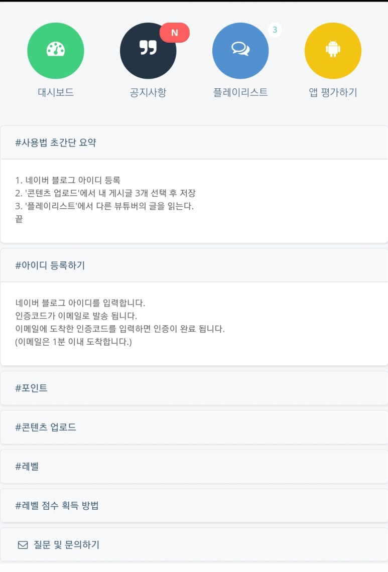 플레이스토어에서 네이버 블로그 품앗이 또는 뷰튜브라고 검색을 하면 위에 사진과 같은 앱을 찾을 수 있습니다. 찾았다면 설치를 누룬 후 다운로드 및 설치가 완료 되면 열기를 누르면 됩니다.