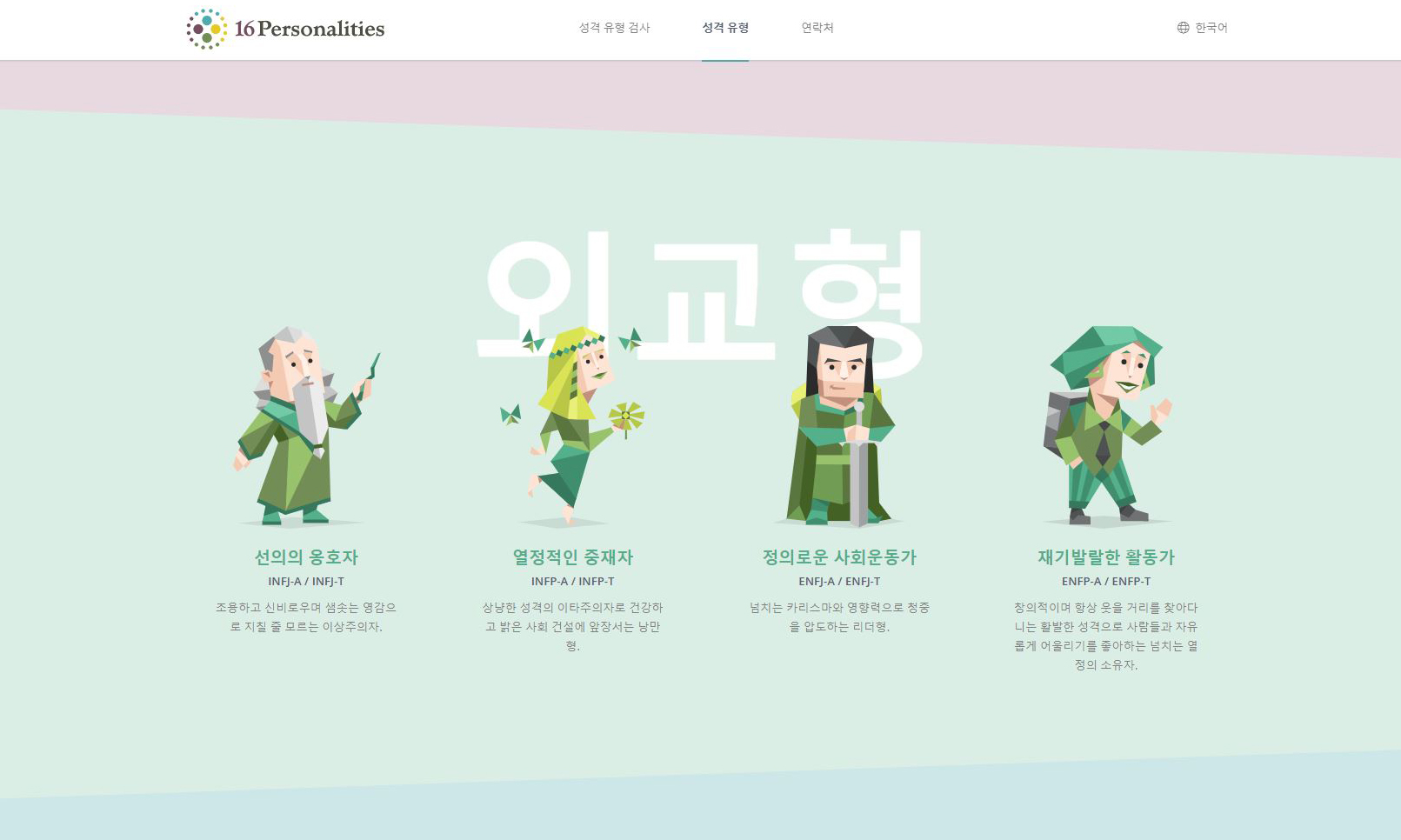 -외교형 : 선의의 옹호자 / 열정적인 중재자 / 정의로운 사회운동가 / 재기발랄한 활동가