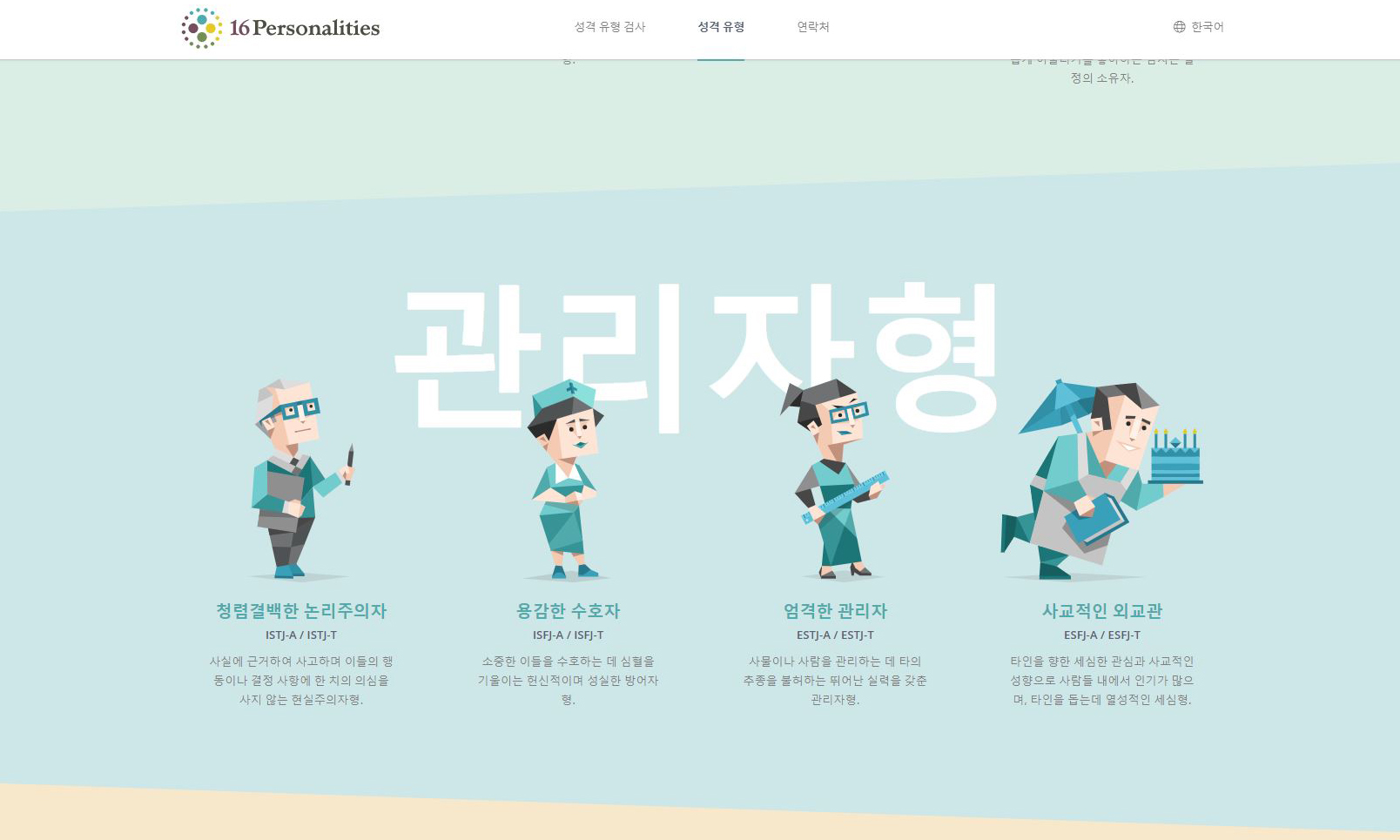 -관리자형 : 청렴결백한 논리주의자 / 용감한 수호자 / 엄격한 관리자 / 사교적인 외교관