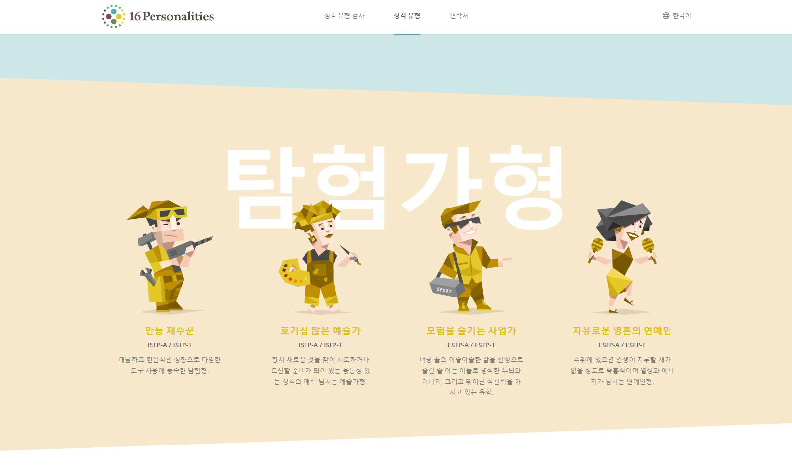 -탐험가형 : 만능재주꾼 / 호기심 많은 예술가 / 모험을 즐기는 사업가 / 자유로운 영혼의 연예인