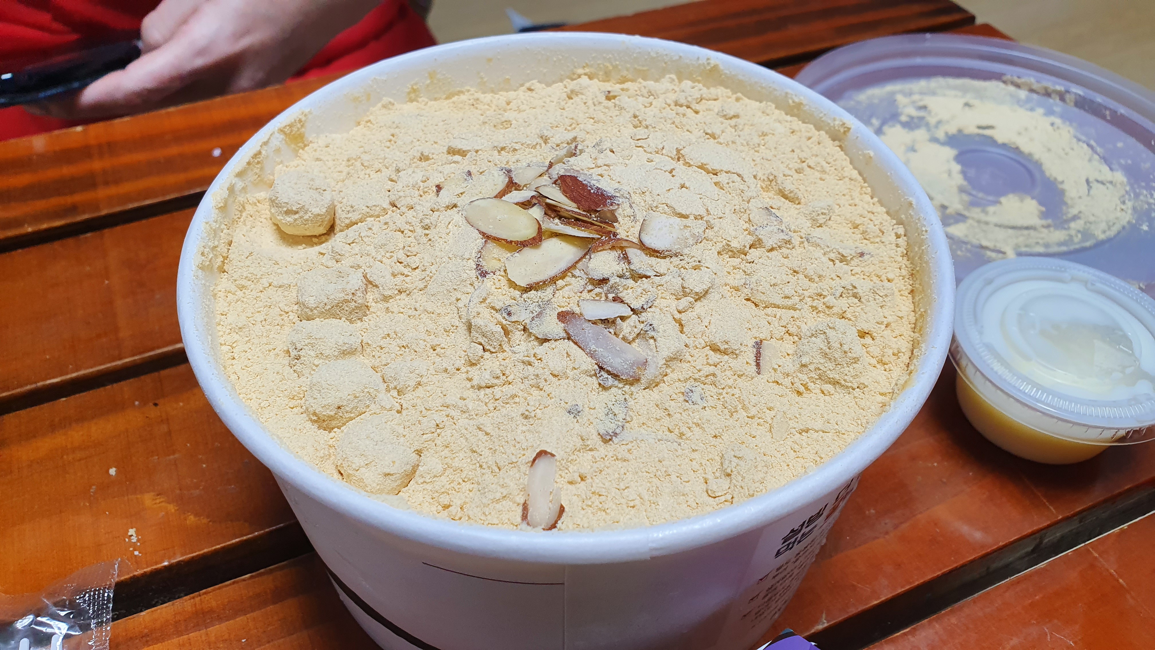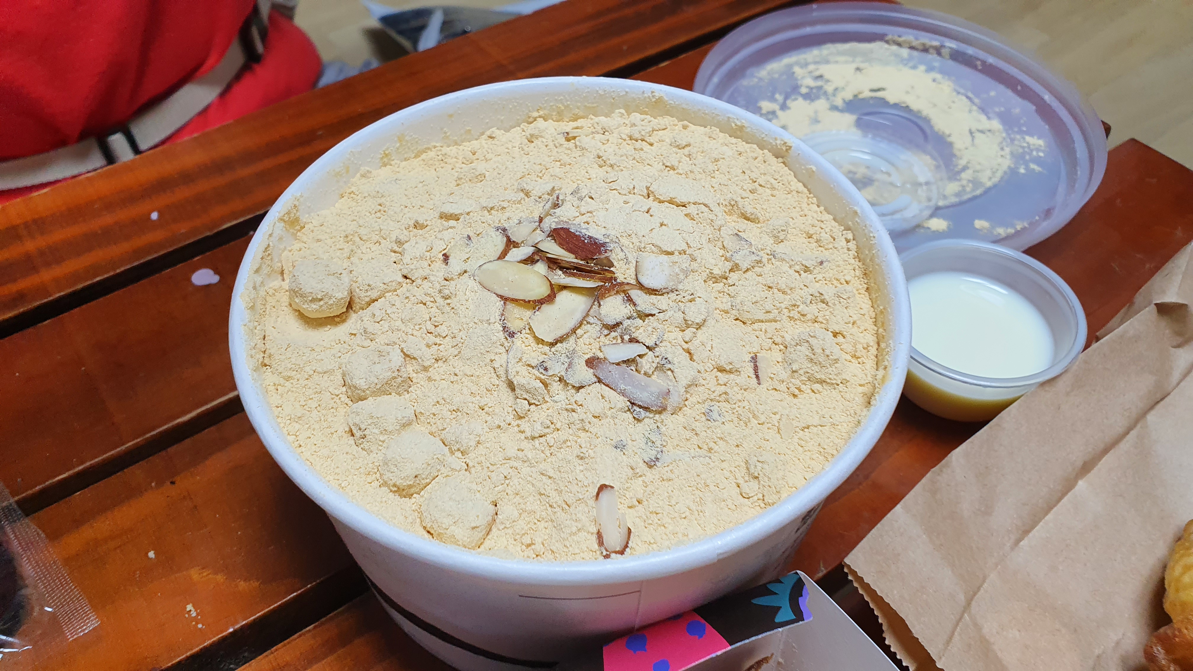 위에 사진은 설빙 역곡점의 인절미설빙입니다. 인절미 가루와 견과류 그리고 떡이 많이 들어있었습니다.