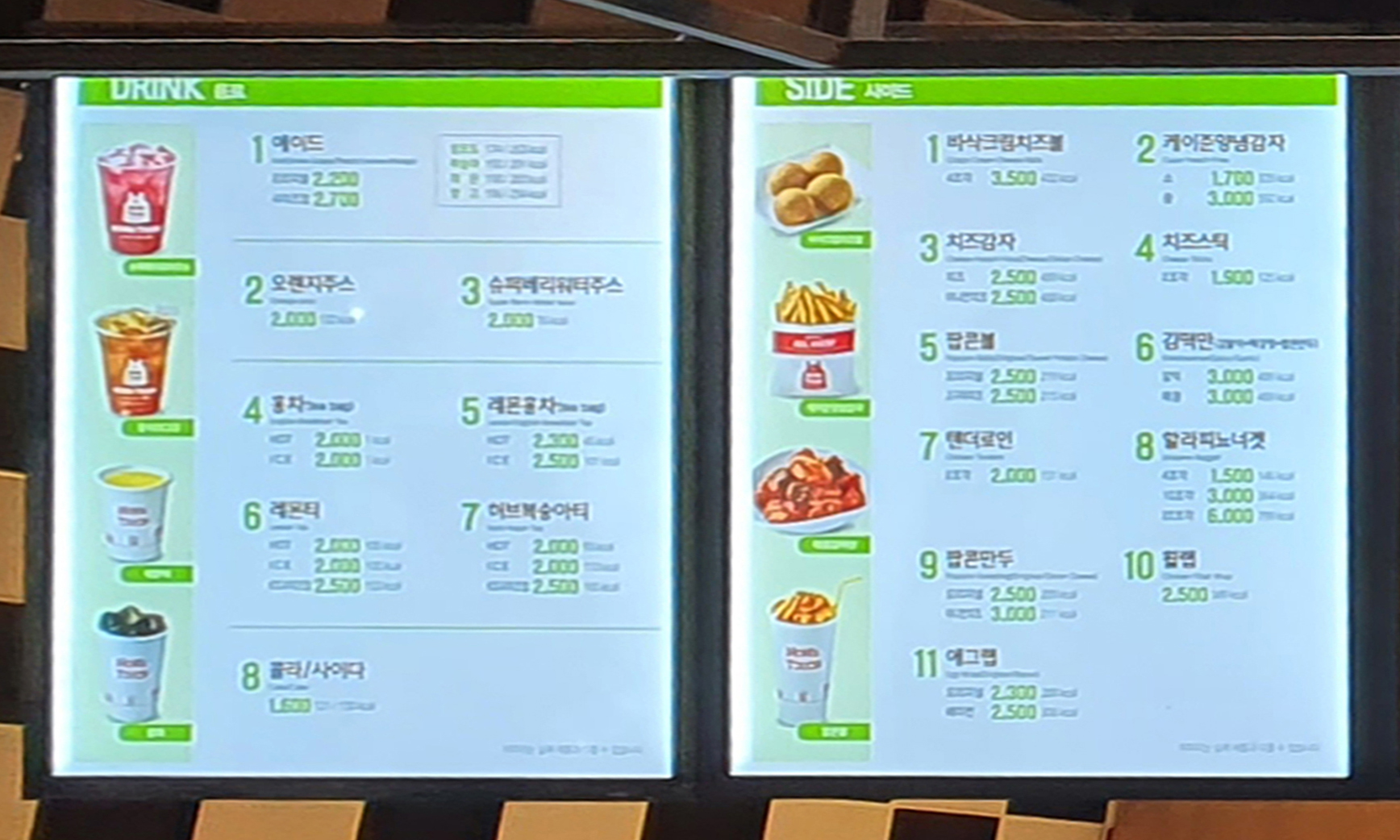 구일역 동양미래대 맛집 맘스터치에 도착해서 커플세트(싸이버거, 닭강정, 바삭크림치즈볼, 콜라)를 주문했습니다. 위에 메뉴판을 찍었는데 잘 안 보이는 것 같아 아래 사진을 나눠서 확대했습니다. 참고하세요.