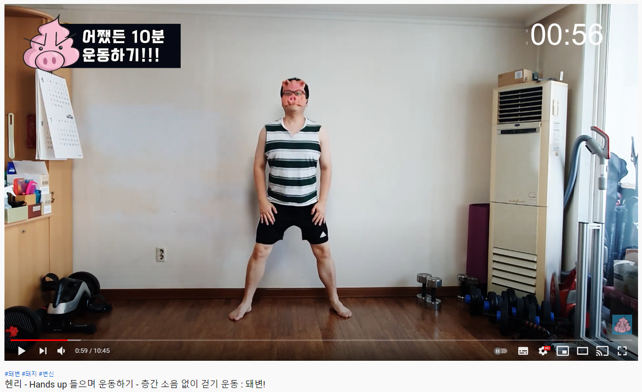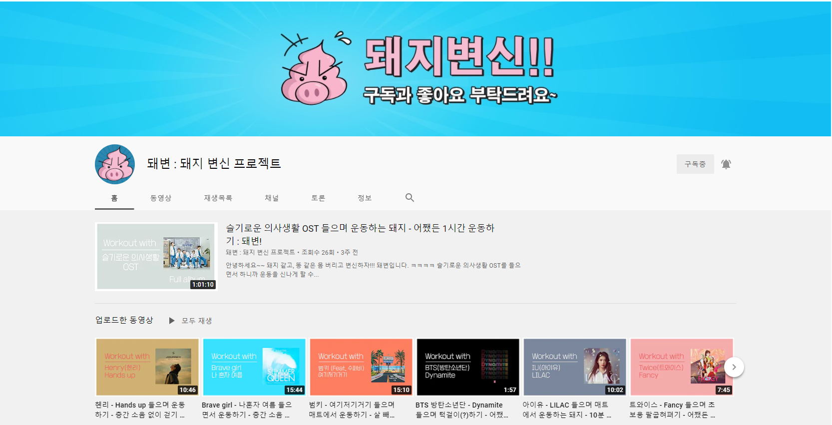 홈트 걷기운동 실내사이클 턱걸이 등 운동하는 유튜브 돼변 : 돼지변신을 소개하겠습니다.