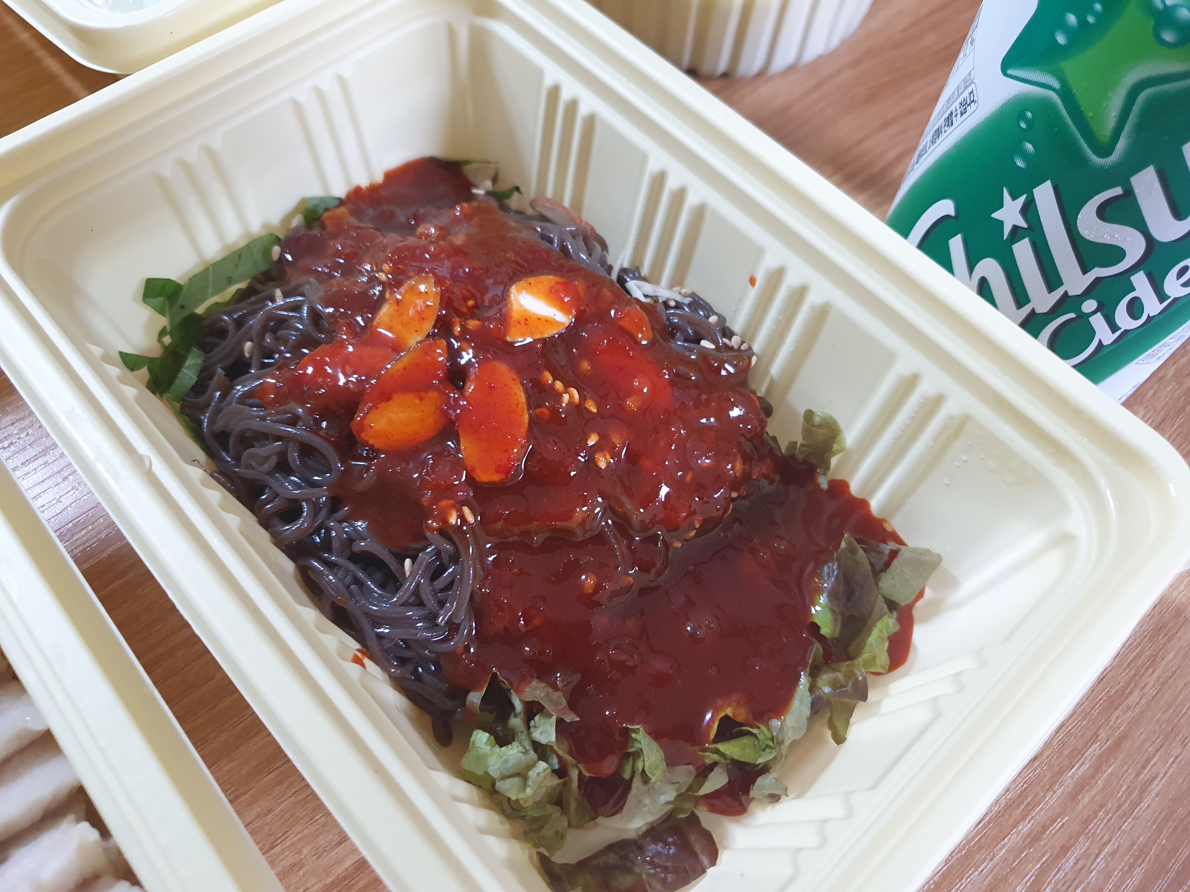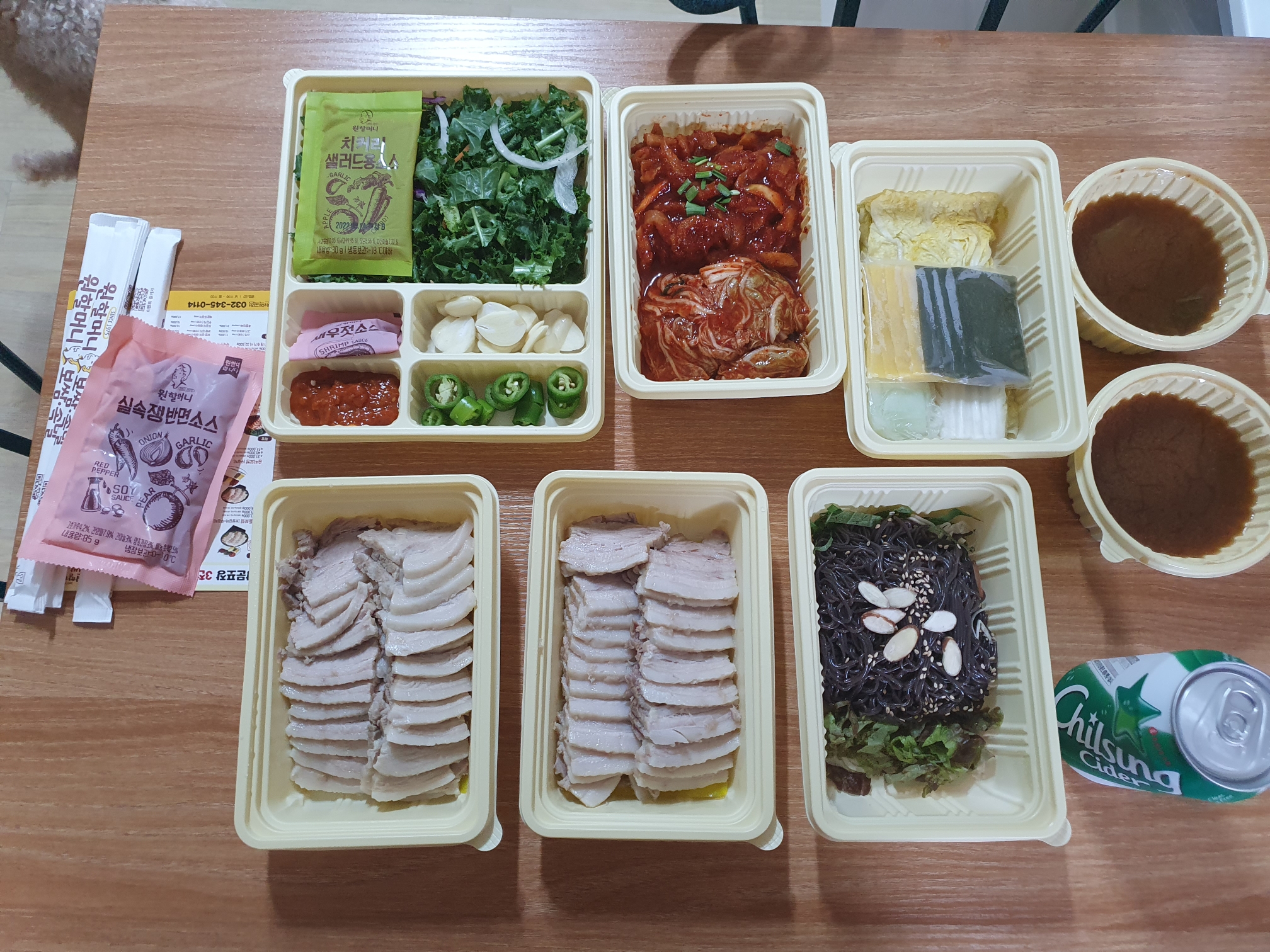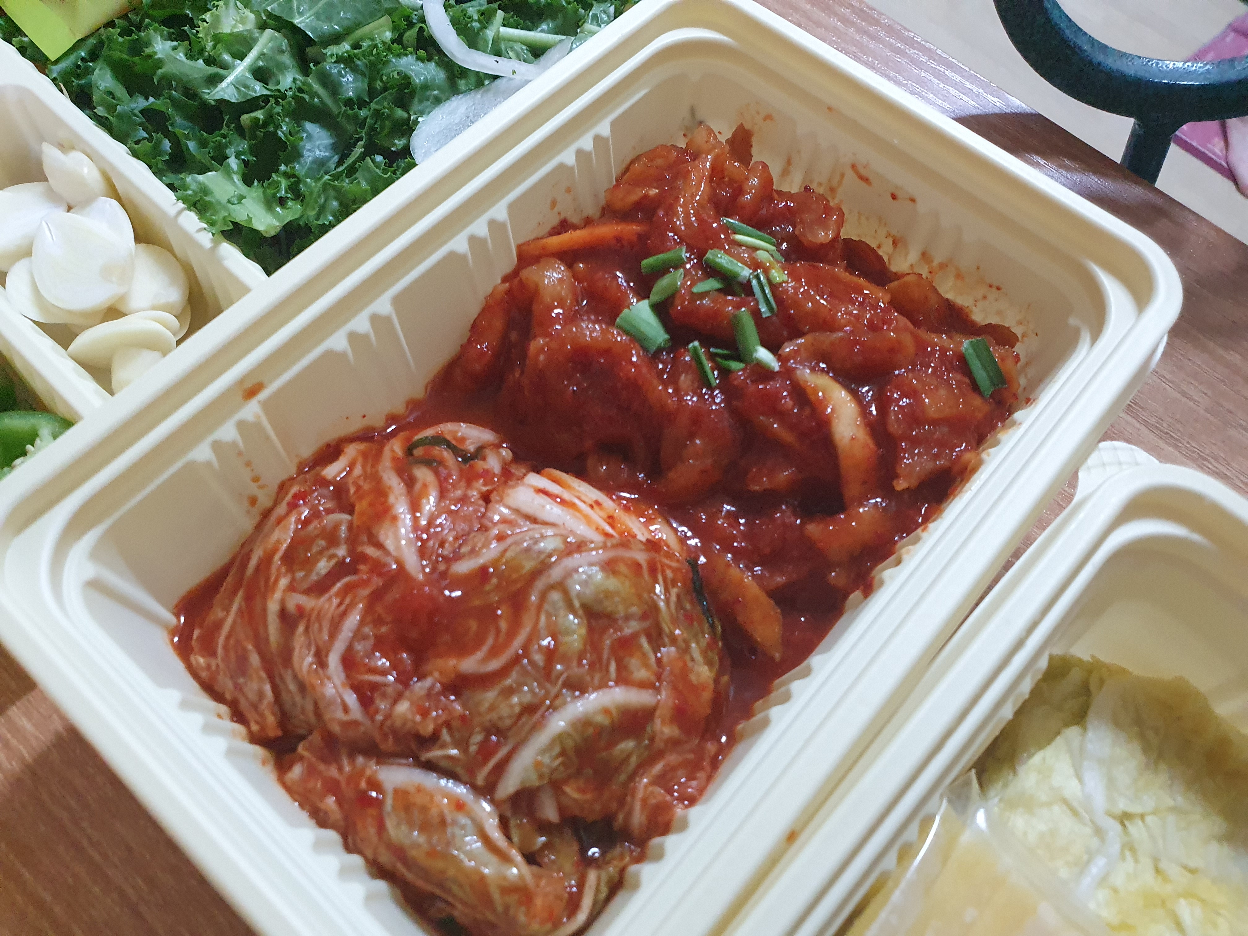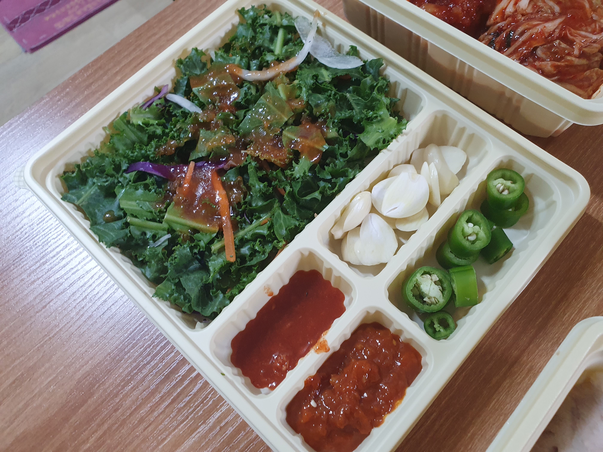 샐러드와 새우젓(개별 포장), 쌈장, 고추, 마늘이 한 통에 담겨 있었습니다. 샐러드 소스와 새우젓은 개별 포장되어 들어있었고, 뜯어서 있던 자리에 짠 것입니다.