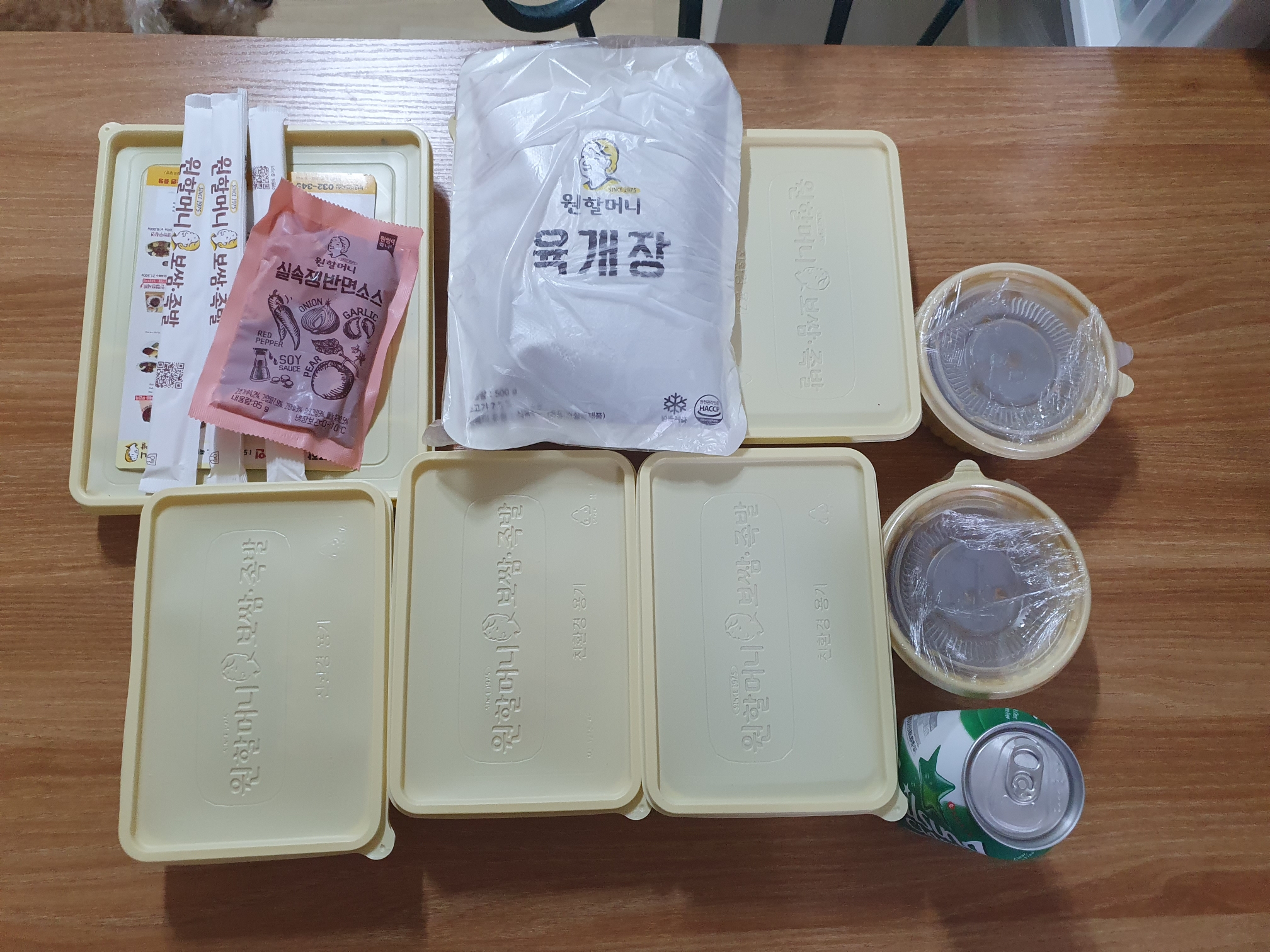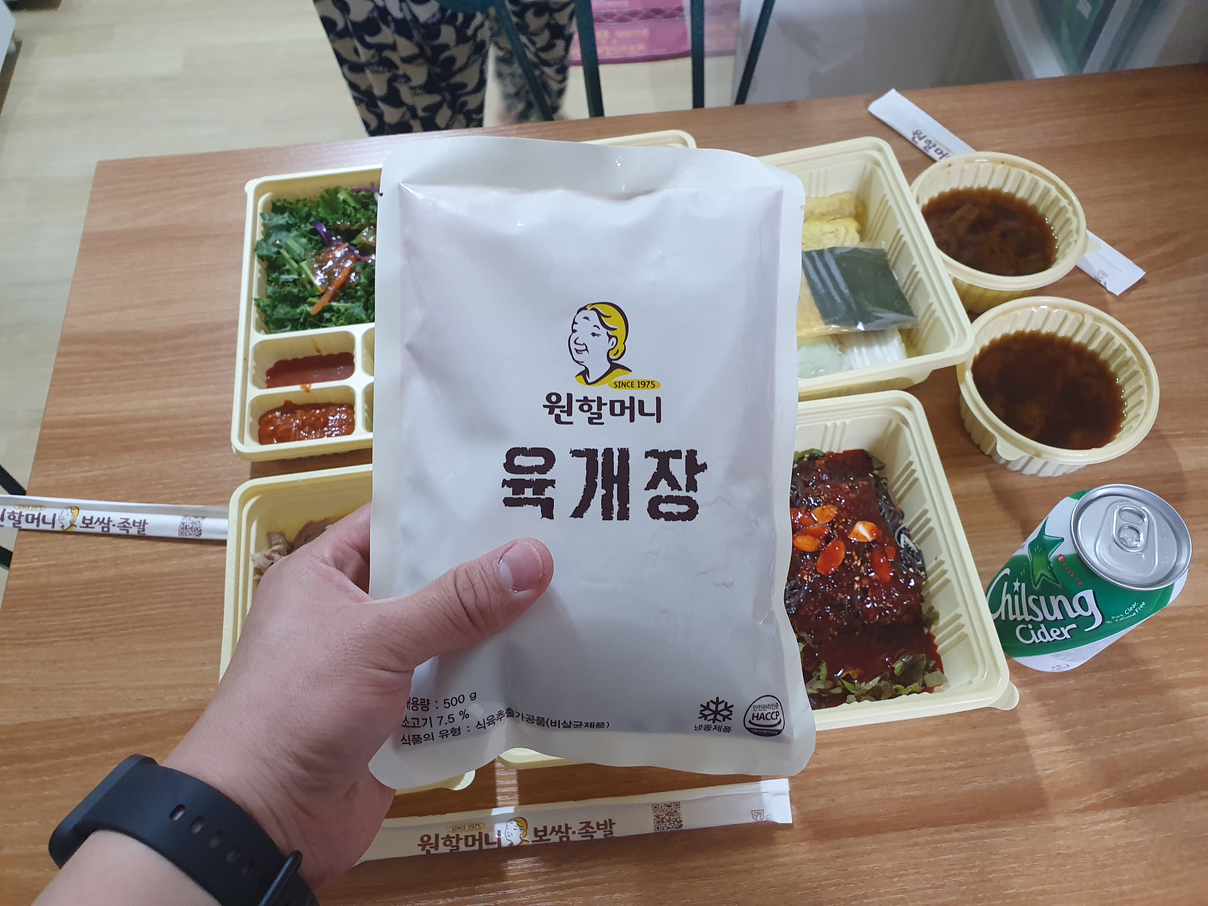 이외에 사이다 1캔과 국물 2통이 있었고, 원할머니 육개장은 리뷰를 써서 준것 같았습니다. 육개장은 나중에 먹으려고 냉동고에 넣어 보관했습니다. 보쌈 중(3~4인)을 3명에서 먹었는데 배부르고 맛있게 잘 먹을 수 있었습니다. 개인적으로 원할머니보쌈은 깔끔한 포장과 기본 이상의 맛으로 매우 만족하는 가게 입니다. 다음에 또 주문해 먹을 것 같습니다. 끝!