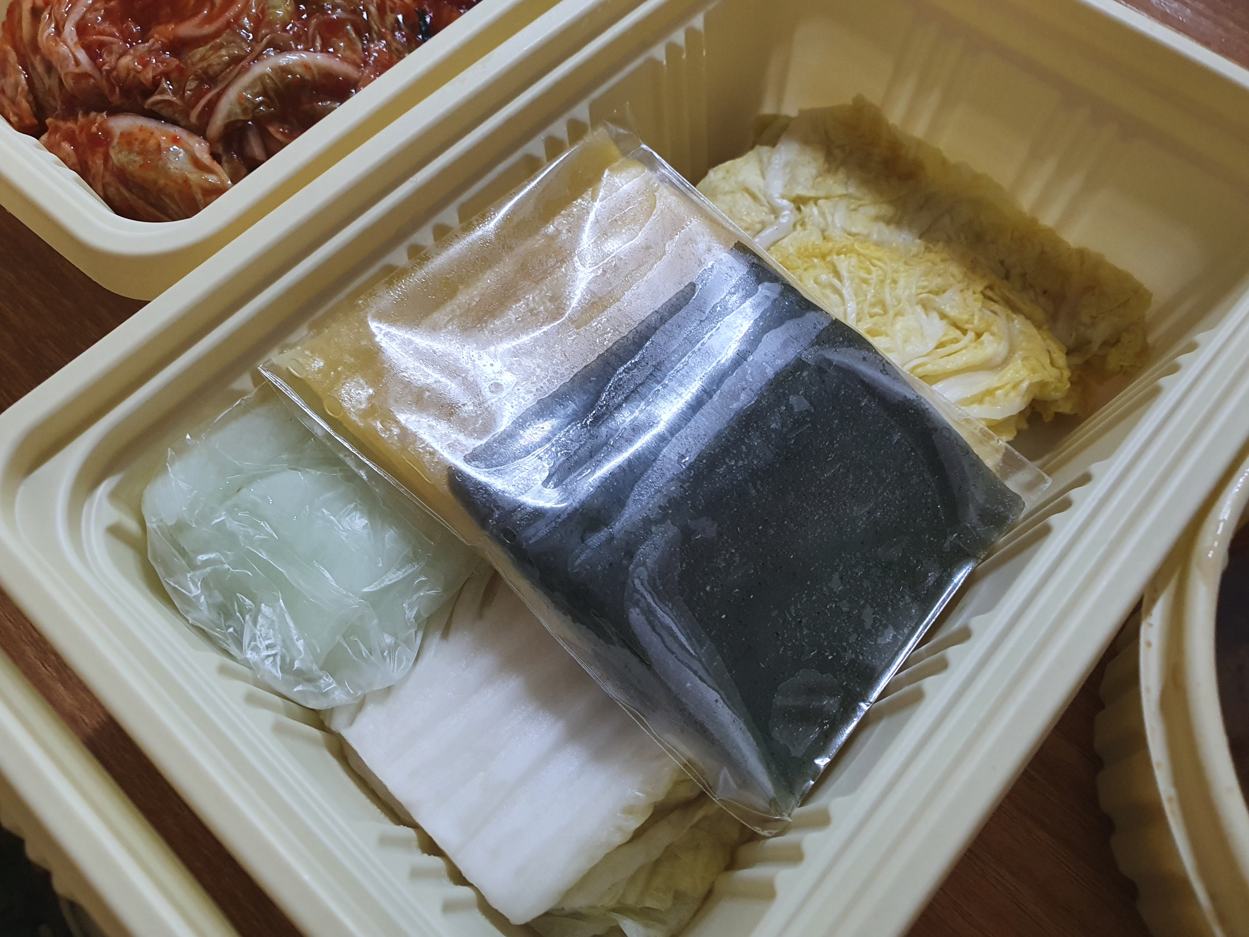 보쌈김치와 보쌈무는 같은 통에 담겨 있었습니다. 개인적으로 절인 배추쌈에 보쌈김치를 싸먹는 것 보다는 보쌈무를 넣어 싸먹는 것이 좋았습니다. 뭔가 보쌈김치와 절인 배추쌈은 겹치는 느낌이랄까?