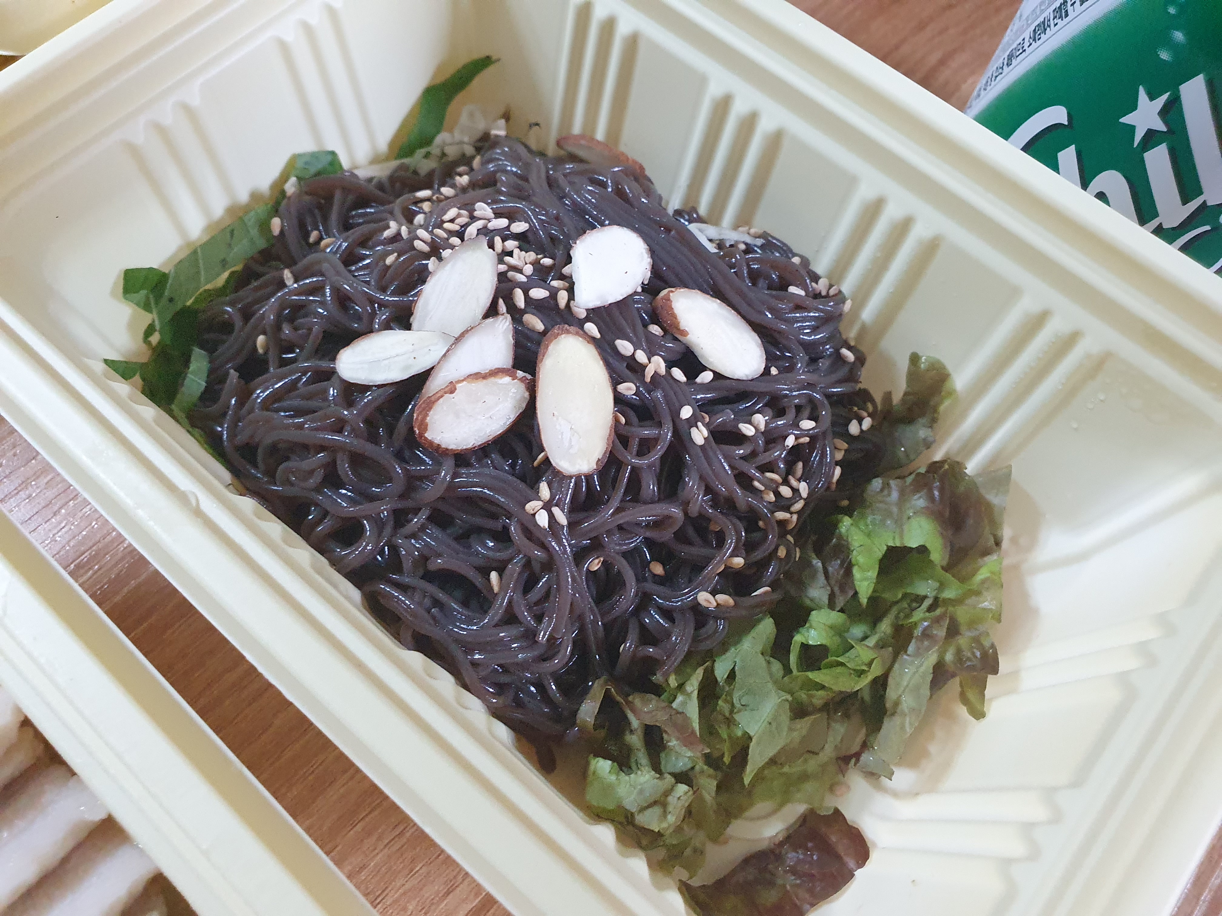 막국수는 위에 사진과 같이 상추에 면이 올라가 있었고 그 위에 깨와 아몬드가 올라가 있었습니다.