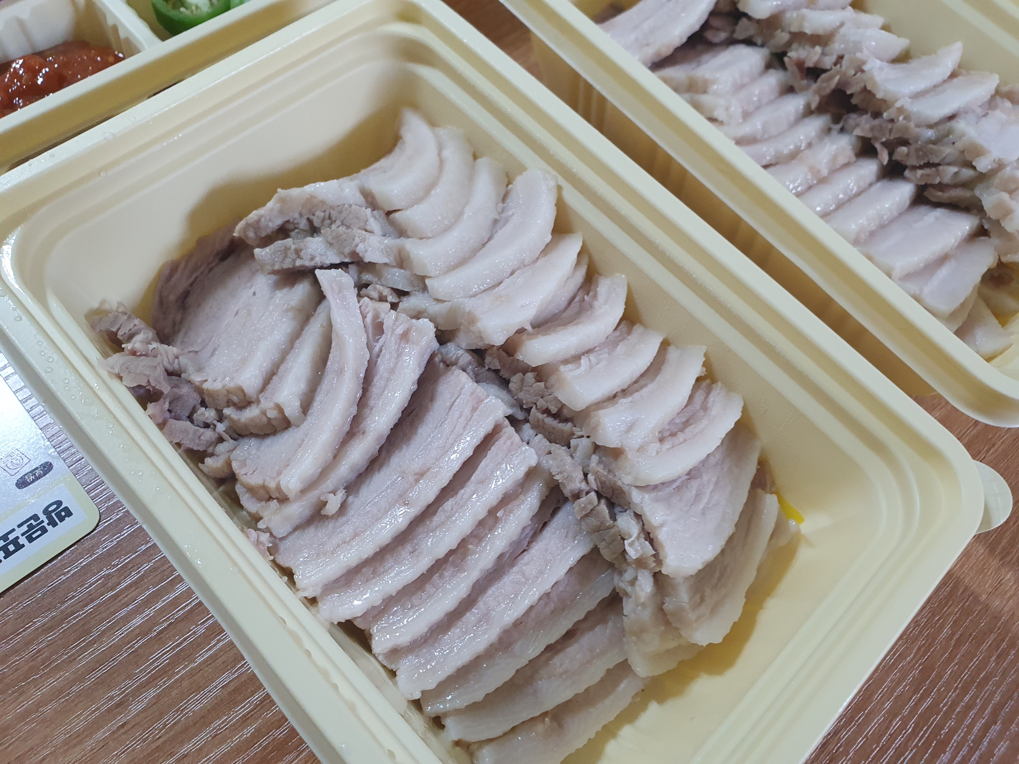 원할머니 보쌈(3~4인)의 고기는 2통에 담겨 있었습니다. 일단 한통은 뚜껑을 닫어 옆에 두었고 한통을 먼저 먹었습니다. 이렇게 한 통부터 먹으면 비교적 따뜻하게 먹을 수 있습니다.