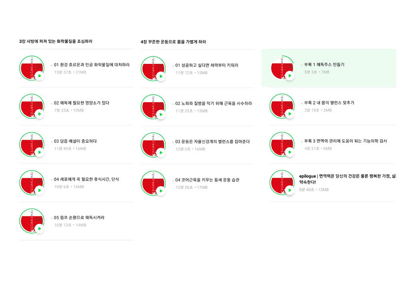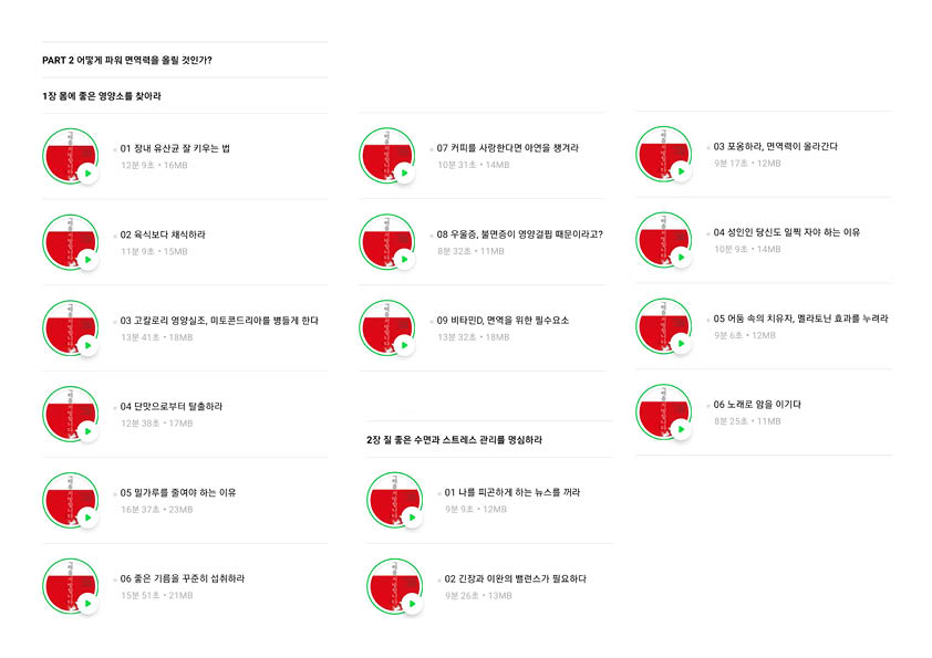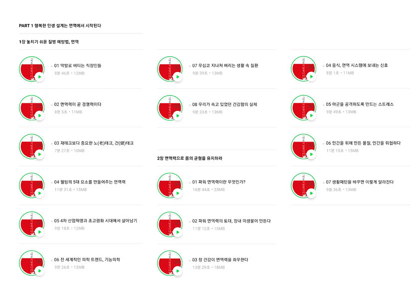 아래는 면역력을 처방합니다의 목차를 정리한 이미지 입니다. 윌라에서 캡쳐했는데 너무 밑으로 길어서 조금 정리해 보았습니다. 원하는 내용을 찾아서 들을 수도 있답니다.