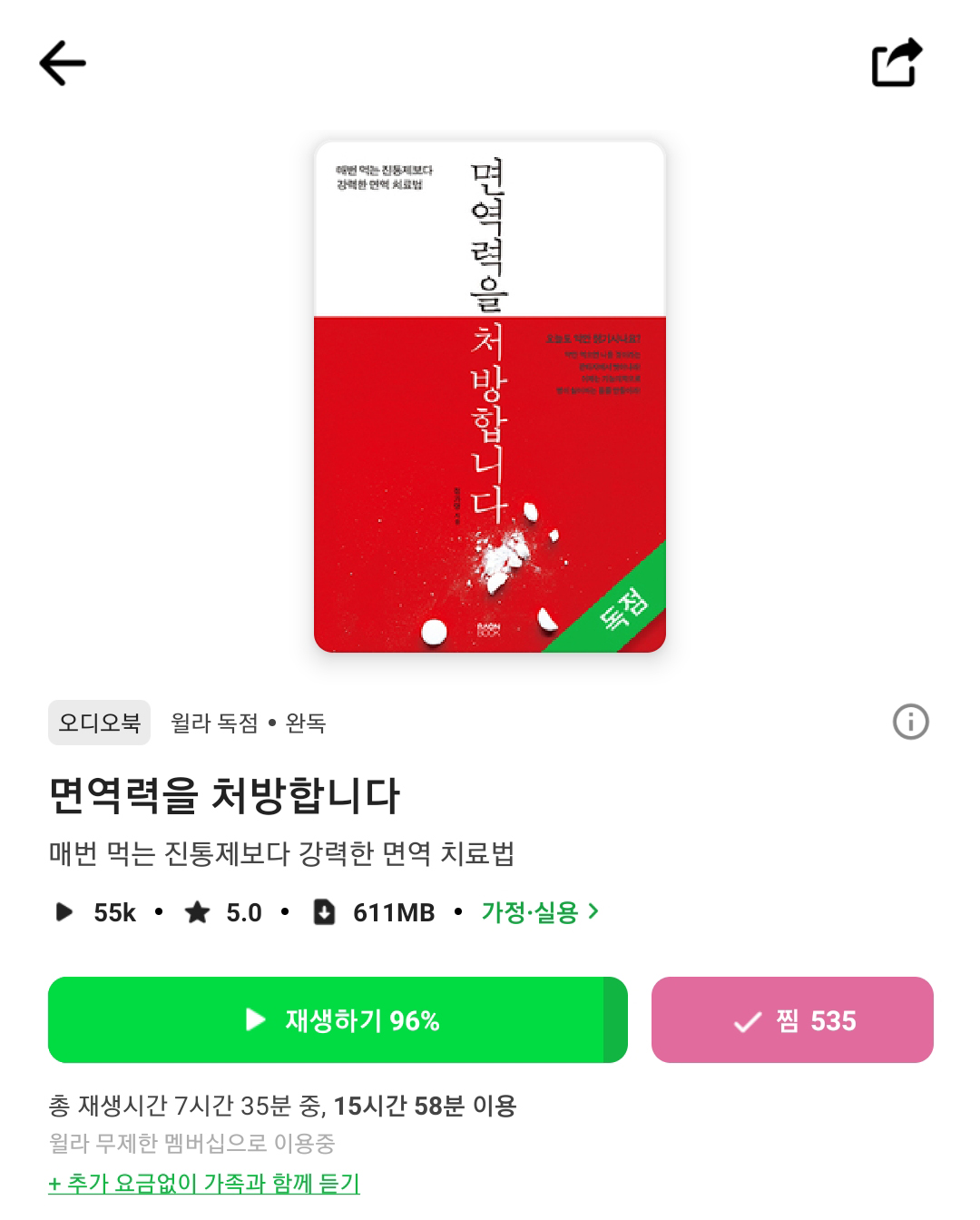 윌라 오디오북 '면역력을 처방합니다'는 매번 먹는 진통제보다 강력한 명역 치료법을 알려준다고 해서 처음 듣게 되었습니다. 찜만 해 두고 있다가 건강생각해서 듣자고 시작했는데! 생각보다 너무 좋았어요. 위에 사진보면 총 재생시간이 7시간 35분이라고 나와있는데 저는 15시간 58분 이용했네요 ㅋㅋㅋㅋ 듣고 또 들었다는 증거죠!!!