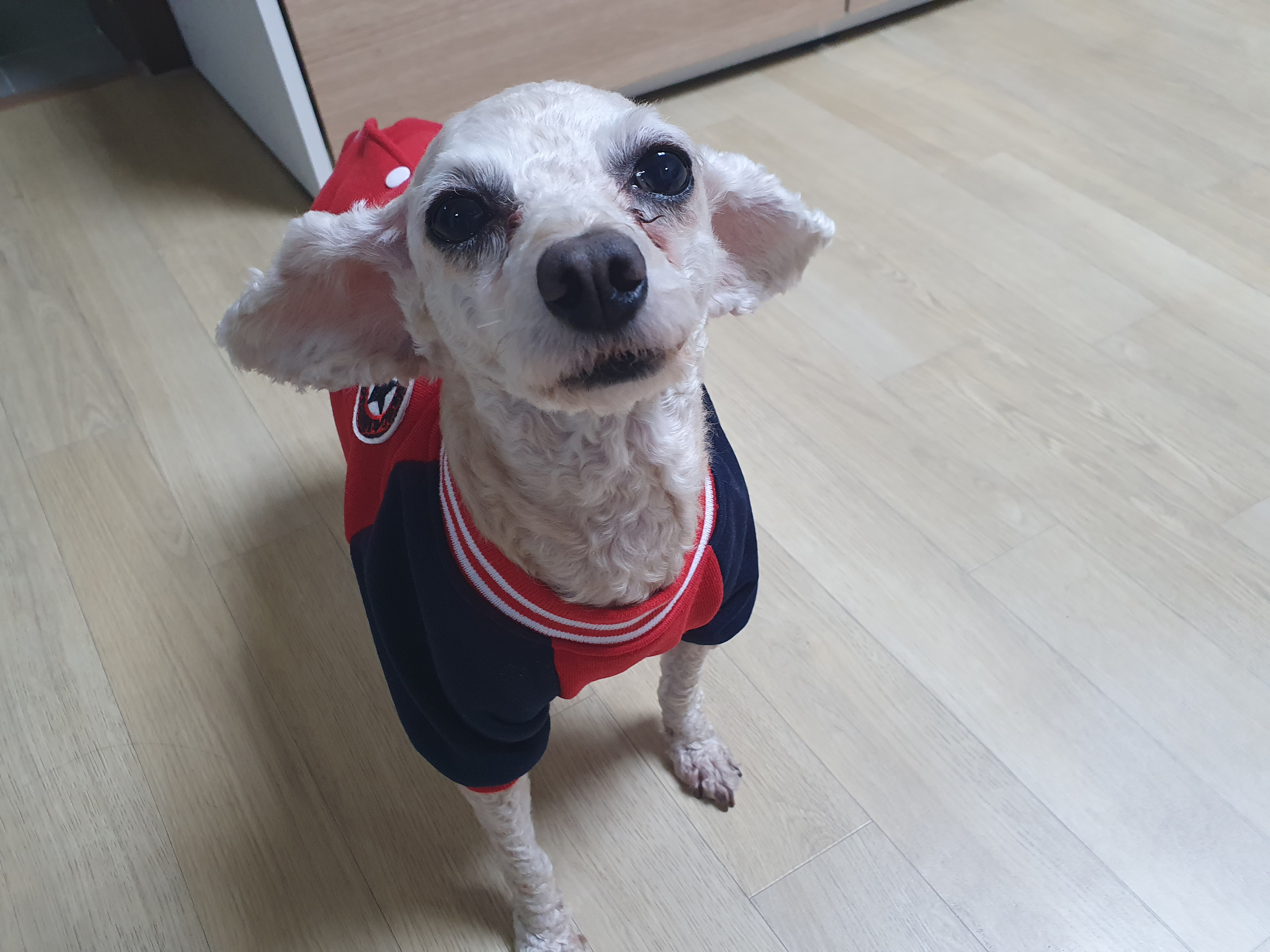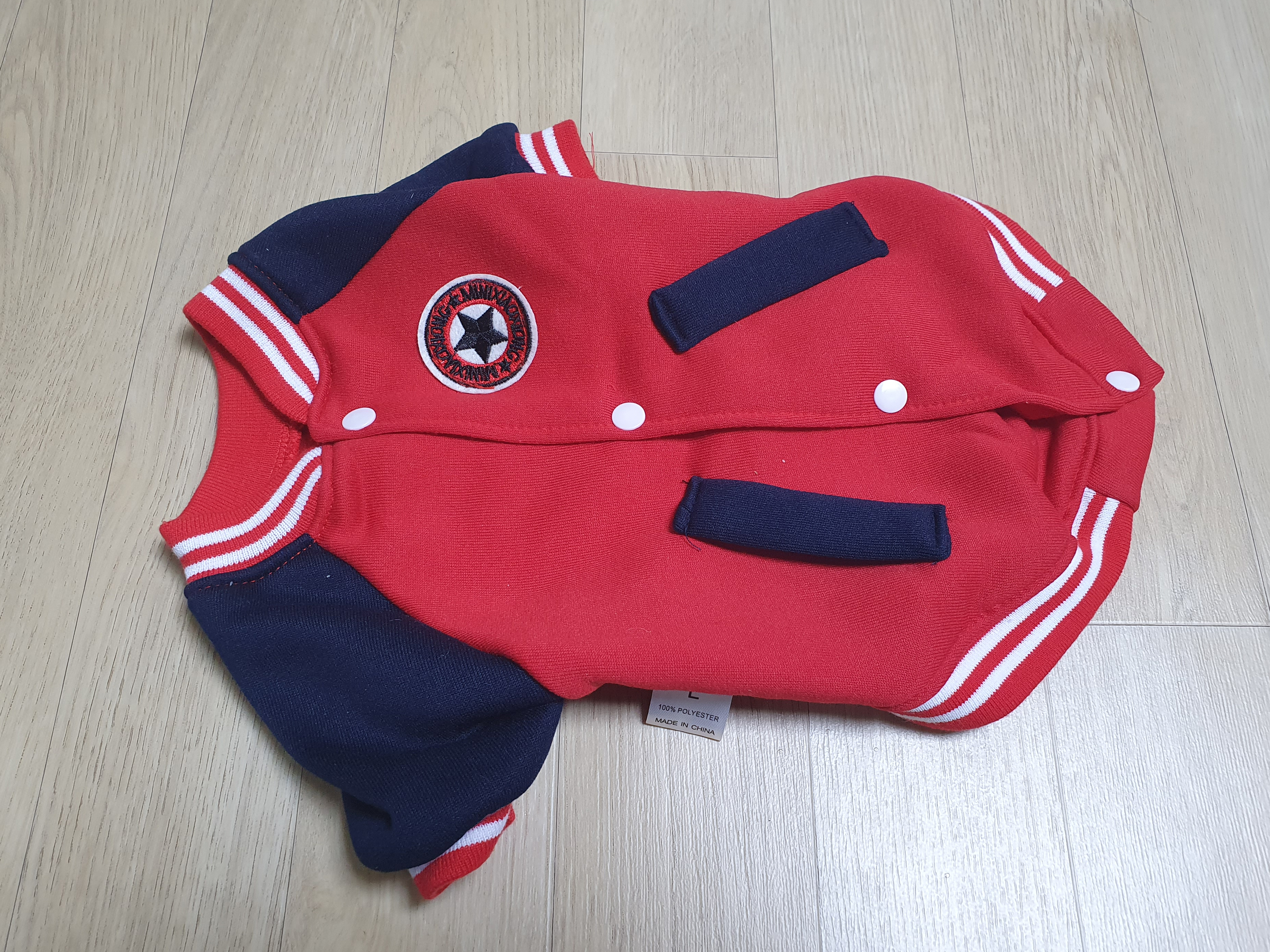 짠! 빨간색, 남색, 흰색이 들어간 강아지옷! 야구잠바 스타일로 대학생 같은 느낌을 주고 싶었습니다.ㅋㅋㅋㅋ