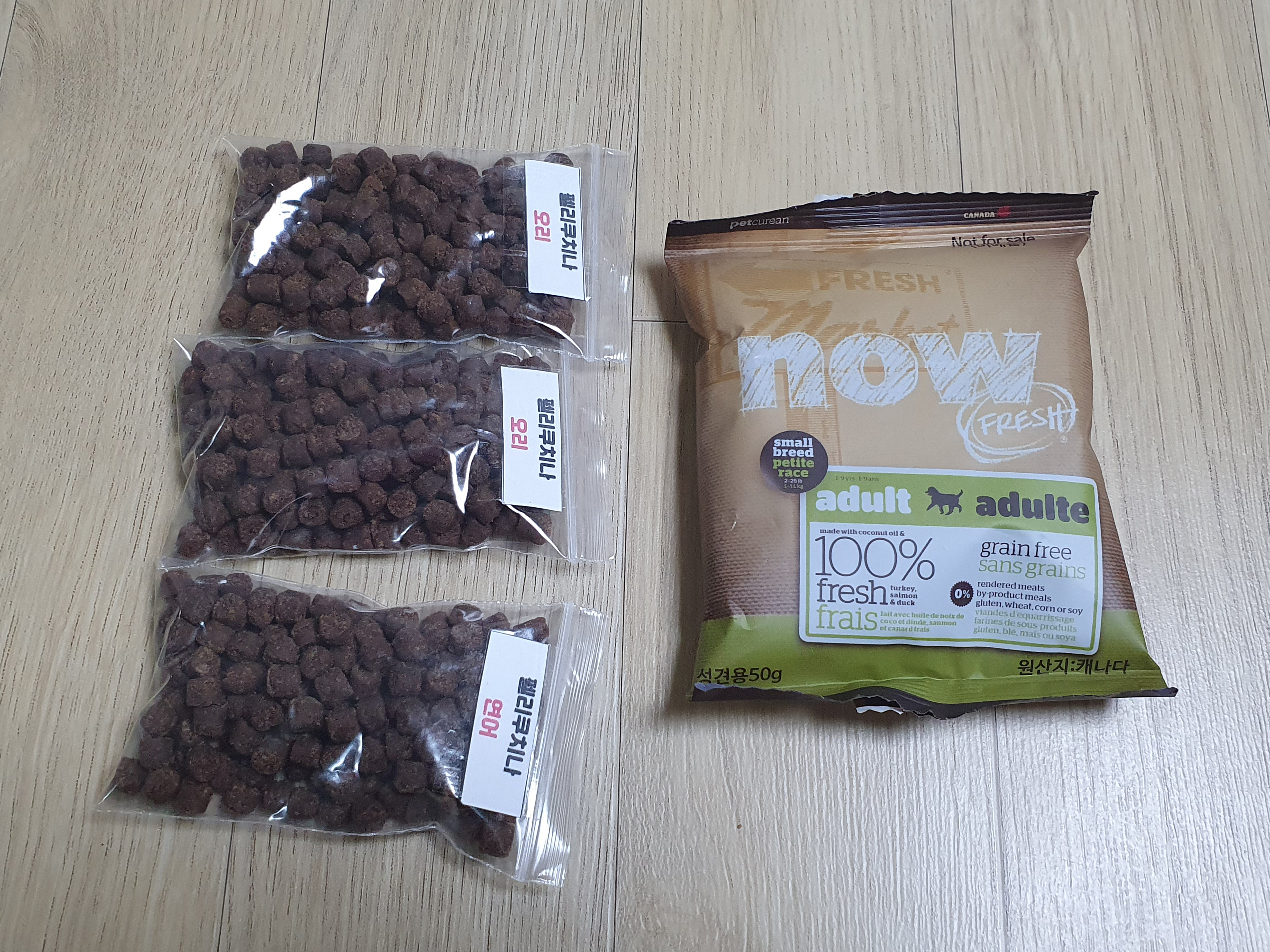 강아지 옷을 사며 받은 써비스~ 작은 지퍼팩에 든 펠리쿠치나 오리 X2, 연어 X1, now fresh 성견용 50g
