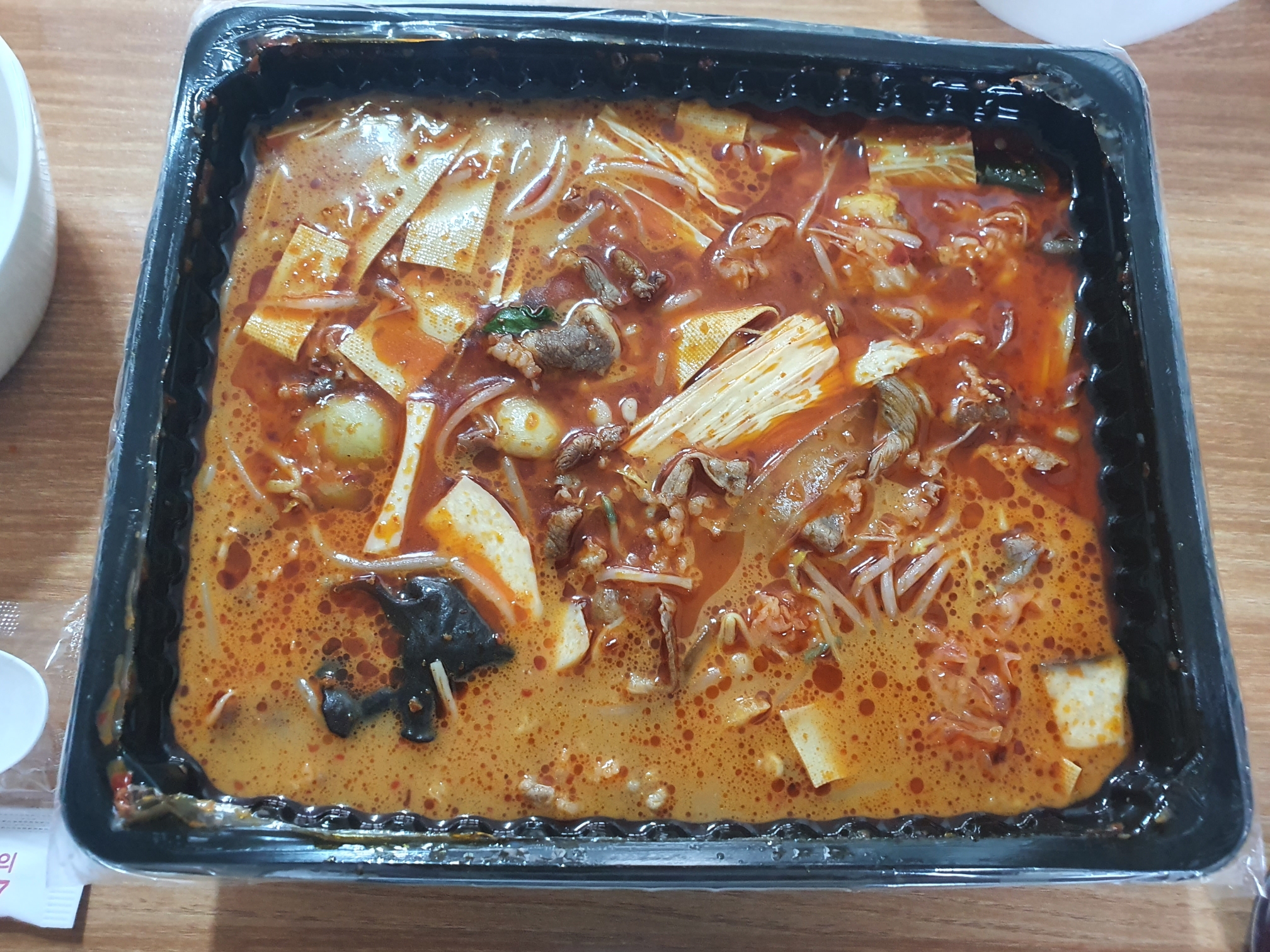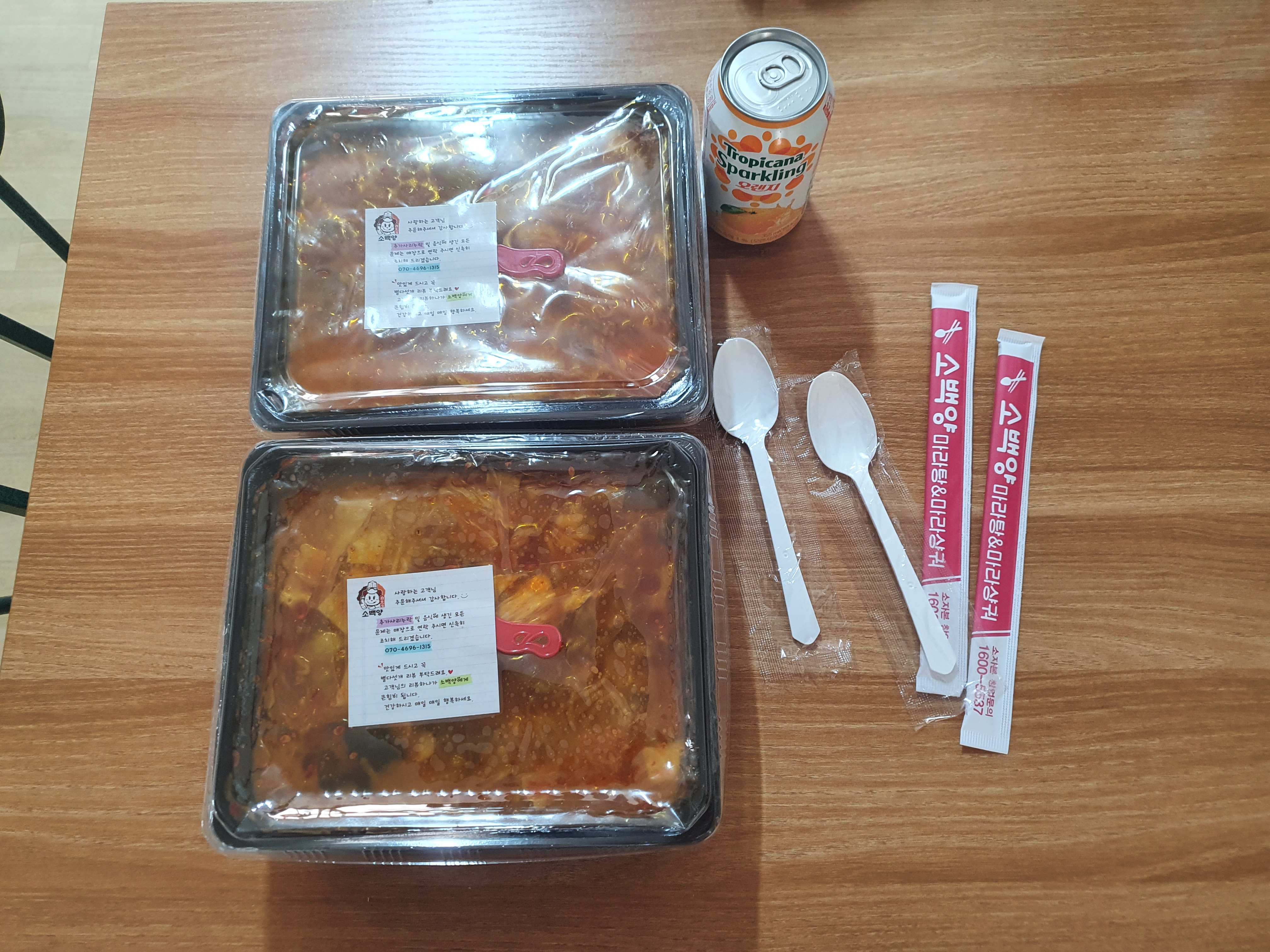 두둥! 포장이 너무 깔끔하게 되어있었습니다. 포장 뜯는 칼이 메시지 스티커에 붙어 있었고, 숟가락과 젓가락 2세트.. 솔직히 이 양을 둘이서 먹을 거라 생각하지는 않았을 것 같은데... 숟가락, 젓가락 2개씩 준 거 조금 서운하네요. 컨에 컵라면 먹을 때 남았던 나무젓가락을 꺼내 봅니다.