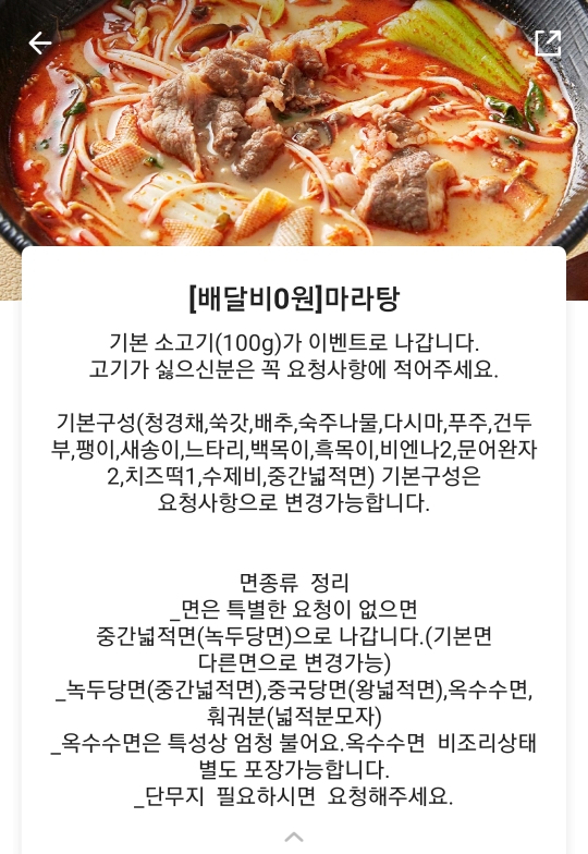 -마라탕 마라샹궈에는 기본 소고기 100g이 이벤트로 나가고 있습니다. 고기가 필요 없으신 분은 꼭 요청사항에 적어주세요. : 음... 개인의 취향이지만 고기가 왜 필요가 없을까요...?ㅋㅋㅋ 알레르기 있는 분인가... 저는 추가했어요ㅋㅋㅋ