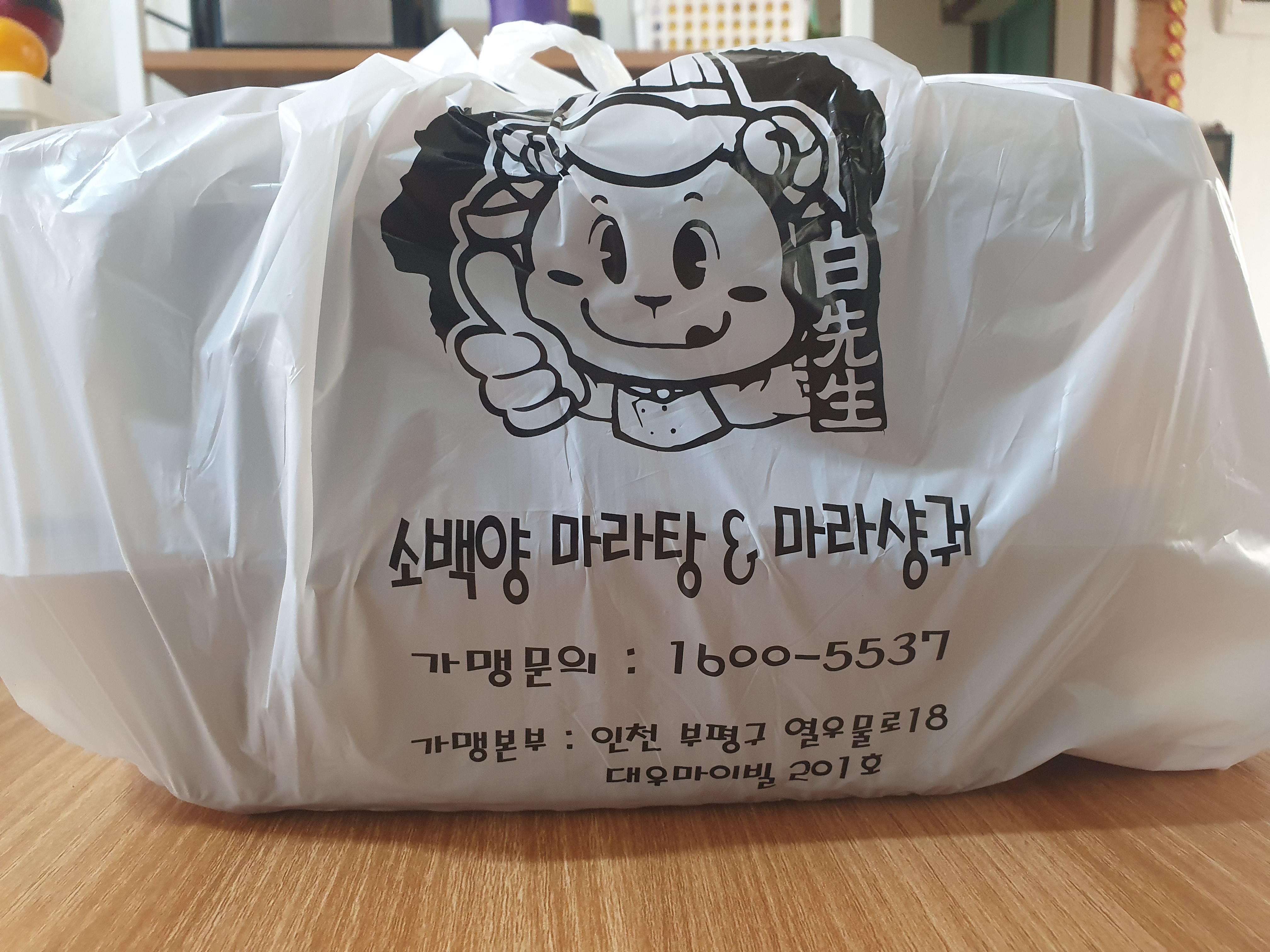 소사동 마라탕 맛집 소백양 마라탕&마라샹궈 소사점 비닐봉지는 위에 사진과 같은 캐릭터와 정보가 있었습니다. 가맹문의 가맹본부가 있는 것으로 보니 본사에서 지급되는 비닐인가 봐요~ 그건 중요한 게 아니니 빠르게 패스~