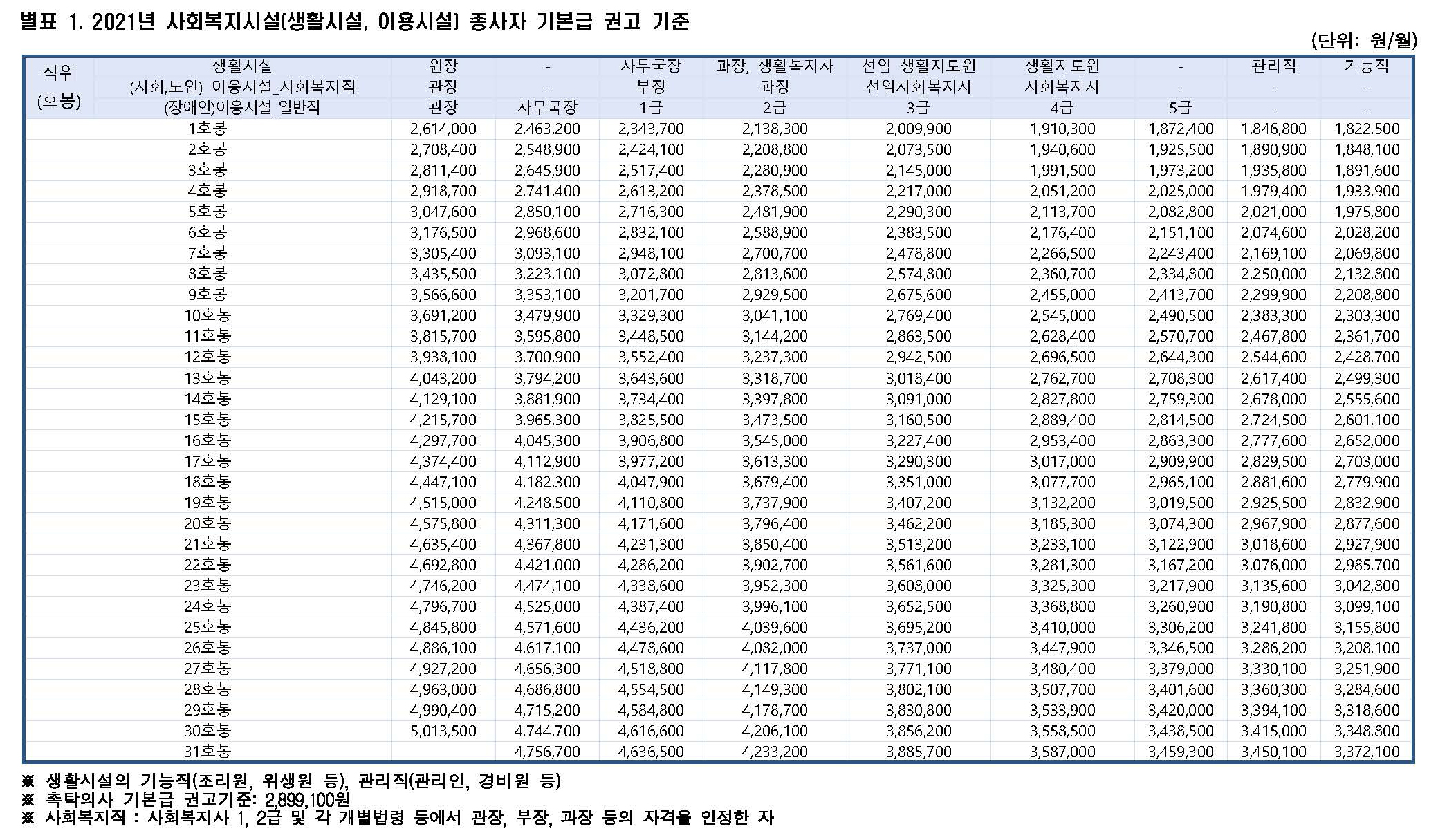 아래 내용은 2021년 사회복지시설 종사자 보수 체계에 관련된 내용입니다.