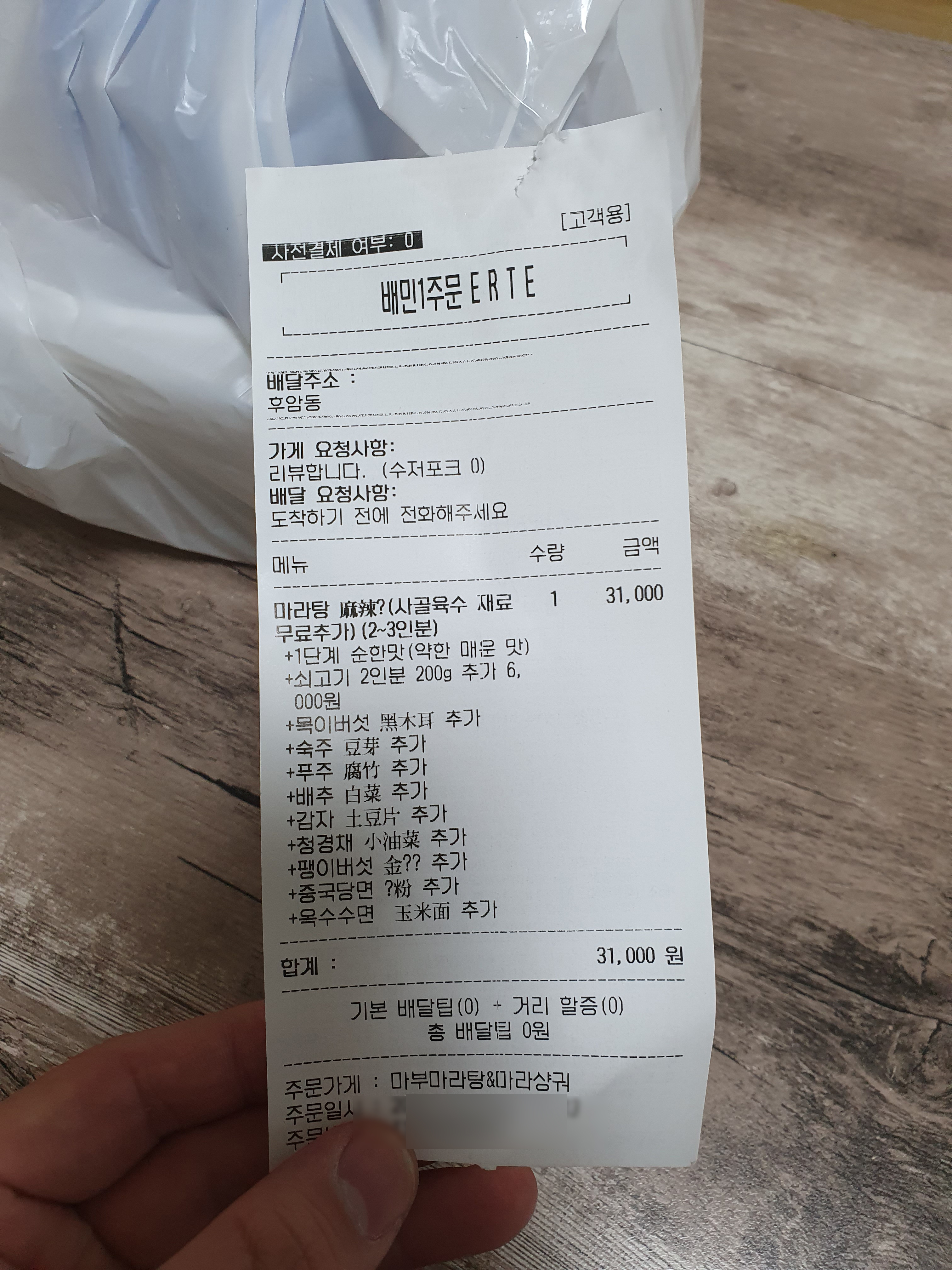 동대문역사문화공원역 맛집 마부마라탕&마라샹궈에서 주문한 내용은 위에 사진과 같습니다. 마라탕 순한 맛에 쇠고기 2인분, 목이버섯, 숙주, 푸주, 배추, 감자, 청경채, 팽이버섯, 중국 당면, 옥수수 면을 추가해 총금액이 31,000이 나왔습니다.