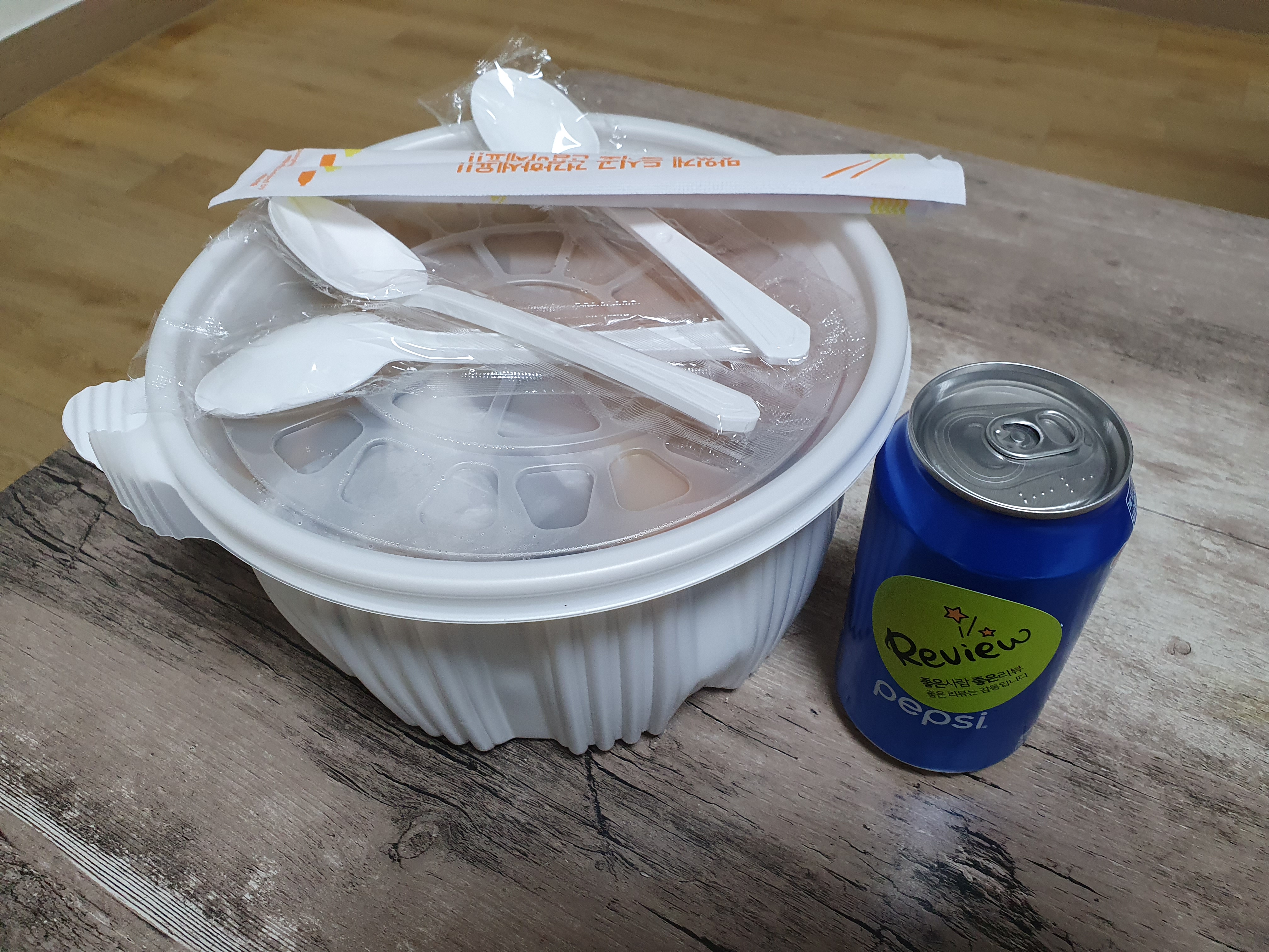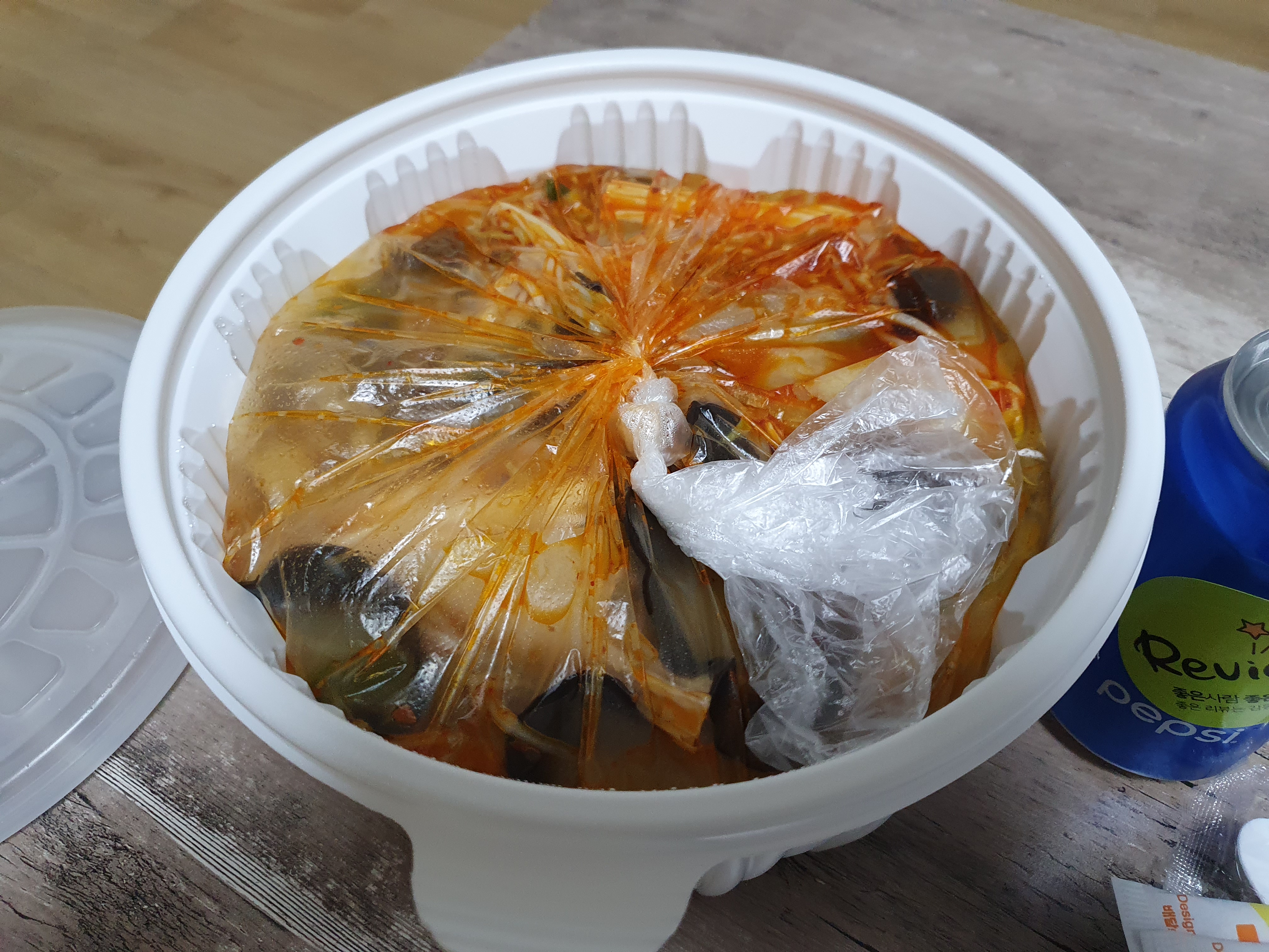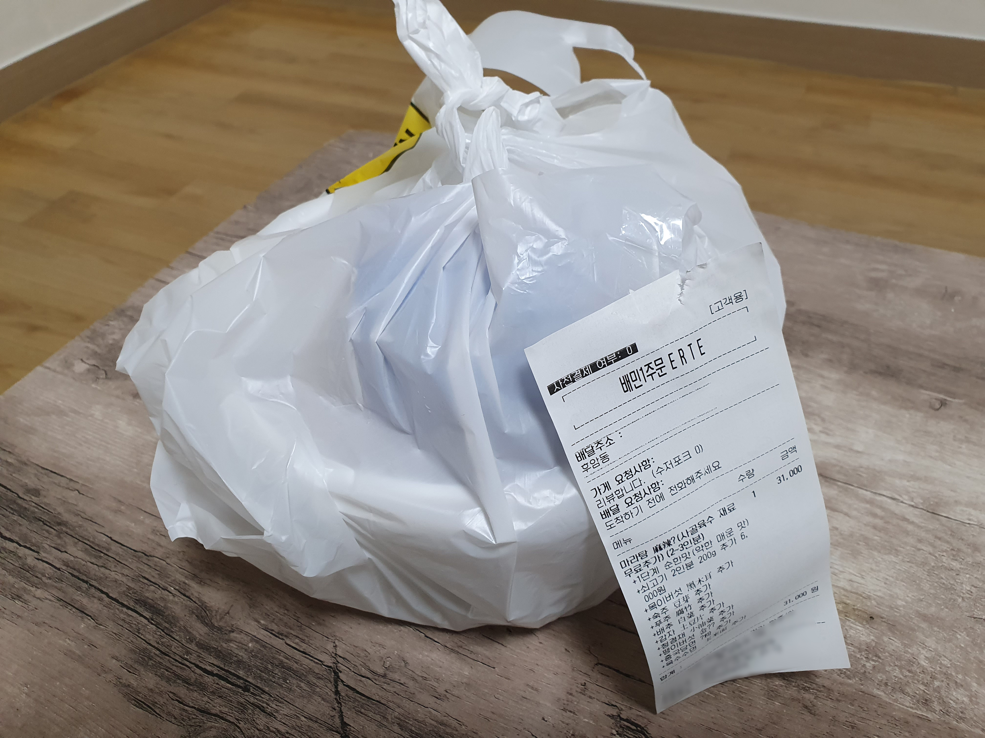 흰 비닐에 큰 통과 숟가락, 젓가락, 콜라가 담겨 묶여있었습니다. 그리고 겉에는 주문한 내역을 있는 영수증이 붙어있었습니다.