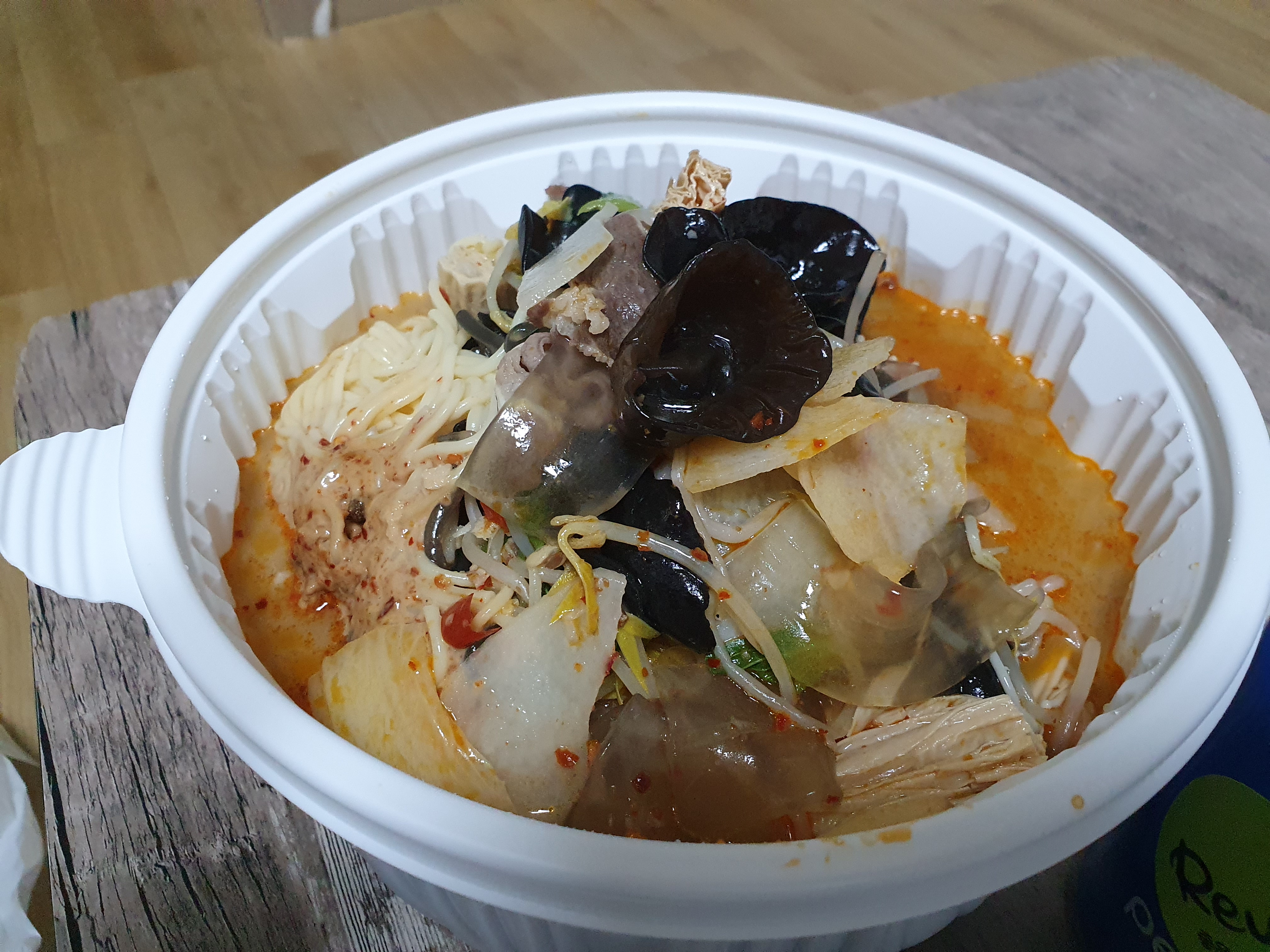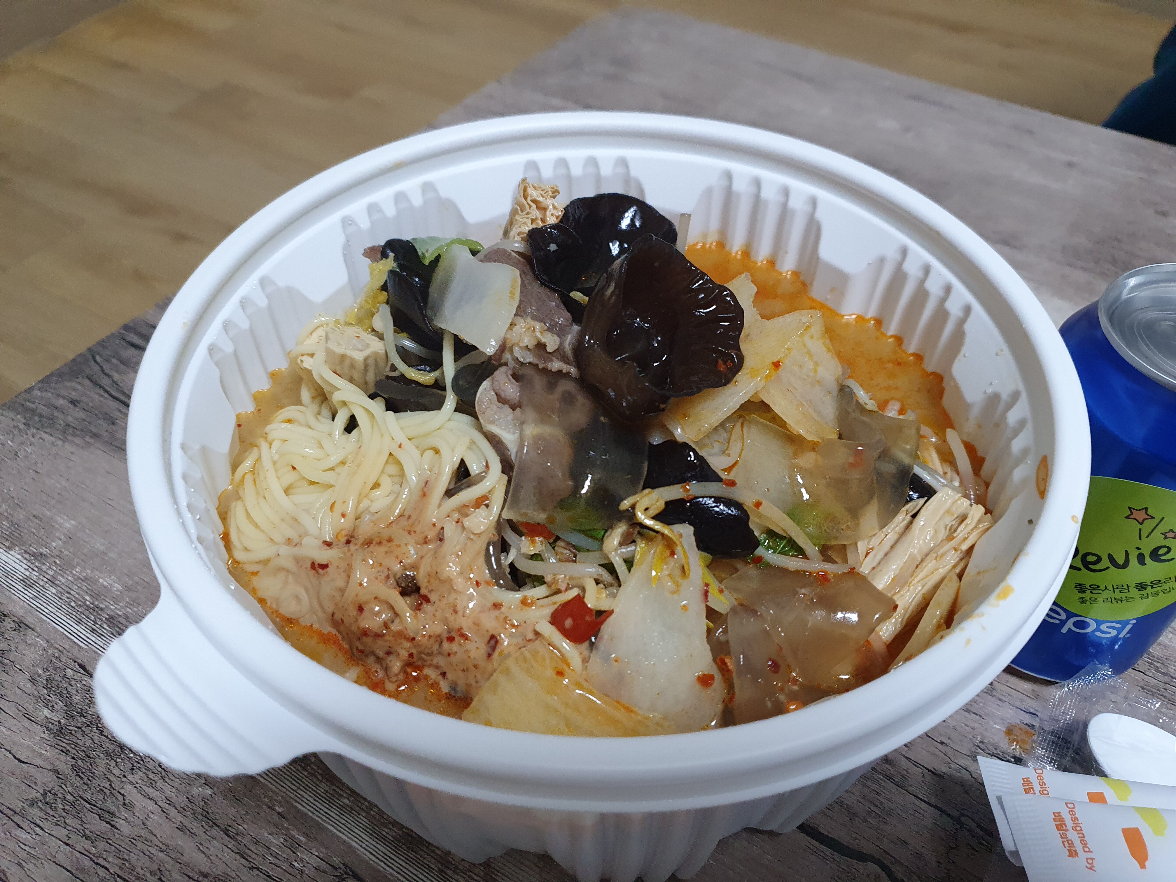 비닐에서 나온 마라탕! ㅋㅋㅋ 처음에 살짝 국물 적은 느낌이 들었지만 먹다 보니 적지 않았습니다. 그리고 옥수수 면이 불었나? 했는데 이 또한 괜찮았습니다.