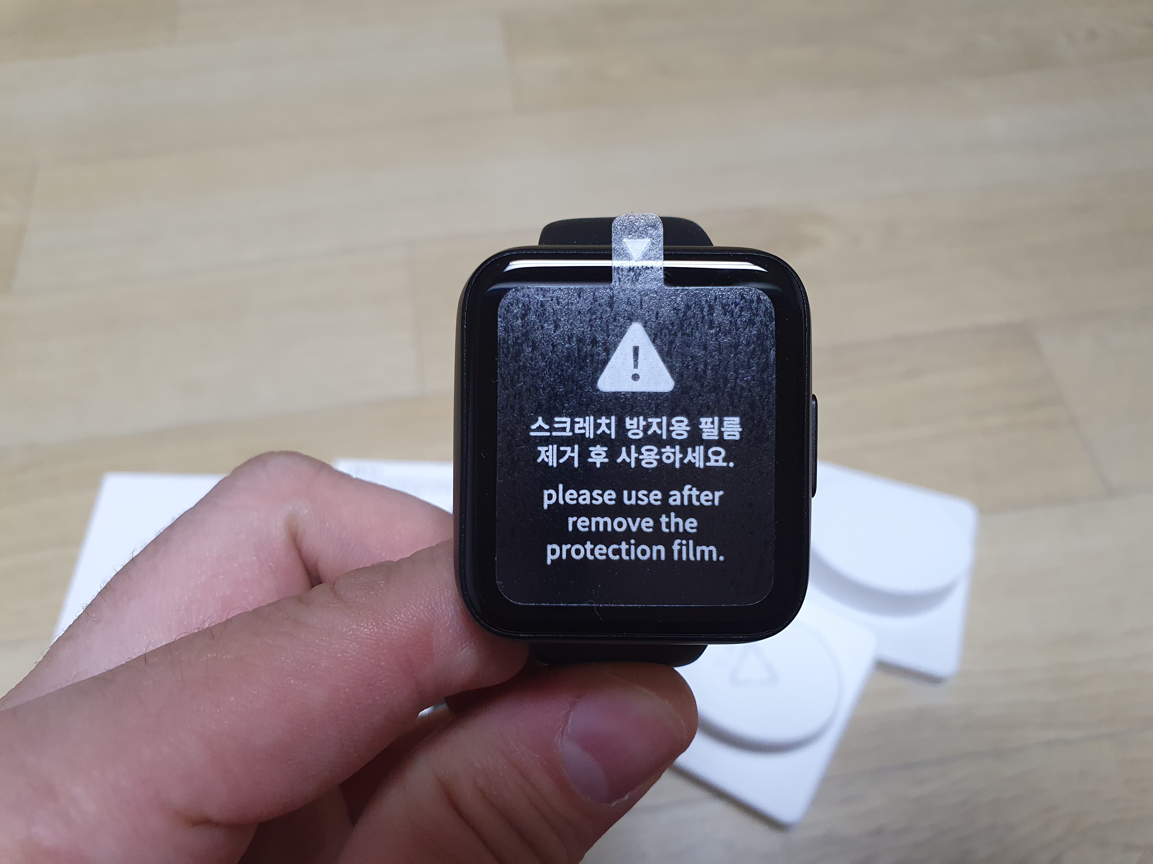 온서울건강온의 스마트 밴드 (스마트 워치)는 위에 사진과 같이 스크레치 방지용 필름이 붙어 있는 상태로 들어있었고, 스크레치 방지용 필름을 제거 후 사용하면 됩니다.