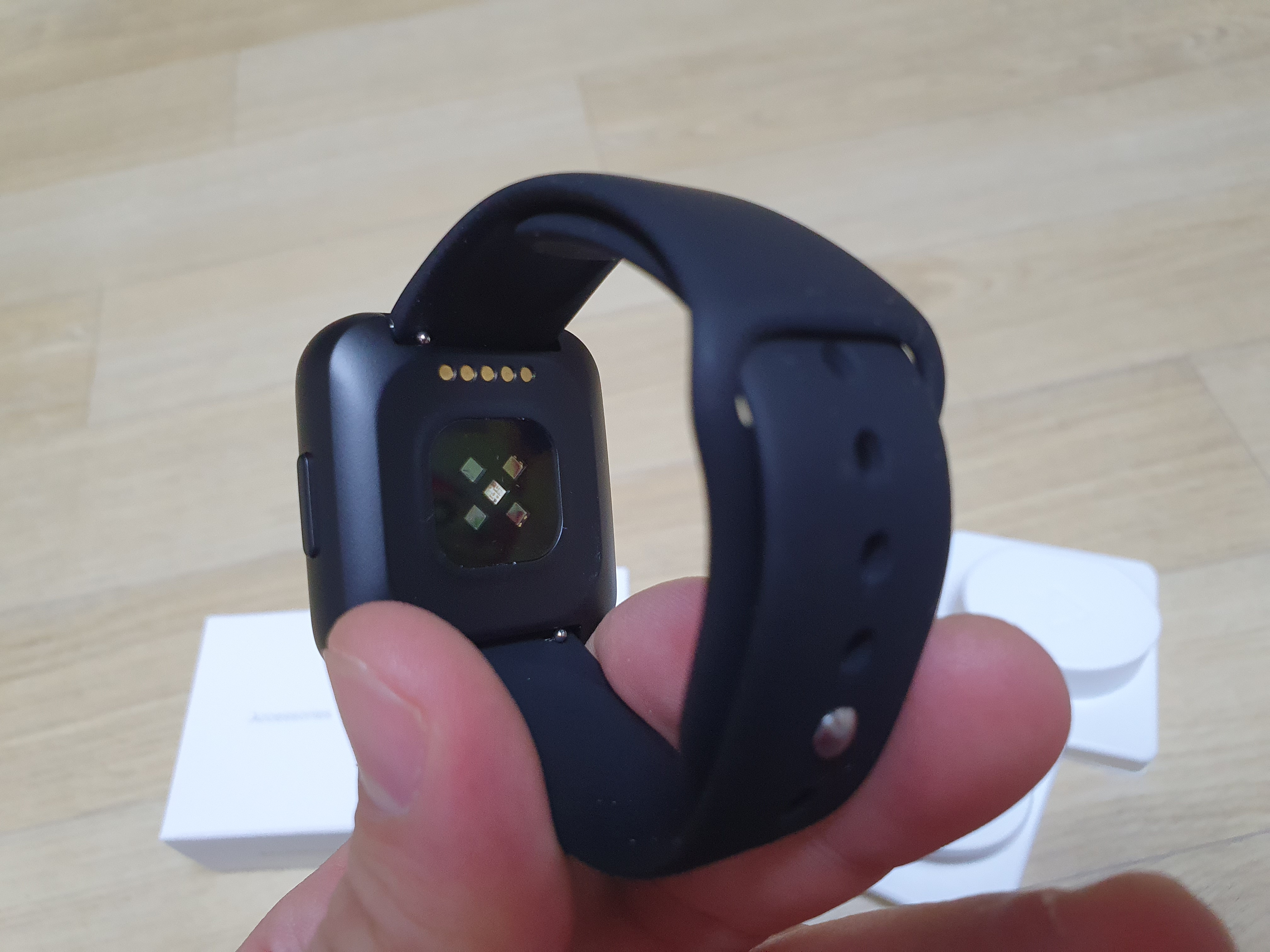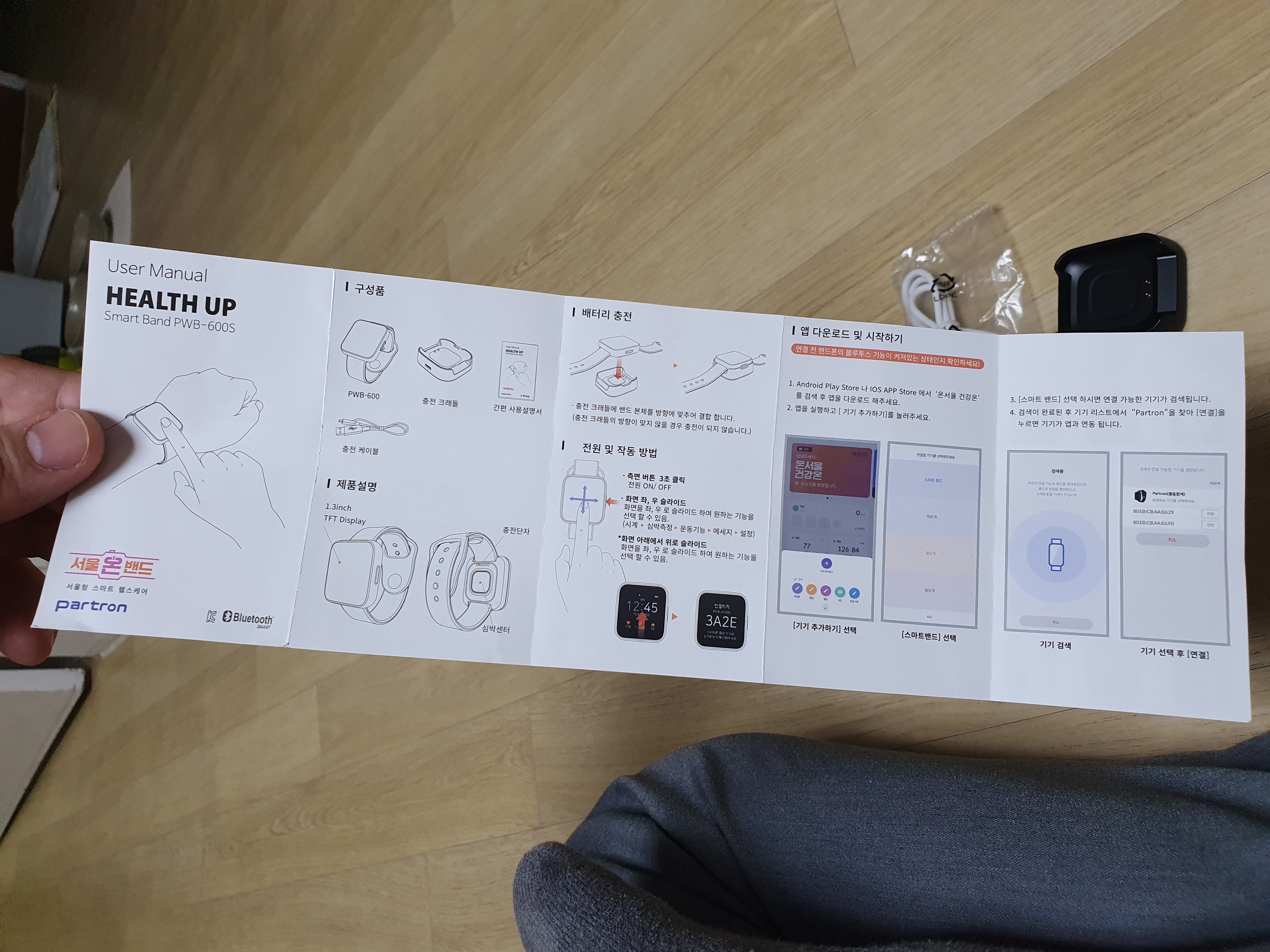 상자를 열면 위에 사진과 같이 나옵니다. 작은 상자, 간편 사용 설명서, 스마트 밴드 (스마트 워치)가 있고, 작은 상자를 열면 충전 케이블과, 충전 크래들이 들어있었습니다.