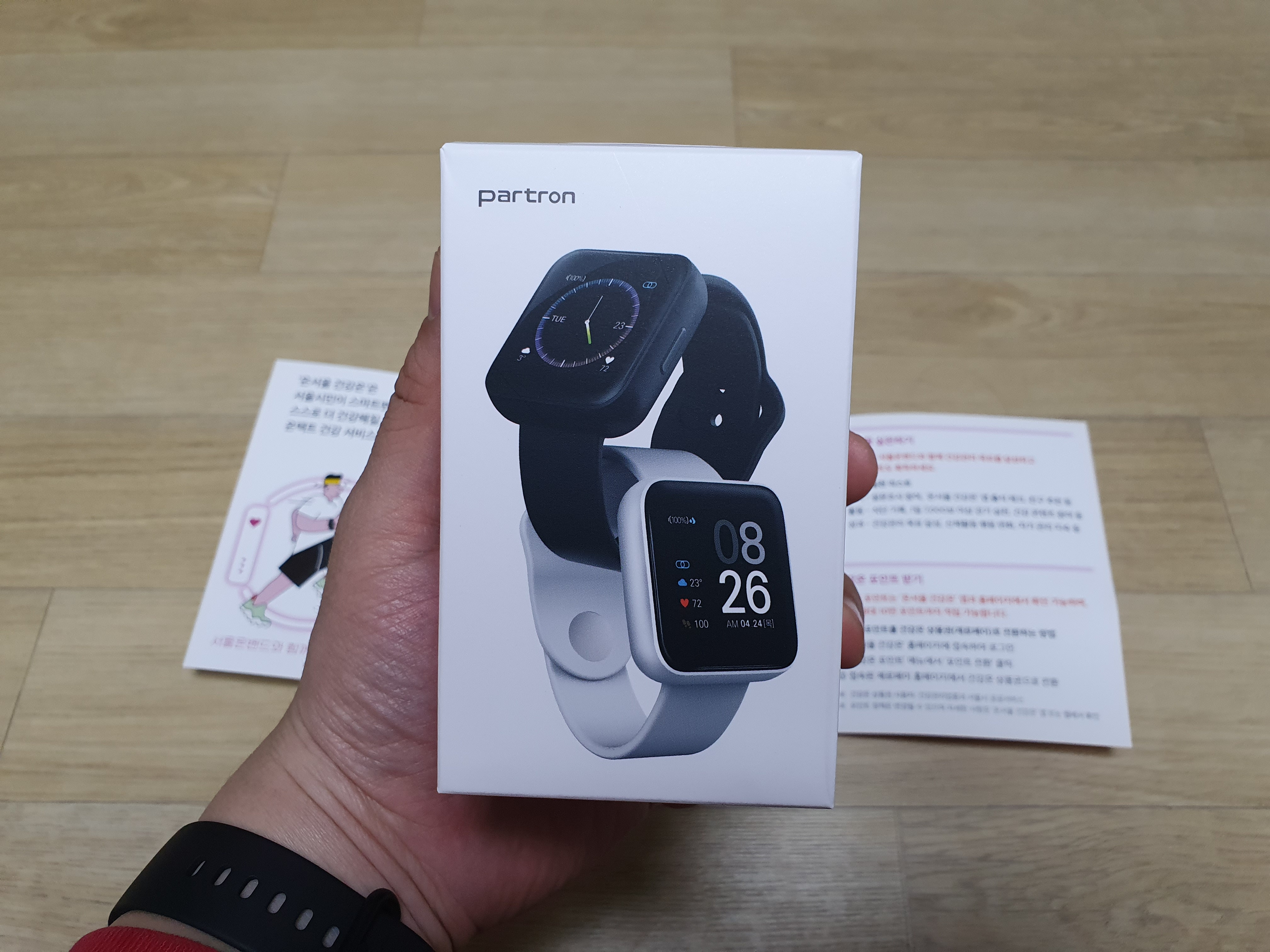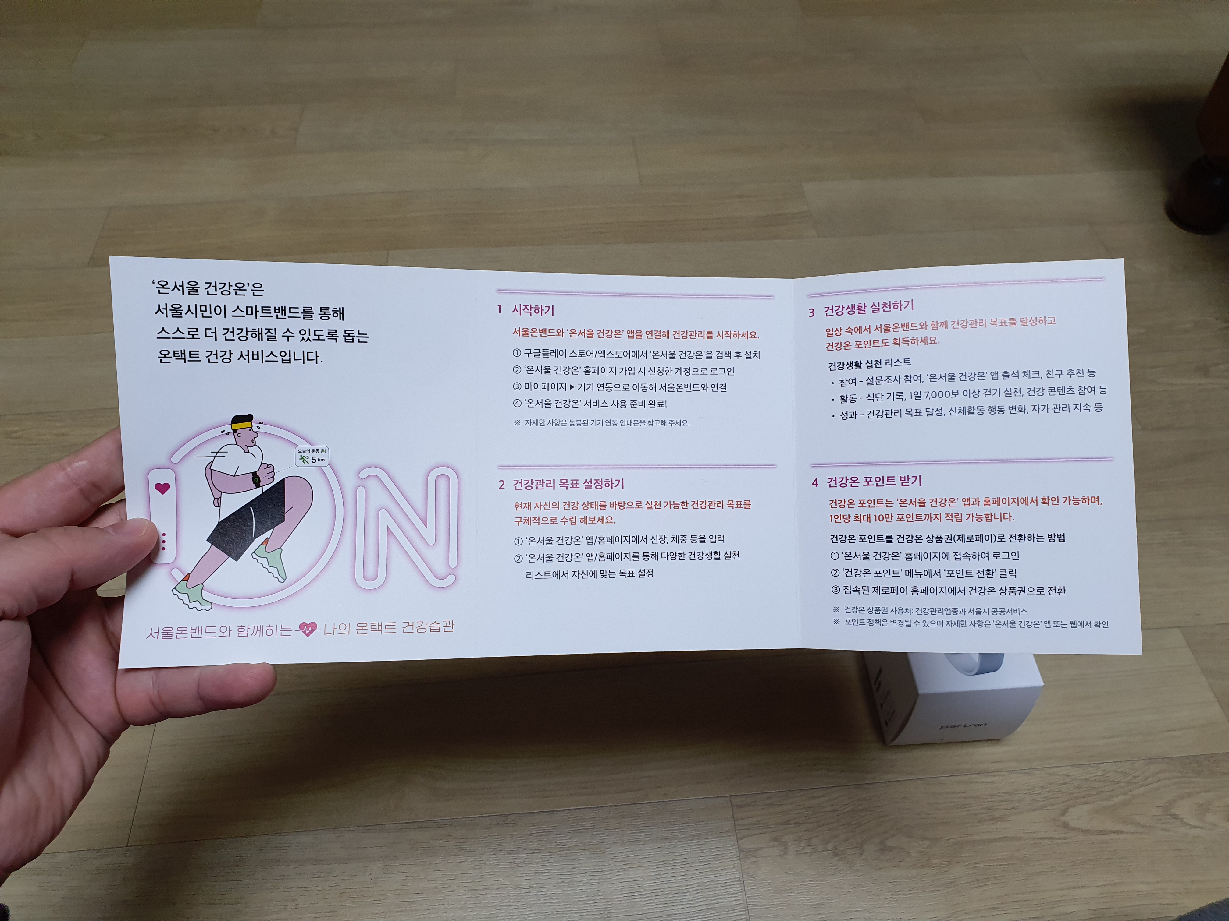 온서울건강온으로 신청한 스마트 밴드 (스마트 워치)는 택배로 배송되었고 도착한 후 박스를 뜯으면 위에 사진과 같이 나옵니다. 온서울건강온 서비스 가이드와 선택한 스마트 밴드 (스마트 워치)를 하나씩 살펴보겠습니다.