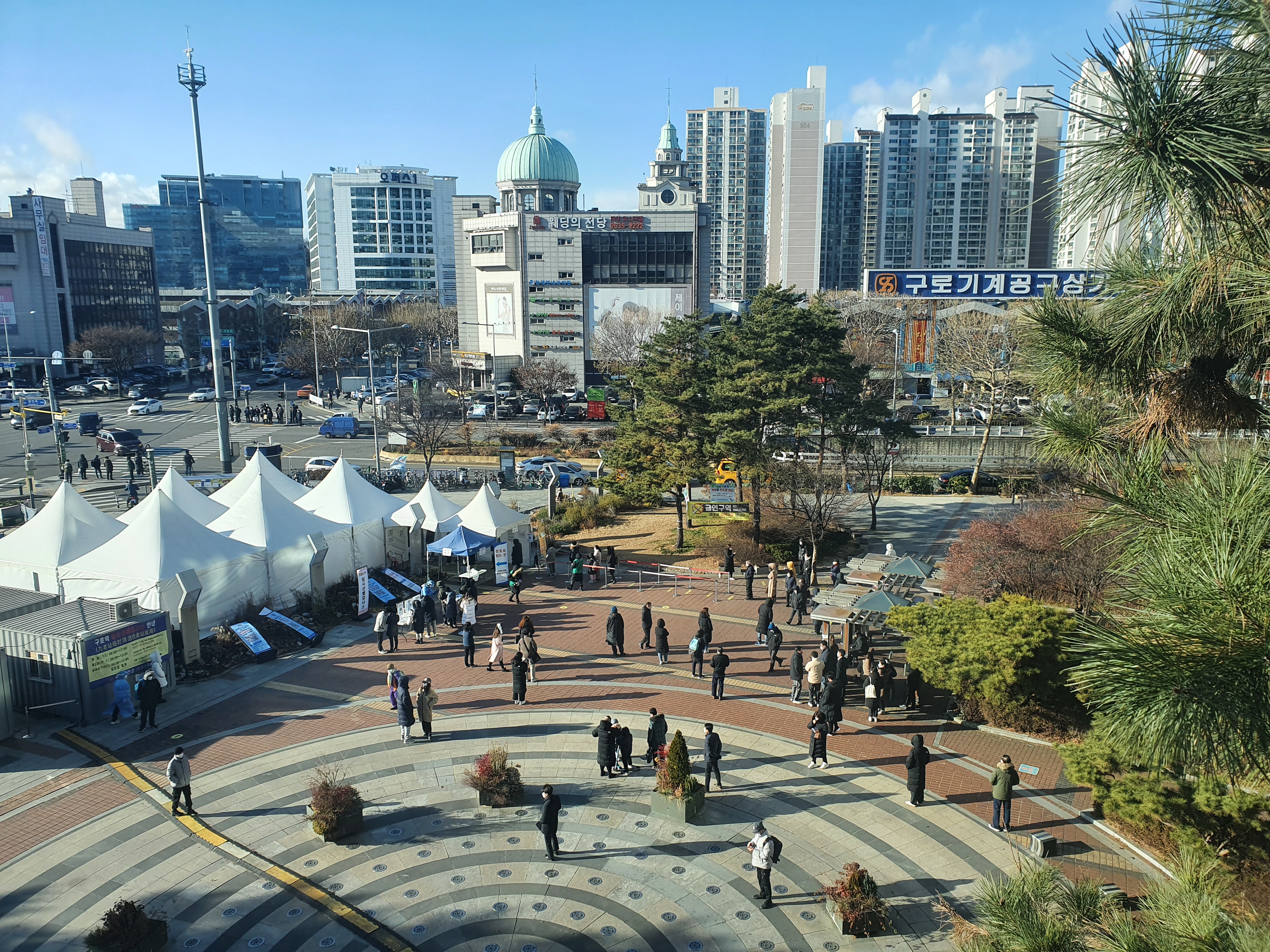 구로역에 도착했습니다. 아래 사진은 구로역에서 내려 본 구로역 임시 선별진료소입니다. 많은 사람들이 번호표를 뽑고 광장에 흩어져 번호가 되기를 기다리고 있습니다.