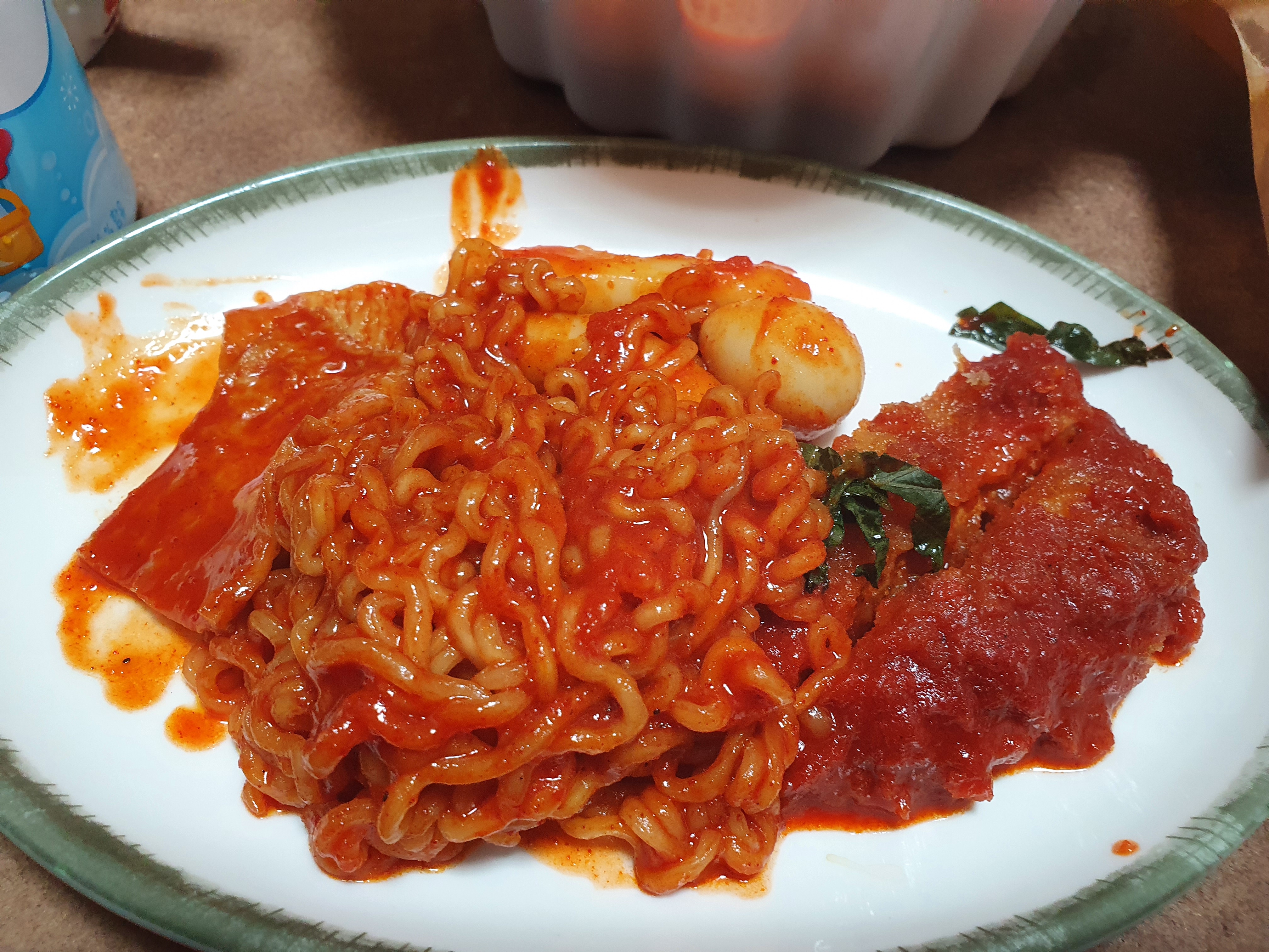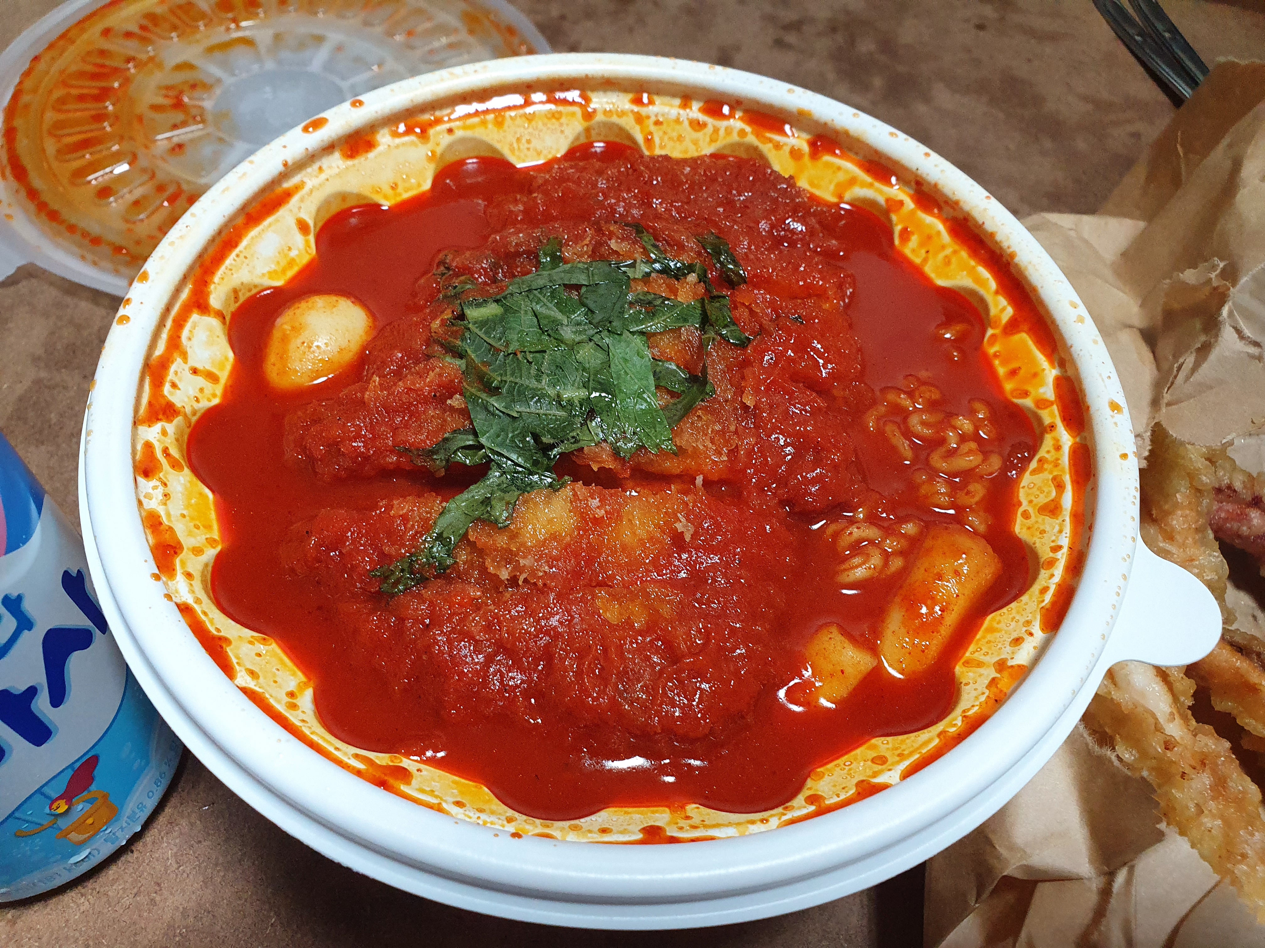 수제돈까스떡볶이 매콤달콤 맛있었지만 조금 아쉬운 것은 면이 약간 불었고... 수제돈까스는 떡볶이의 국물을 다 흡입해 수제돈까스인지 그냥 돈까스인지 알 수가 없었습니다. 면이 불지 않았다면... 그리고 수제돈까스가 따로 포장되어 와 먹기 전에 투입시키거나 찍어 먹었다면 더 좋았겠다는 생각이 들었습니다. 조금 아쉬웠지만 맛있게 잘 먹었어요. 손이가요 손이가 수제돈까스떡볶이에 손이가요 ㅋㅋㅋㅋ 굿굿!!