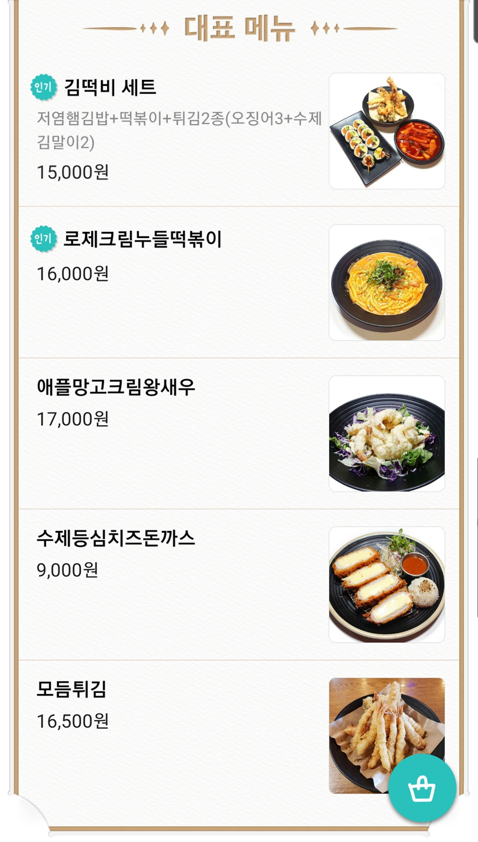 위에 사진에서 확인 할 수 있듯이 대표메뉴로는 김떡비세트 로제크림누들떡볶이 애플망고크림왕새우 수제등심치즈돈까스 모듬튀김이 있었습니다.