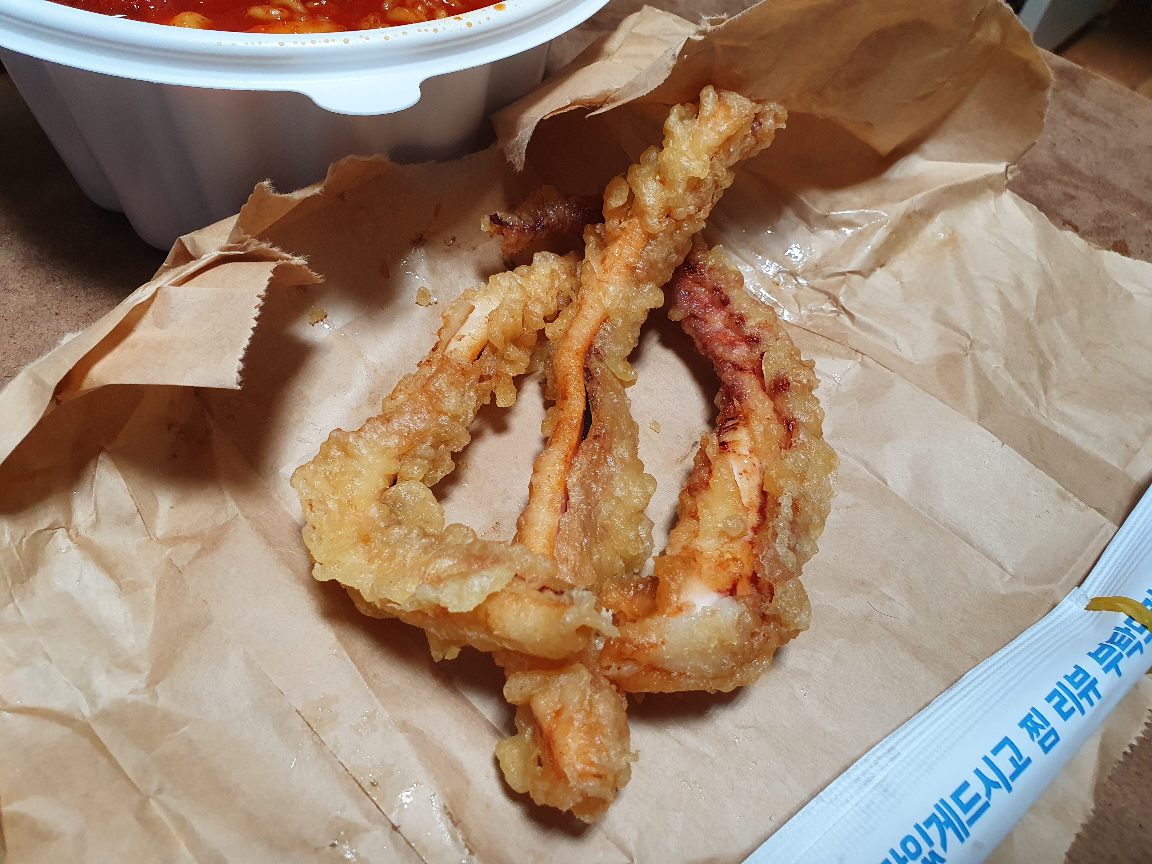 왕오징어튀김 탱탱하고 쫀쫀한 오징어에 바삭한 튀김옷!!! 큼직한 사이즈가 너무 좋았습니다. 그냥 먹어도 맛있고, 간장에 찍어먹어도 맛있고, 떡볶이 국물에 찍어먹어도 맛있었습니다.