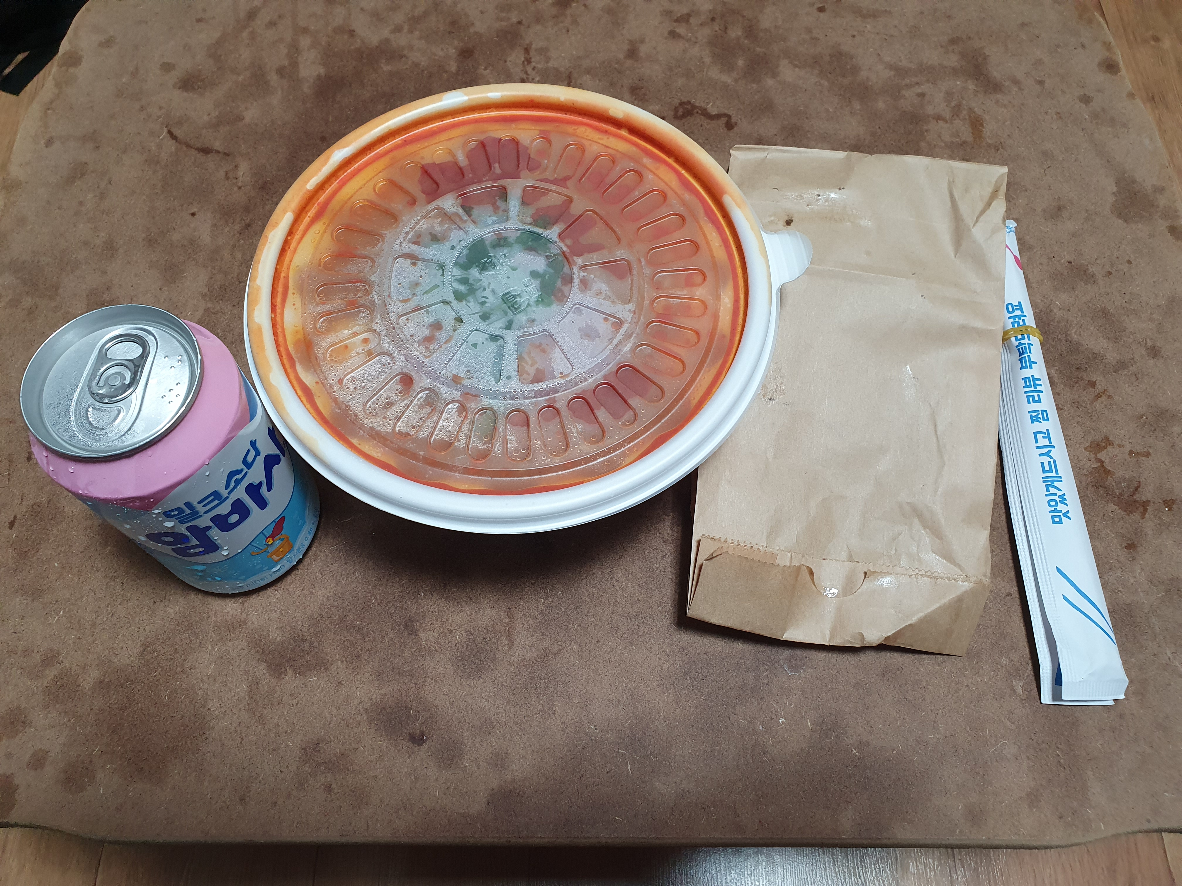 꺼내보면 위에 사진에서 확인할 수 있듯이 암바사 캔 개, 수제돈까스떡볶이, 왕오징어튀김, 젓가락 두개가 왔습니다. 혹시나 해서 설명하는데... 상... 시트지가 너덜너덜해서 뜯었고... 자꾸 얼룩이 생기는데... 저거 깨끗하게 트리오로 문지르고 물로 헹군거랍니다. 깨끗해요.