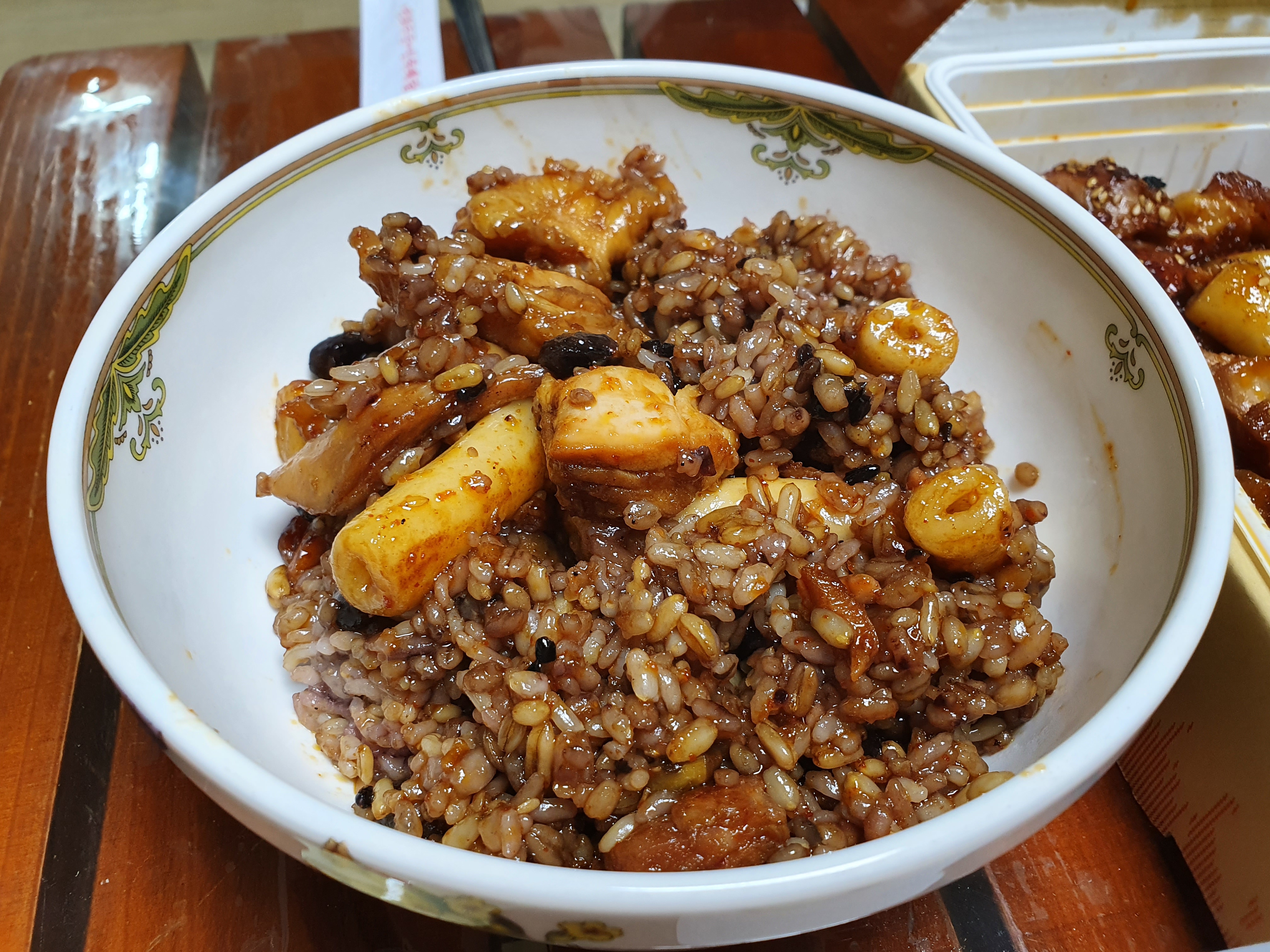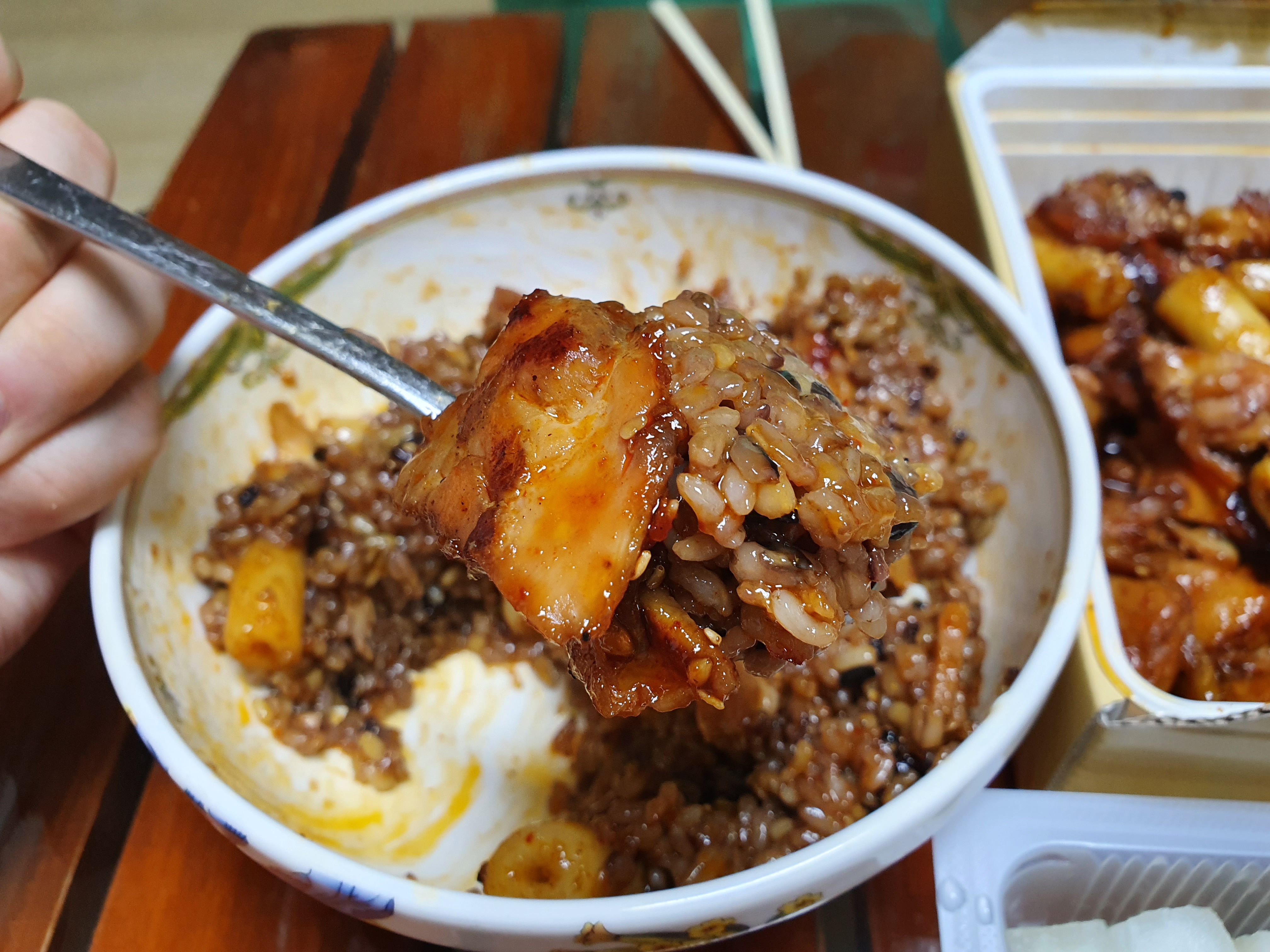 윤기 좔좔 너무 맛있어 보이지 않나요?ㅋㅋㅋㅋ 그냥 먹어도 맛있고 치킨을 올려 먹어도 맛있고 너무 맛있었어요.