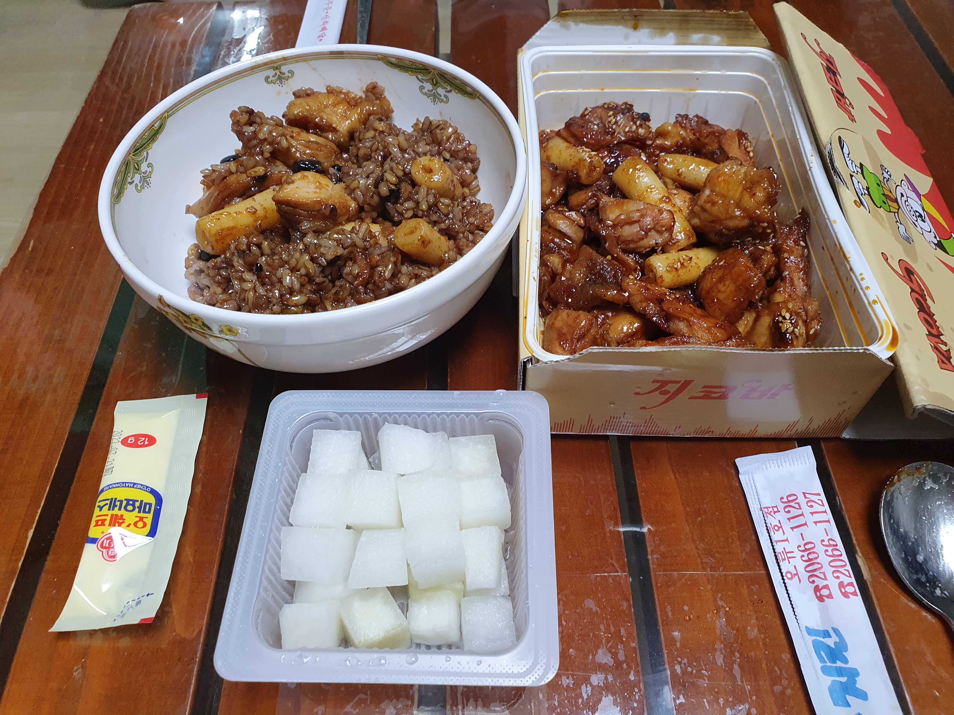 배달의민족 앱을 실행시켜 치킨을 검색해서 오류점 지코바에서 순살양념치킨을 주문했습니다. 요즘 인기가 많아서 그런지 대략 50~70분 걸리는 것 같았고, 이날은 50분 후에 도착했습니다. 순살양념치킨은 비닐에 포장되어 왔고 그 모습이 바로 위에 사진입니다.